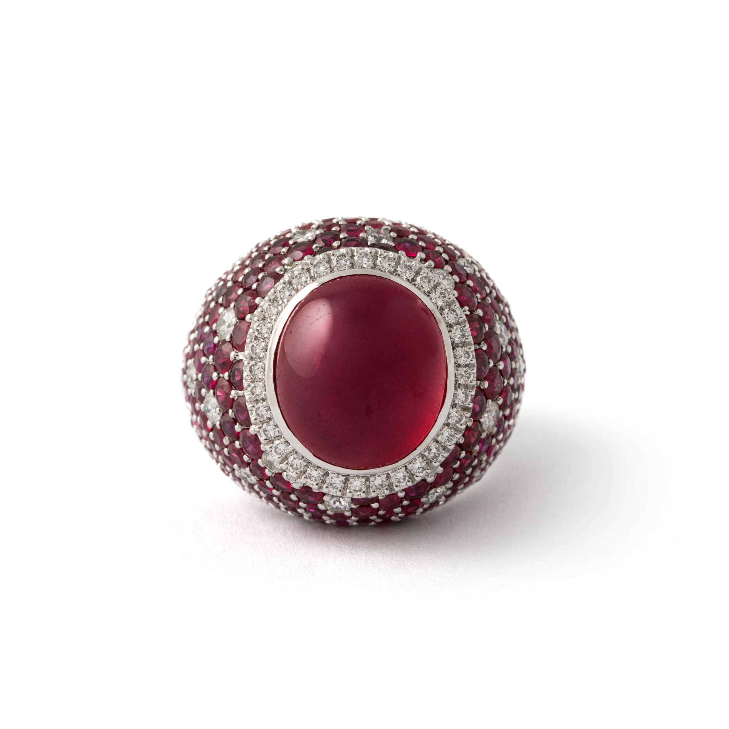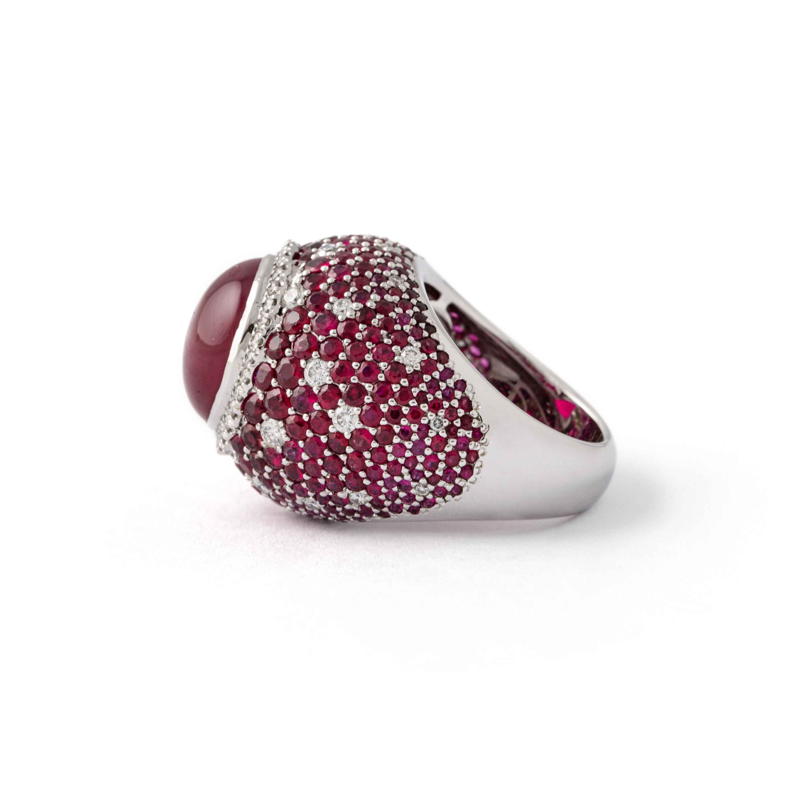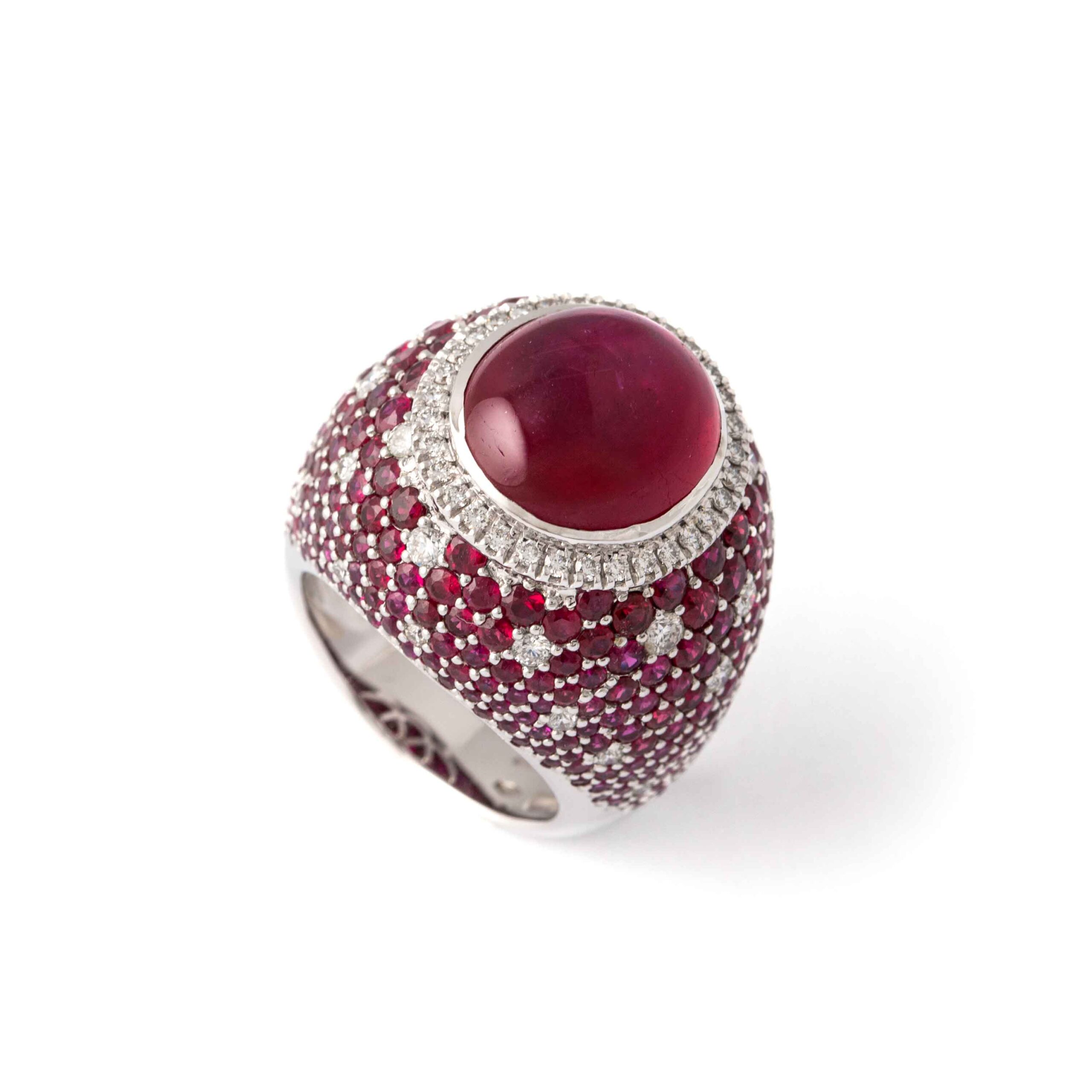 14.00 Carat Ruby Cabochon White Gold 18K Diamond Ring.