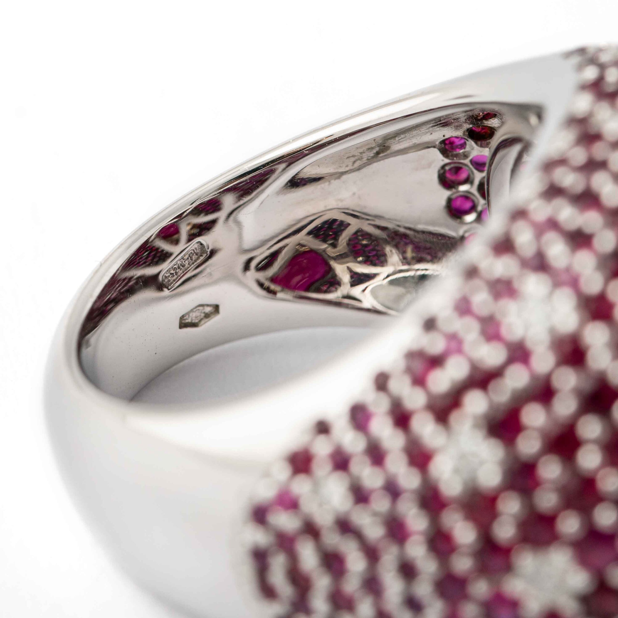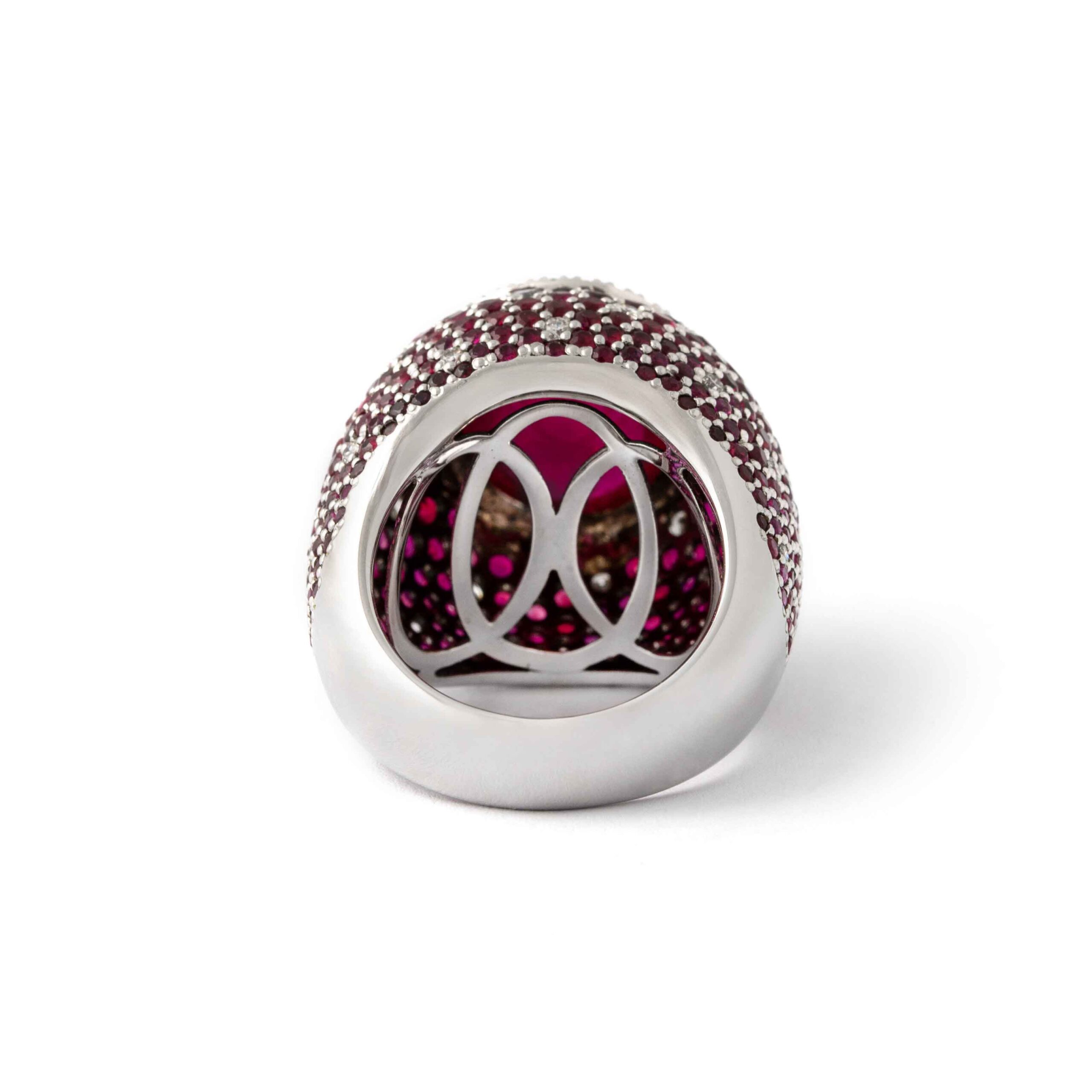 Discover timeless luxury with this breathtaking 14.00 carat ruby cabochon ring. Crafted in pristine 18K white gold and adorned with dazzling diamonds, this exquisite piece showcases a vibrant ruby at its center, making it a captivating addition to any jewelry collection. Perfect for those who appreciate elegance and refined beauty.