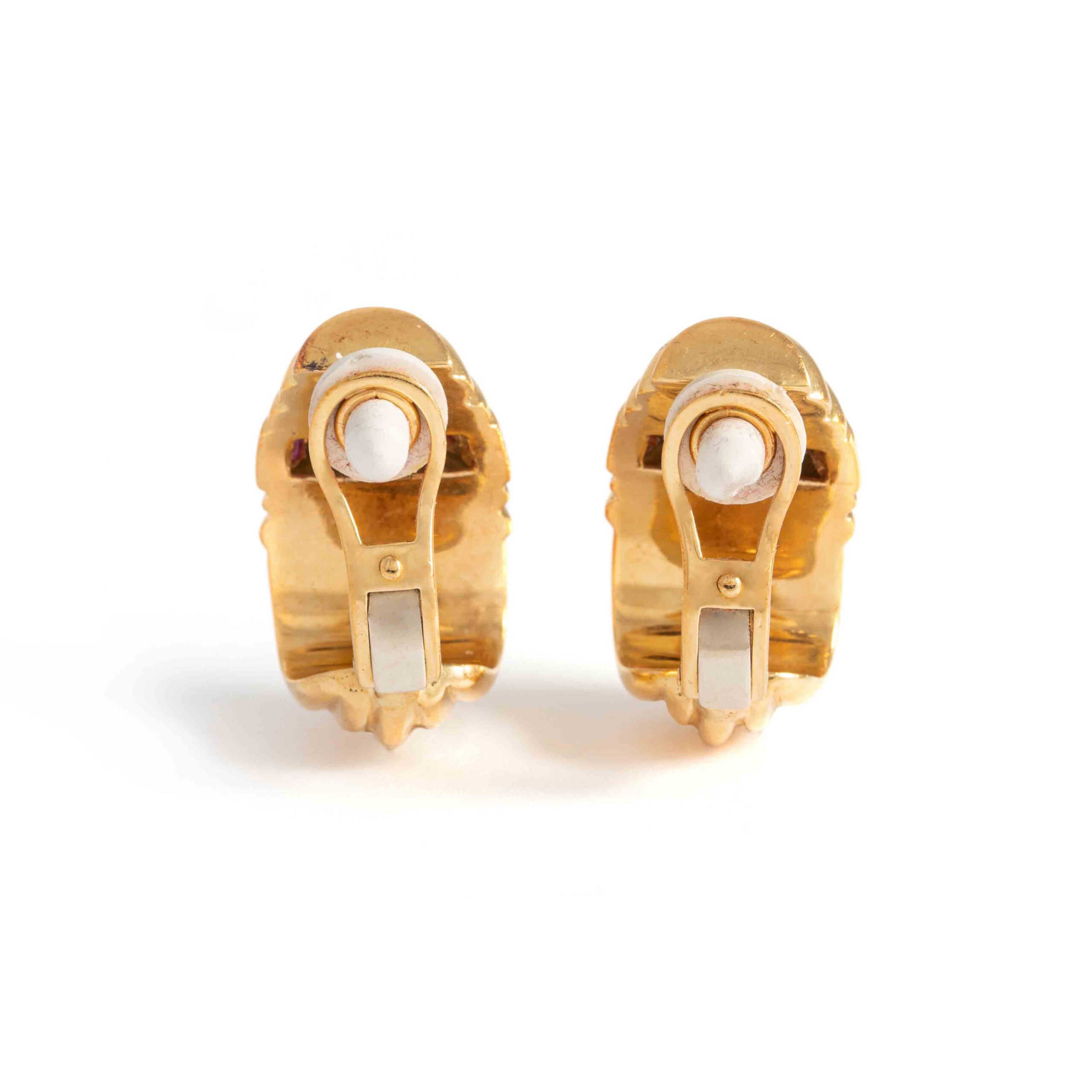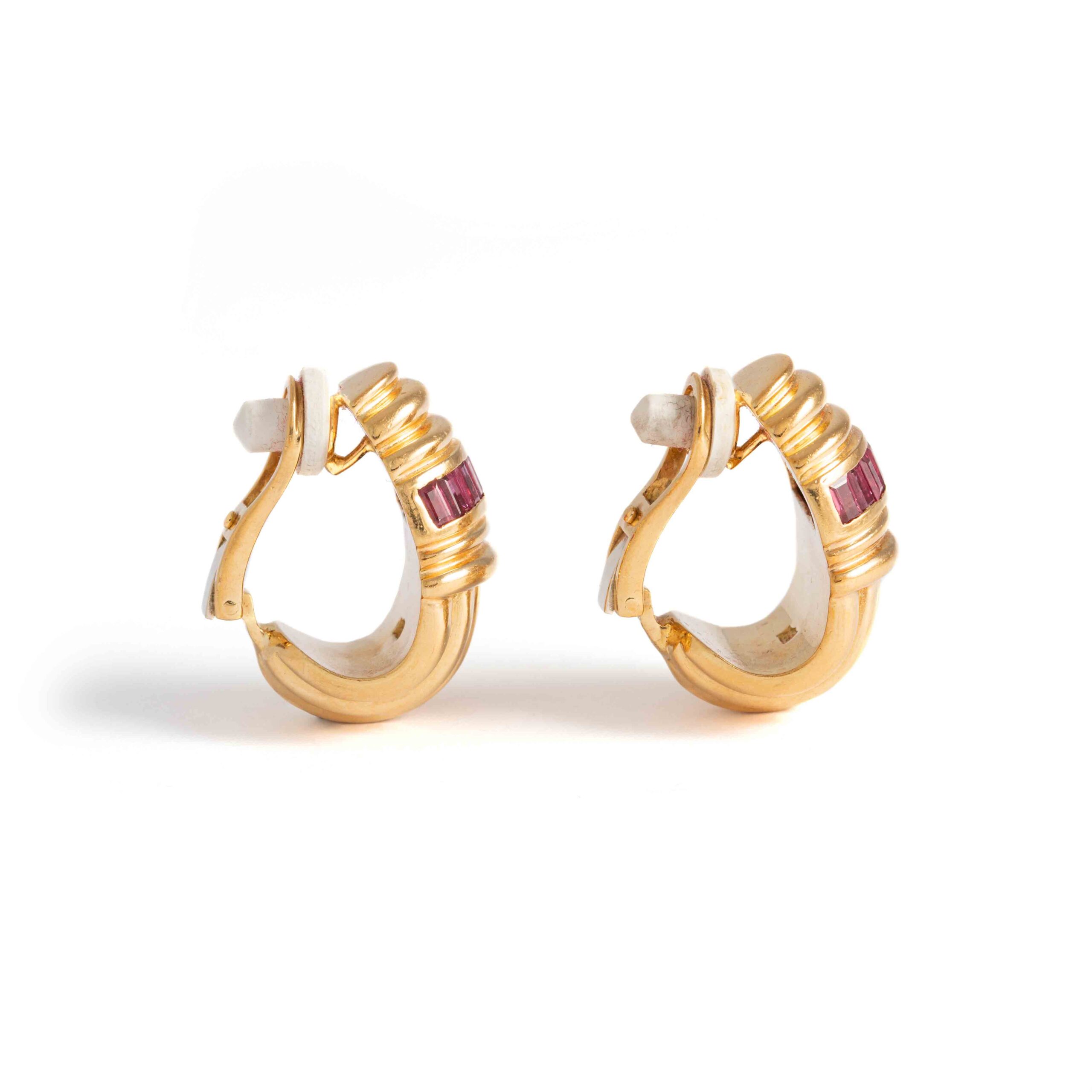 This charming pair of earrings features 18K yellow gold settings, each delicately adorned with calibrated red stones.
