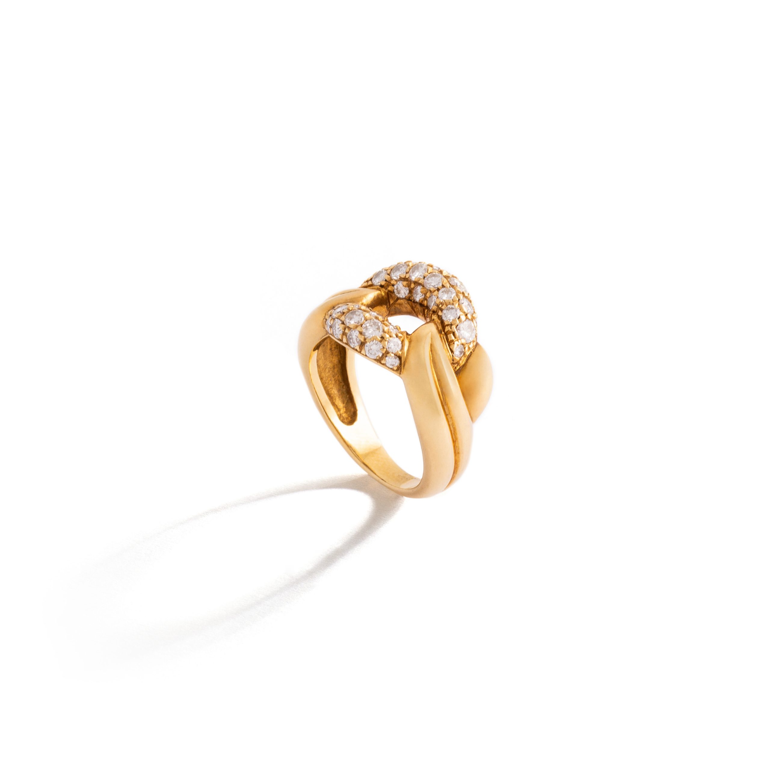 Crafted in yellow gold 18k 750, this ring exudes a warm and radiant glow. At the heart of this ring lies a magnificent round cut diamond, carefully selected for its exceptional brilliance and fire. The diamond’s round shape enhances its scintillating allure, allowing it to catch the light from every angle. This captivating gem is truly a sight to behold, adding a touch of glamour and sophistication to the entire design.