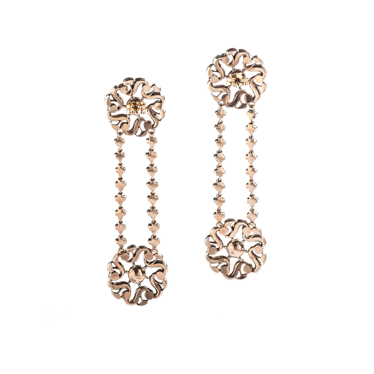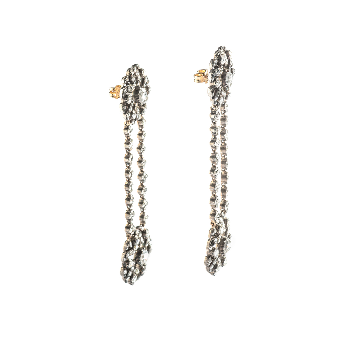 These exquisite ear pendants feature the timeless Rose cut diamonds, renowned for their unique and romantic allure. Each diamond has been meticulously faceted to showcase its natural beauty, creating a stunning interplay of light and sparkle. The diamonds are delicately set on a backdrop of silver and gold, enhancing their brilliance and adding a touch of warmth to the overall design.
