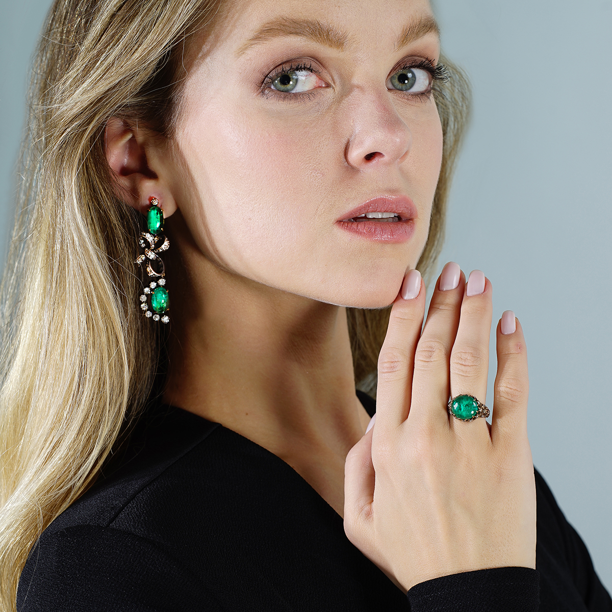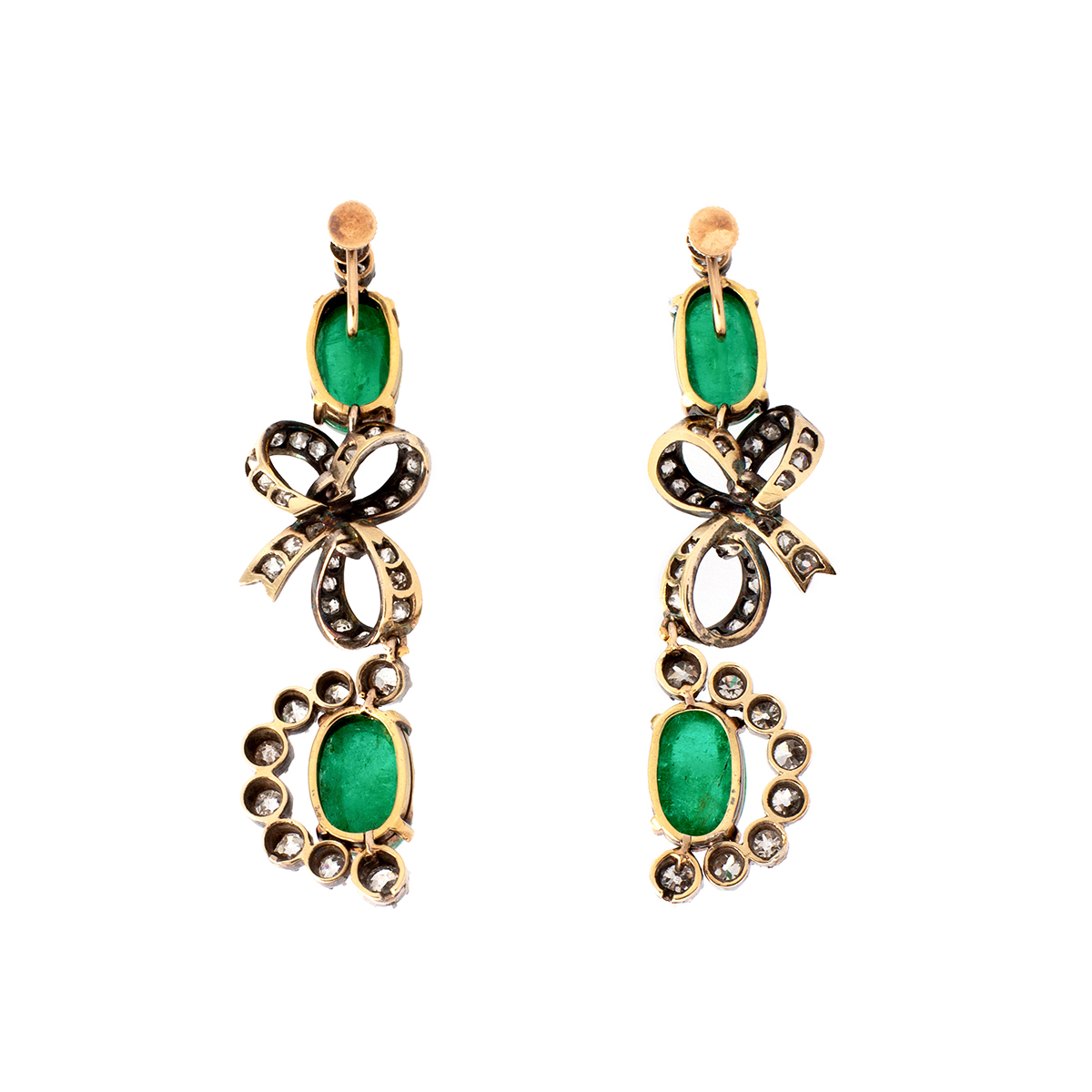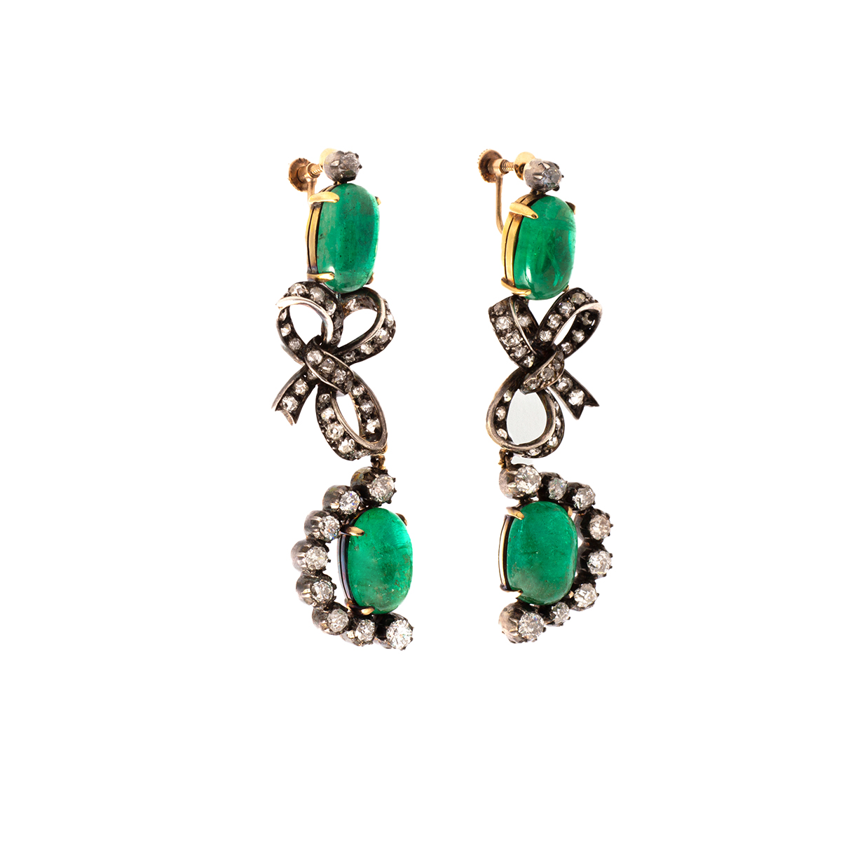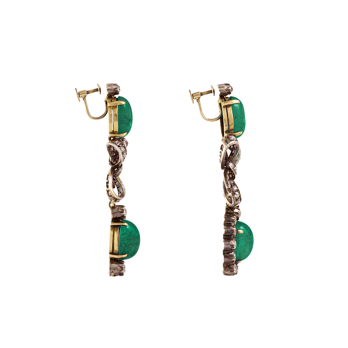 Antique Cabochon Emerald Earrings surrounded by Old-mine cut diamond on silver and yellow gold.