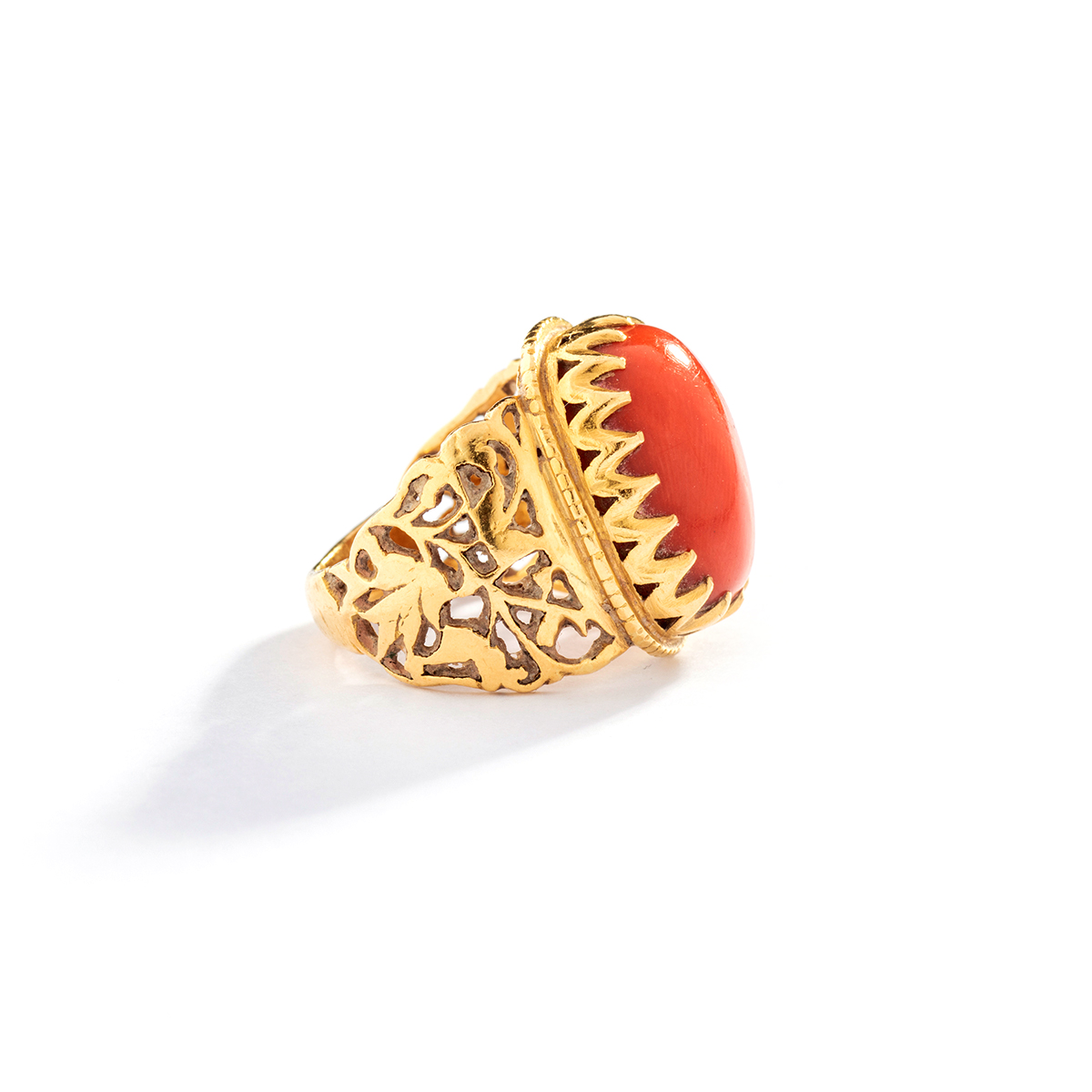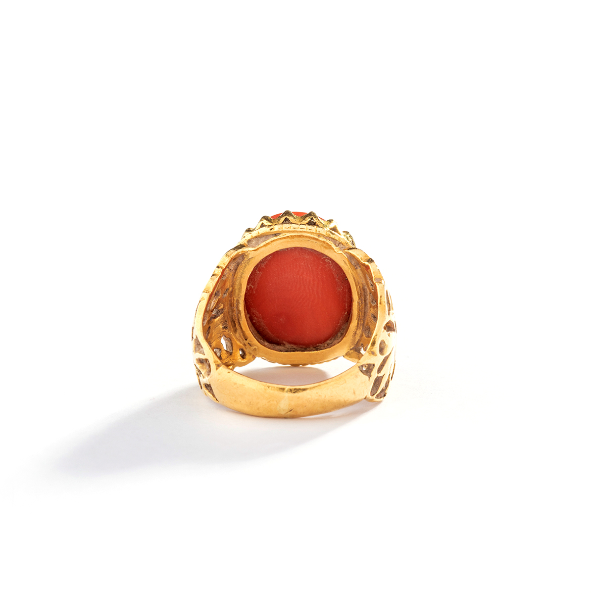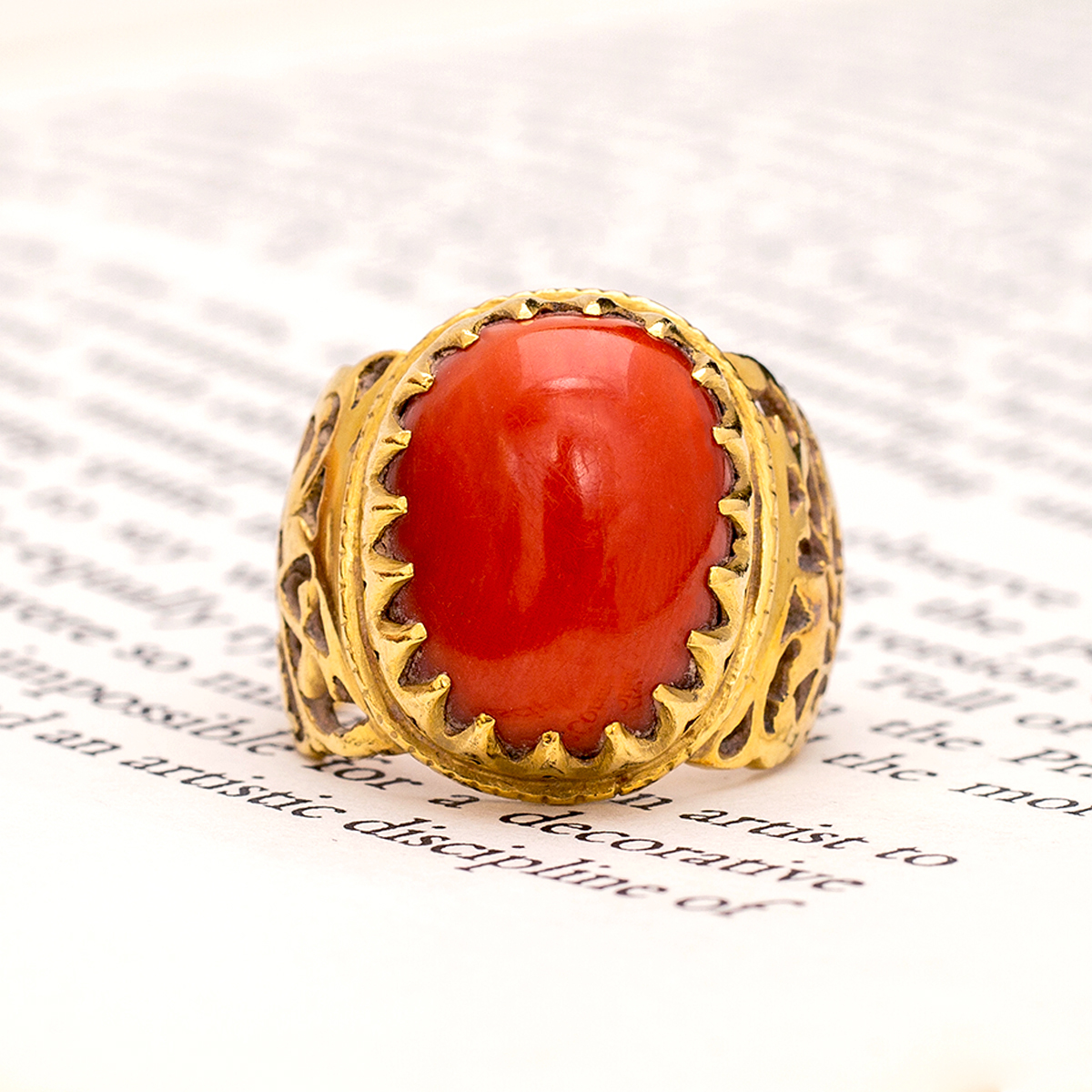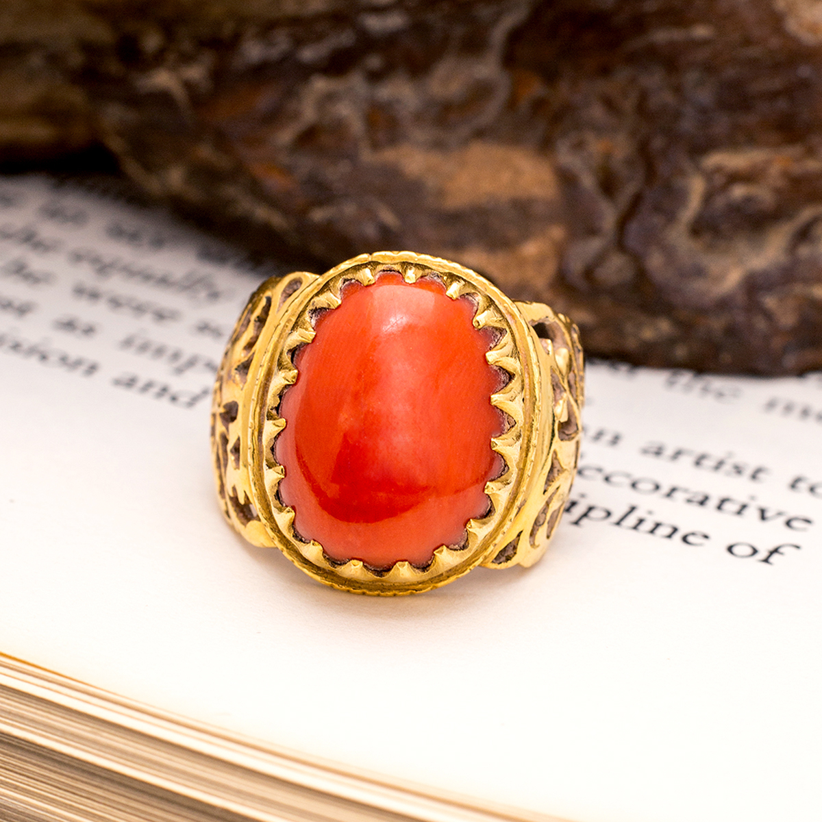 Antique Etruscan Revival yellow Gold 18k Ring centered by a cabochon coral. Early 20th Century.