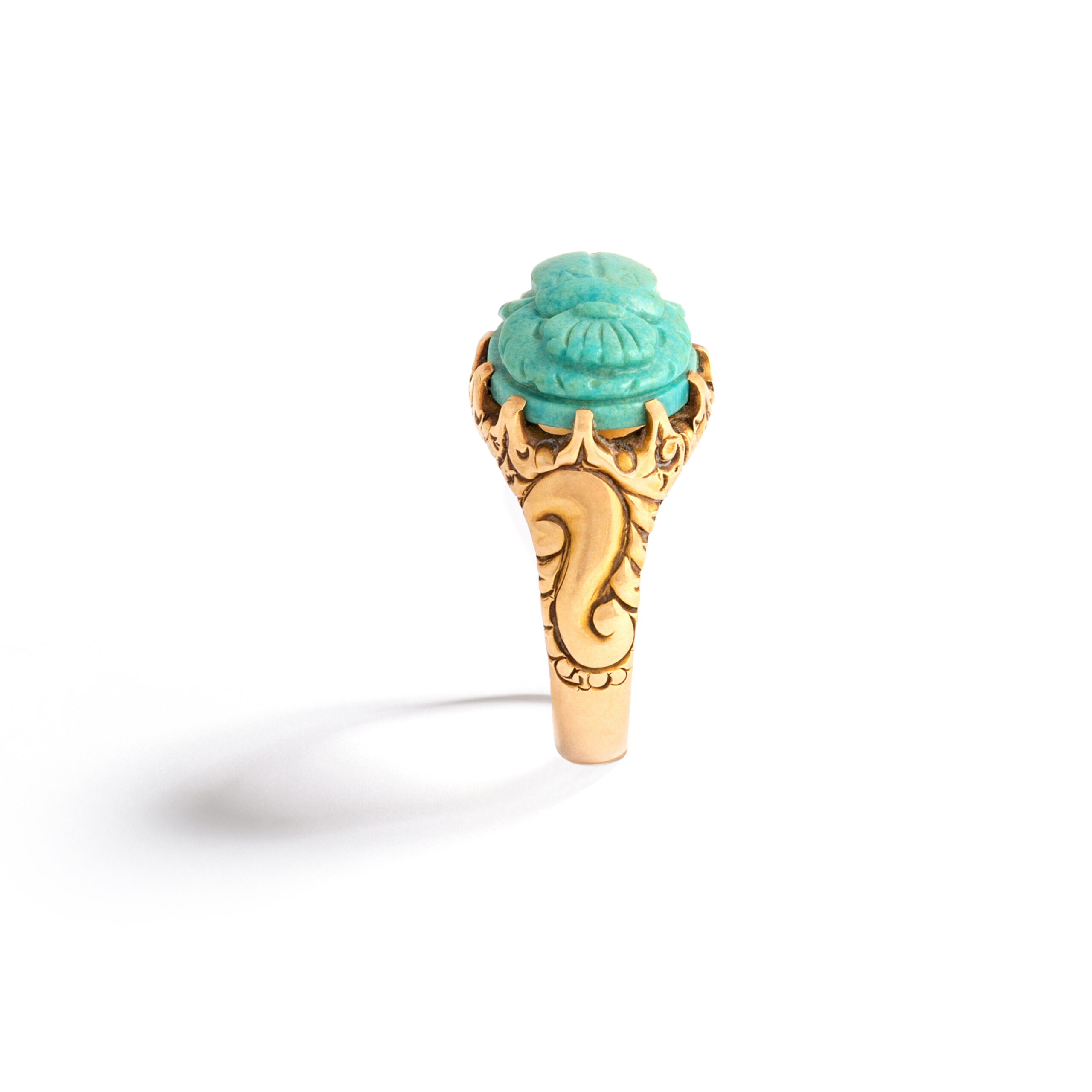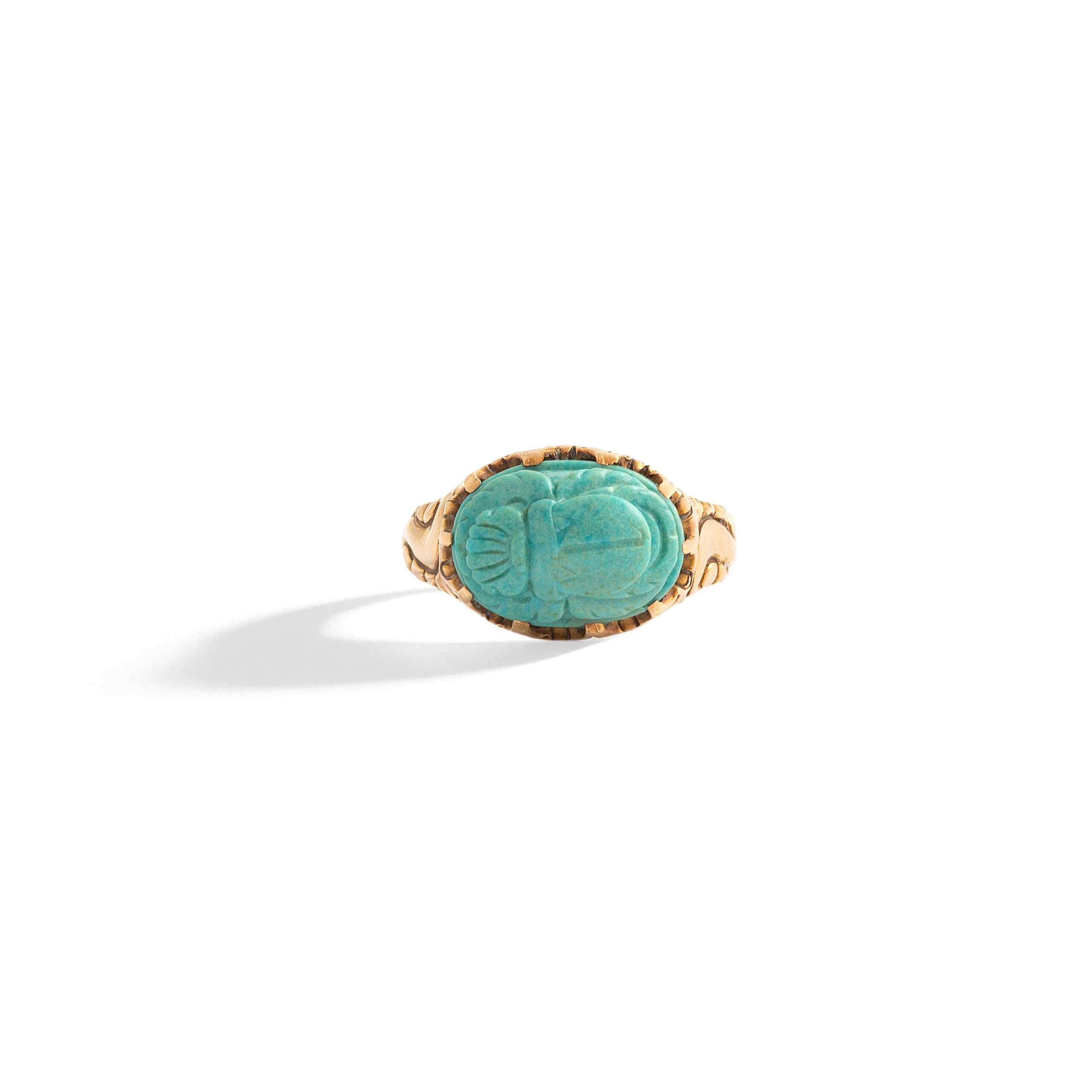 Antique turquoise beetle shape on yellow gold ring. In the style of baroque.