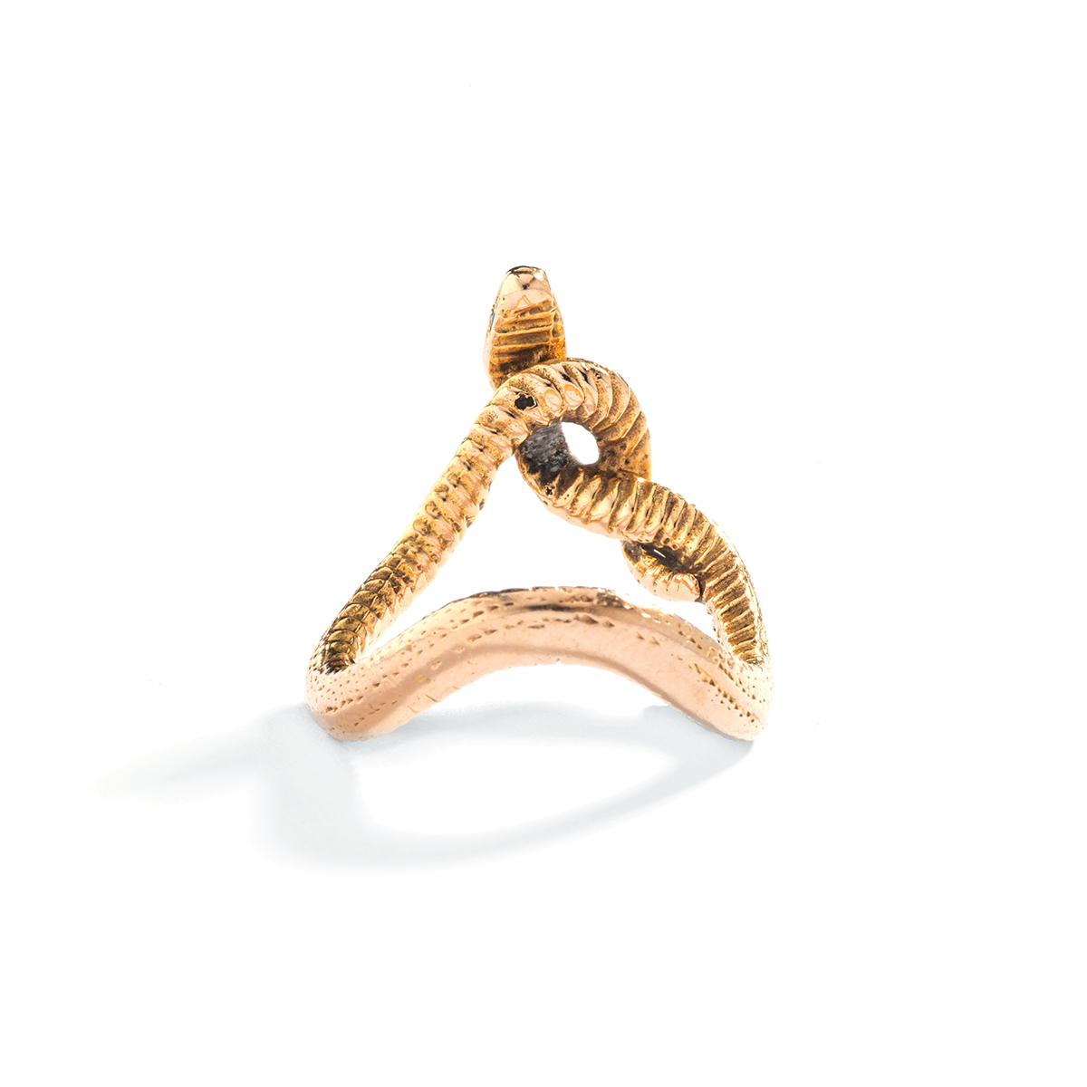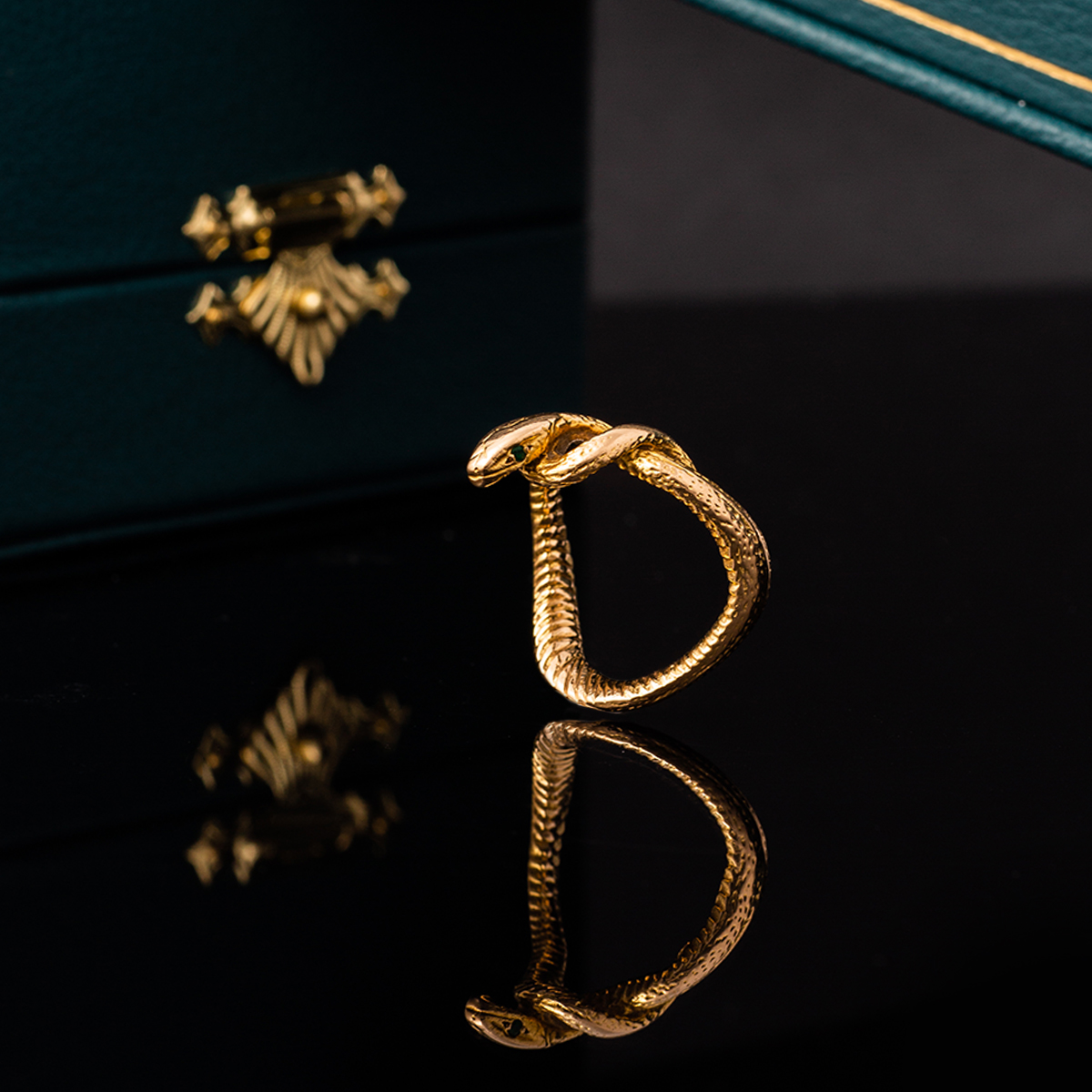 Antique Yellow Gold Snake Ring. Yellow Gold Ring overall engraved modeled as a snake. With emerald eyes. Early 20th Century.