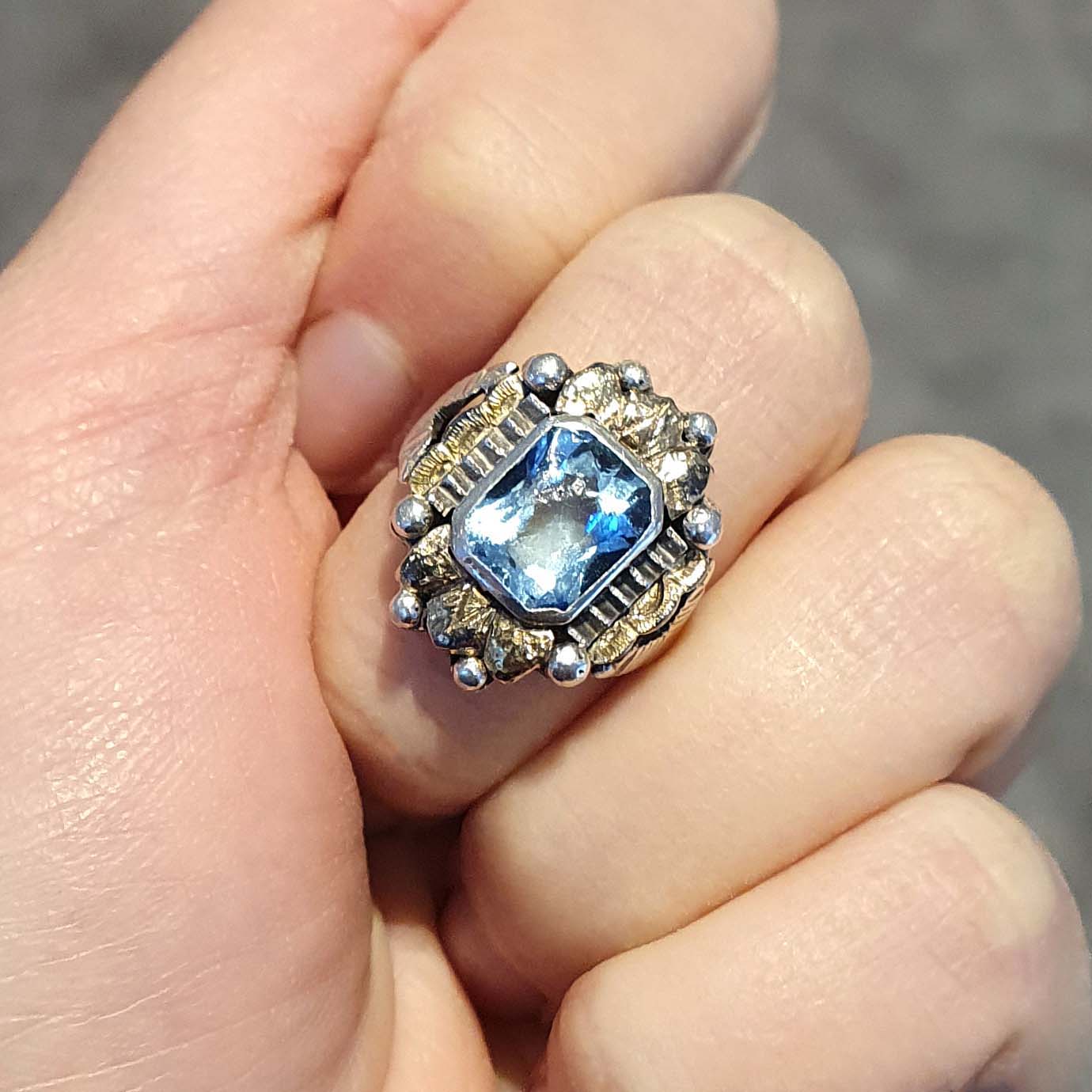 The aquamarine gemstone, known for its serene blue hue, adds a touch of tranquility and sophistication to the ring. Its unique color and clarity make it a standout feature of this vintage piece.