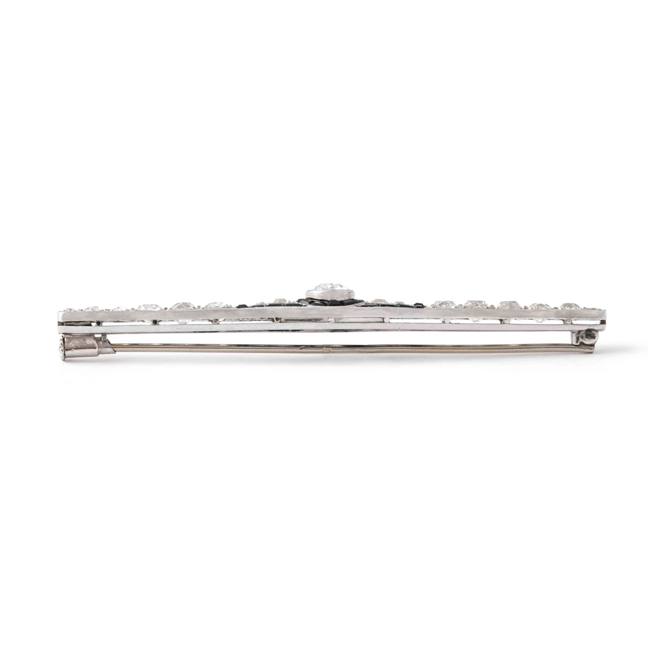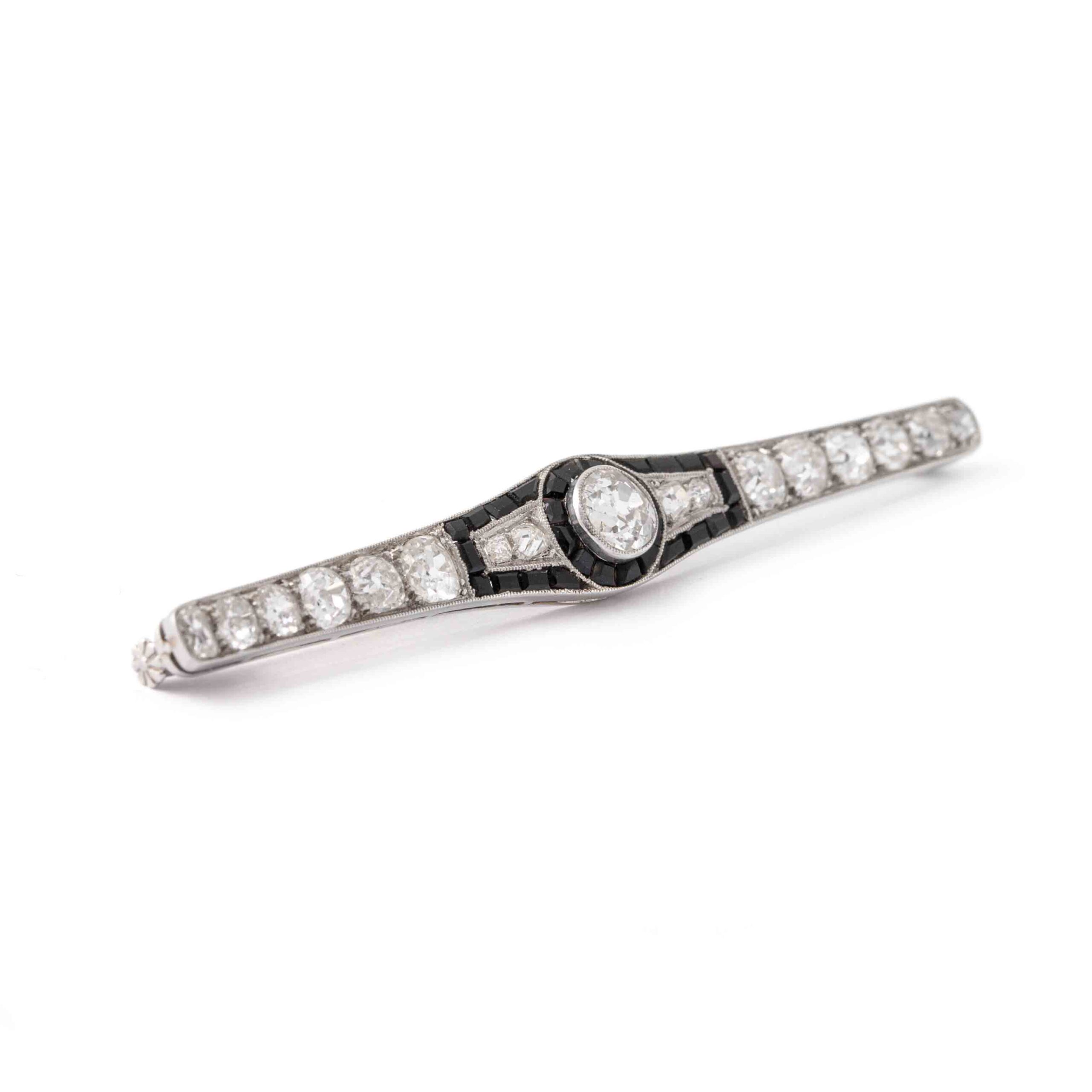 Art Deco Old mine cut Diamond and Onyx on Platinum and Gold Barrette Brooch. Circa 1930.