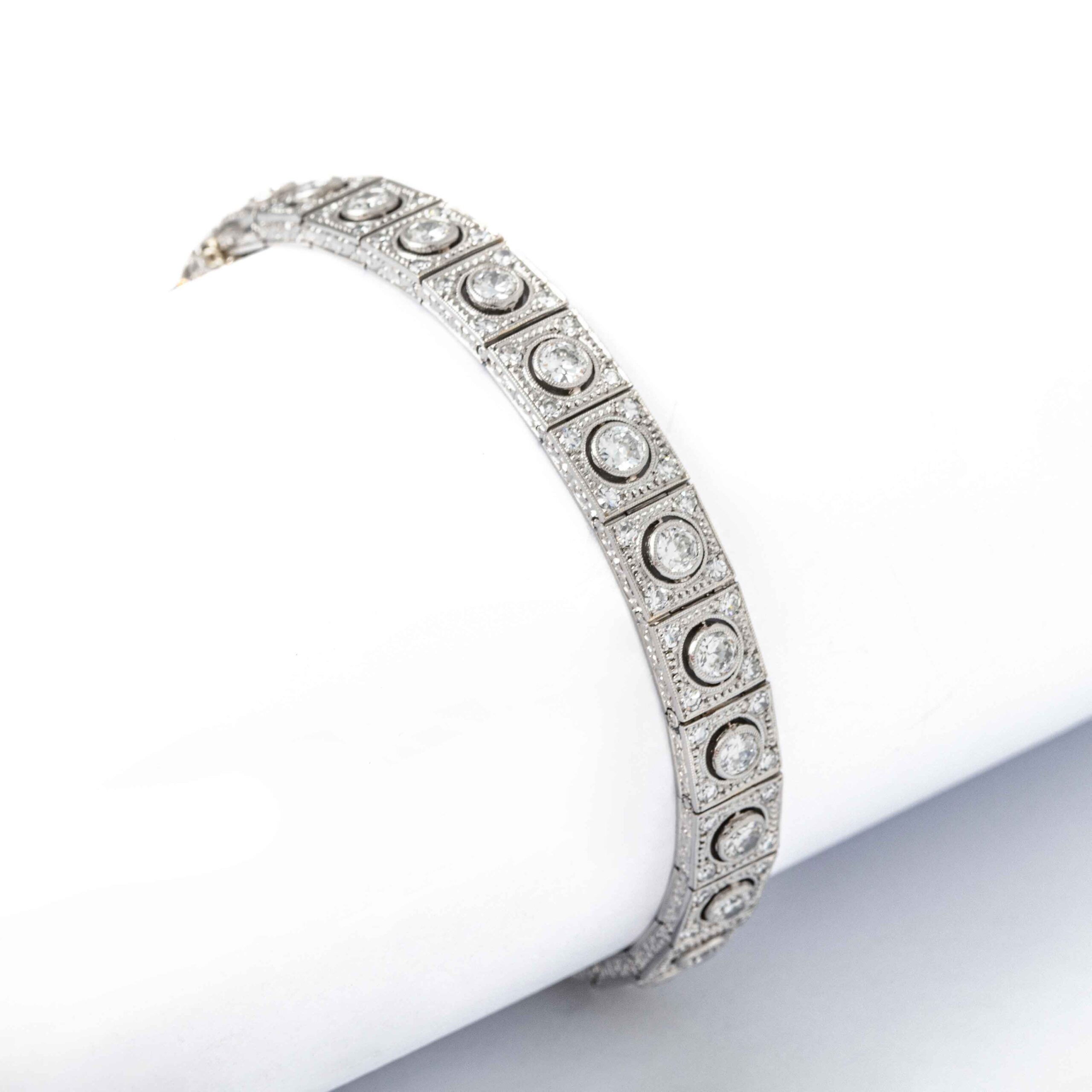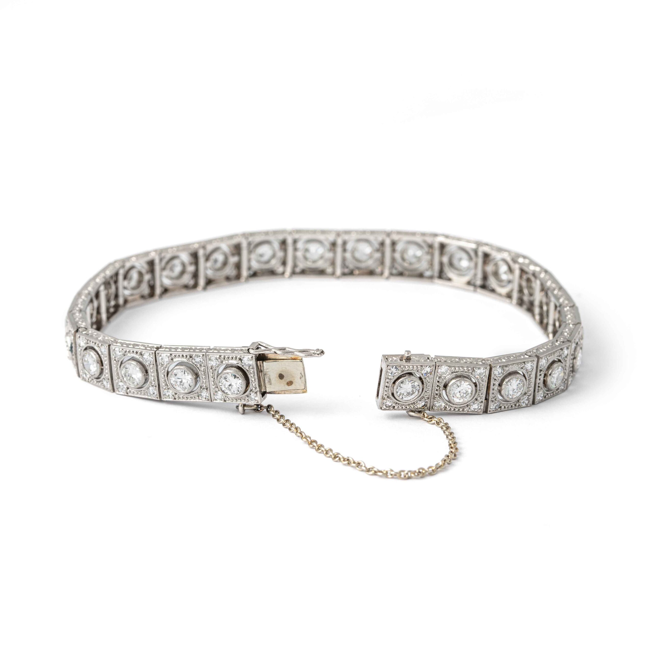This elegant Art Deco bracelet is crafted in platinum and adorned with a series of sparkling diamonds. The geometric design and intricate detailing reflect the sophisticated and glamorous style of the Art Deco era, making it a timeless and luxurious accessory.