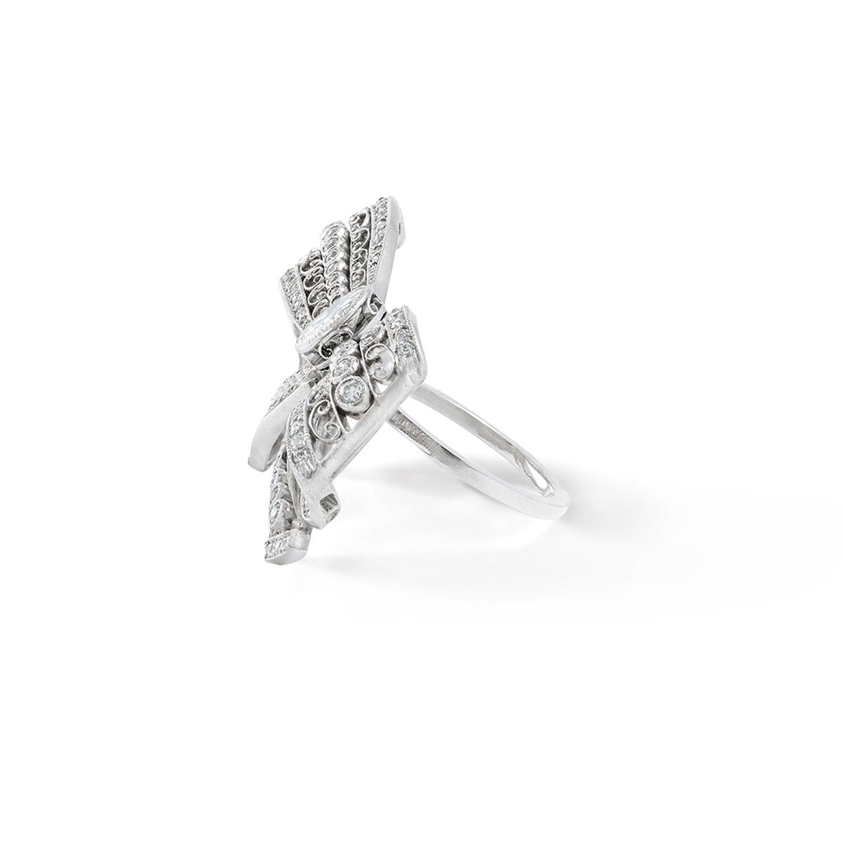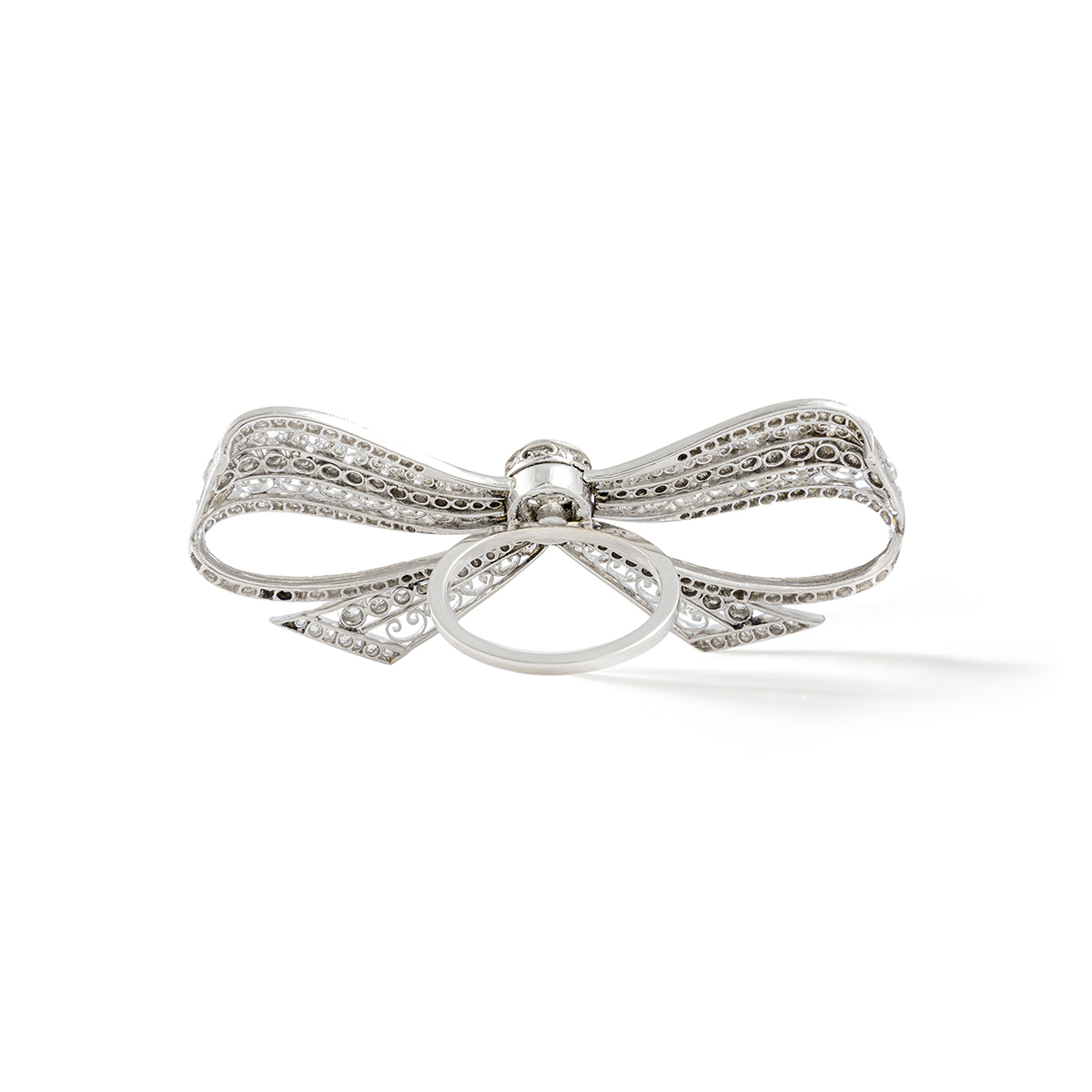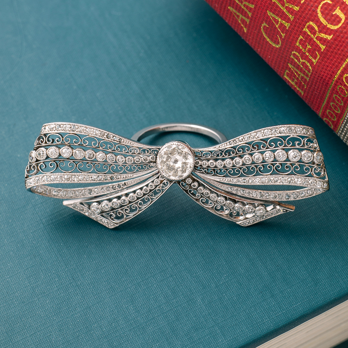 Introducing a truly exquisite piece, the Platinum and old mine diamond bow ring. This stunning ring showcases the timeless elegance of lace, beautifully reimagined in a bow design. Crafted with the finest platinum, this ring is a true statement of luxury.