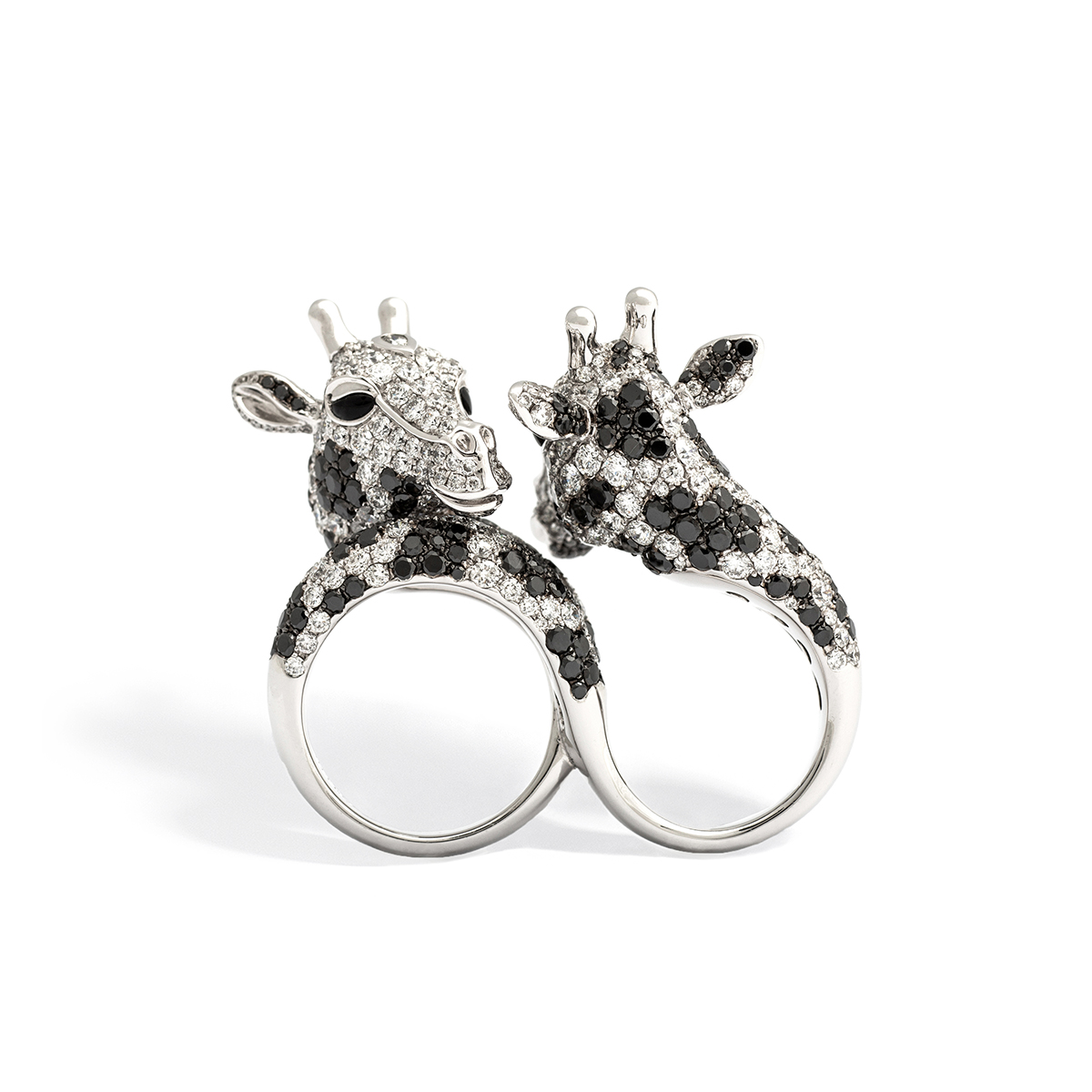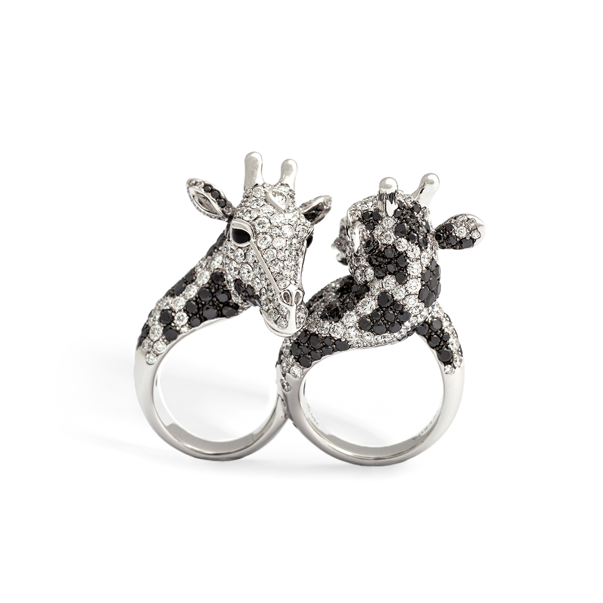 Vous et Moi Giraffes Black and White Diamonds on Gold Ring. 415 White Diamonds 8.02 carats, 268 Black Diamonds 6.91 carats, 4 Onyx 0.19 carat and 2 Diamonds 0.12 carat.