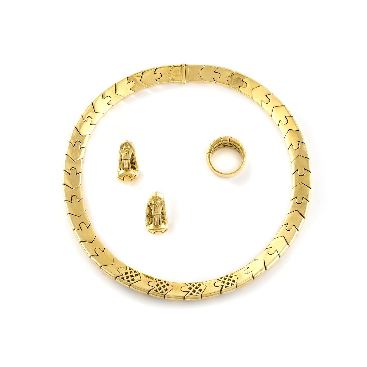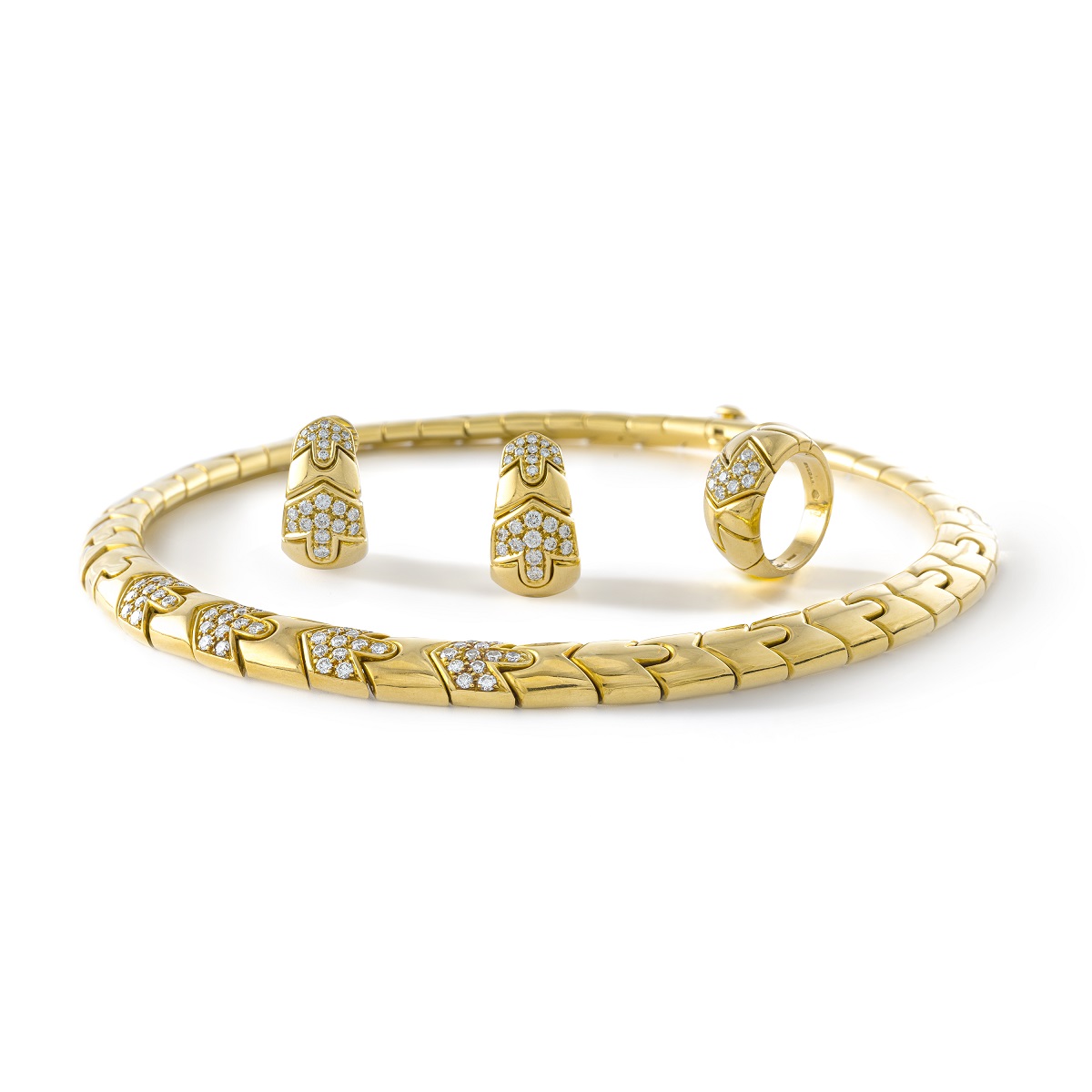 Bulgari Diamond and Gold Set composed of a necklace, earrings and a ring. Signed Bulgari, numbered and marked. Original Bulgari box.