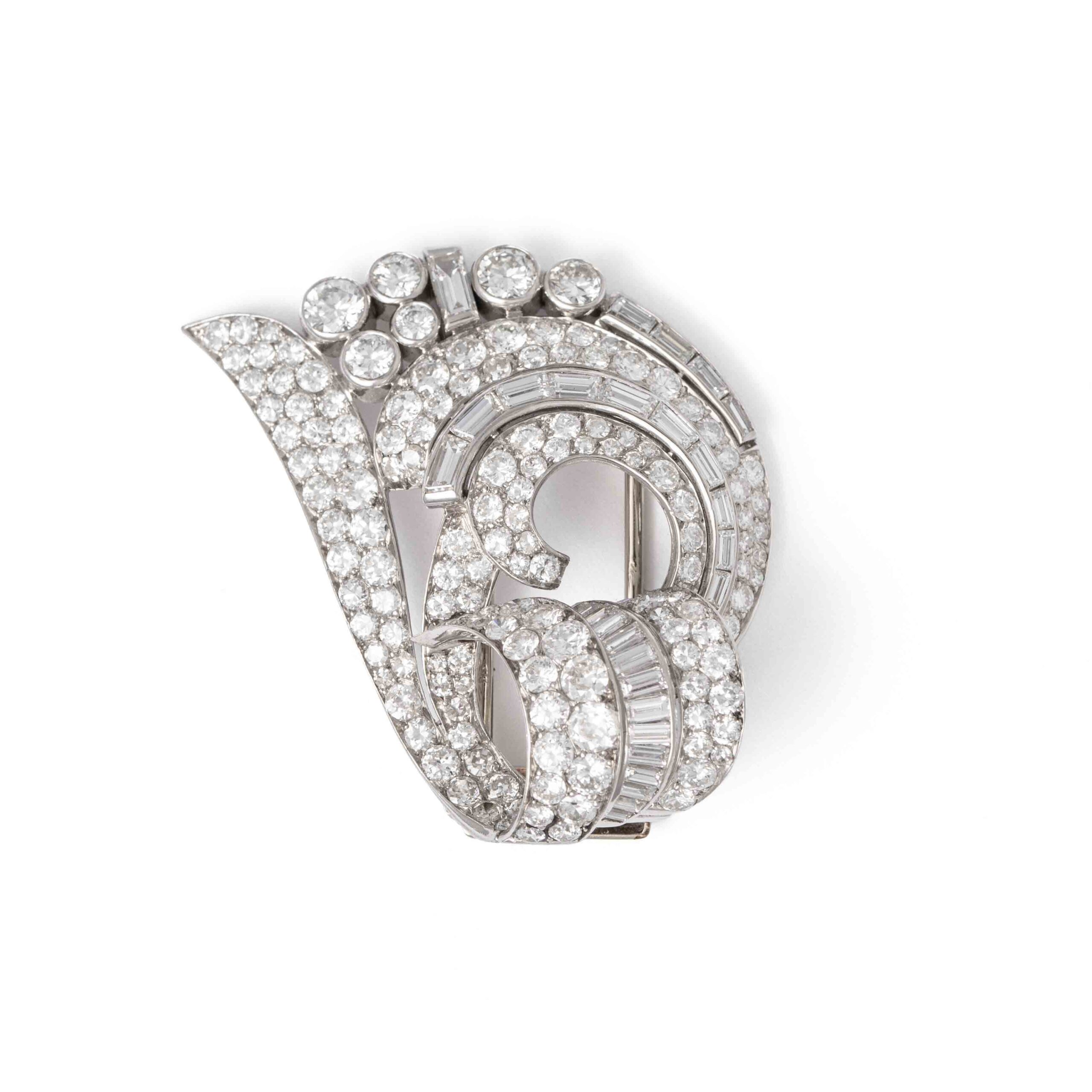 The Cartier Diamond and Platinum Clip Brooch is a stunning piece of jewelry crafted with exquisite attention to detail.