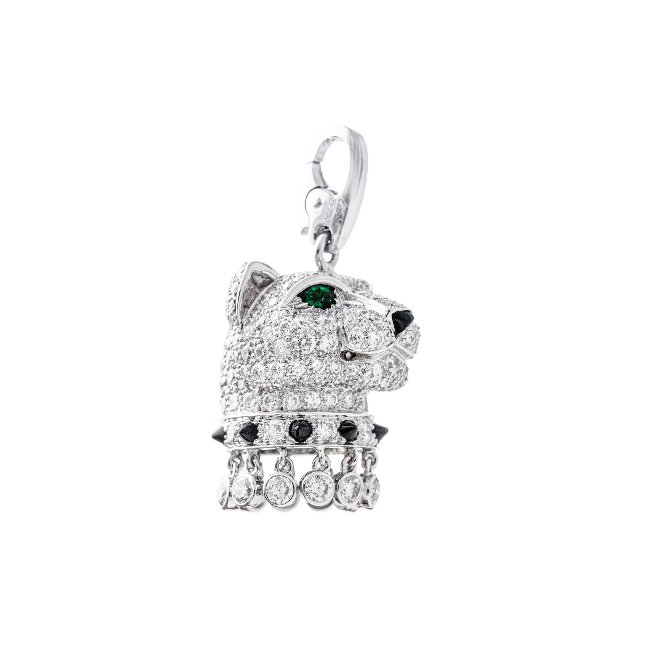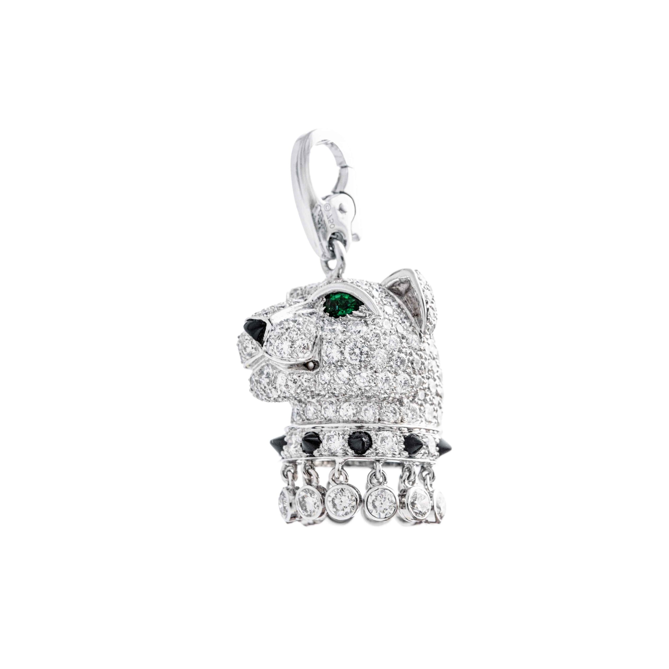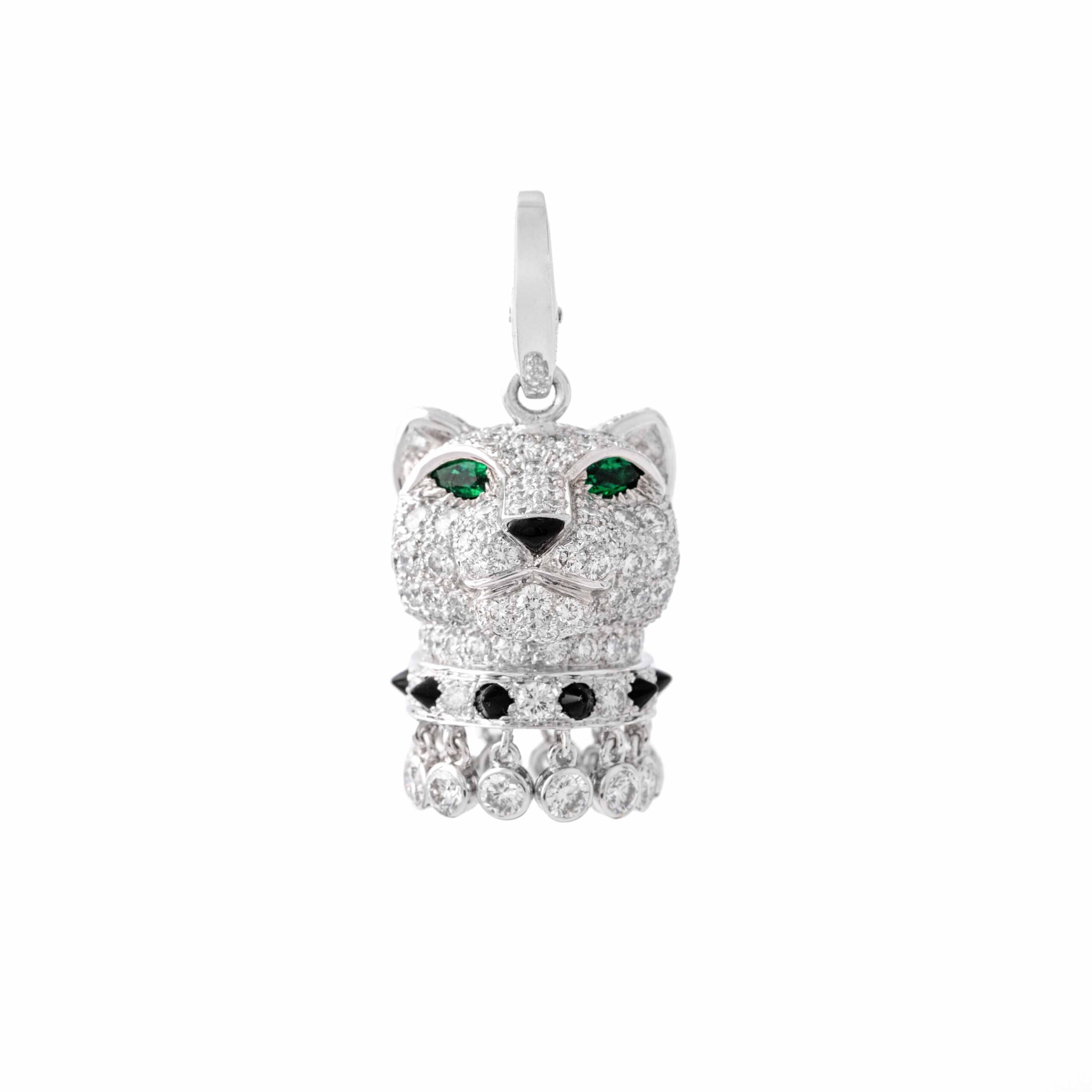 18k White Gold Diamond Emerald Onyx Panthere de Cartier Panther Head Pendant by Cartier.