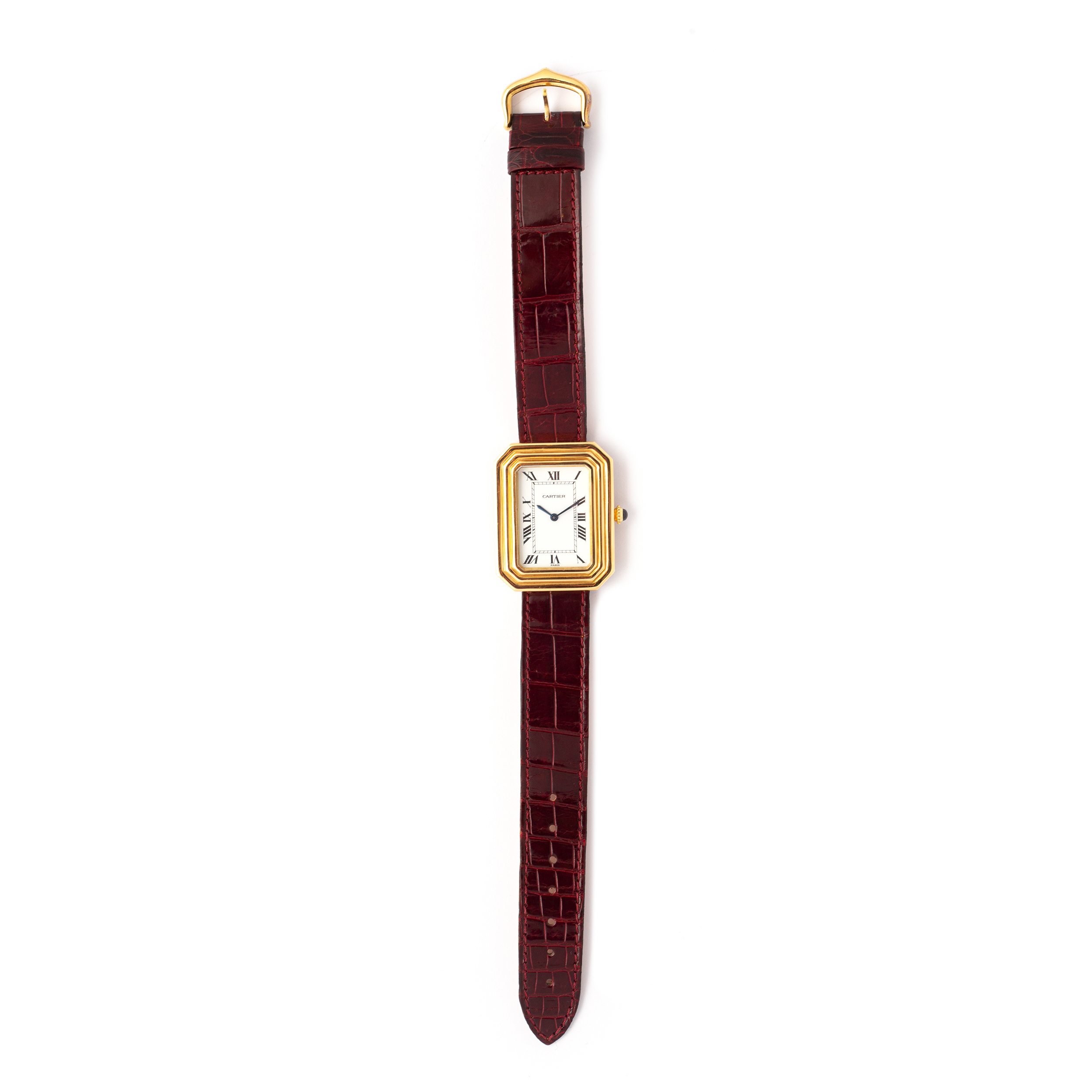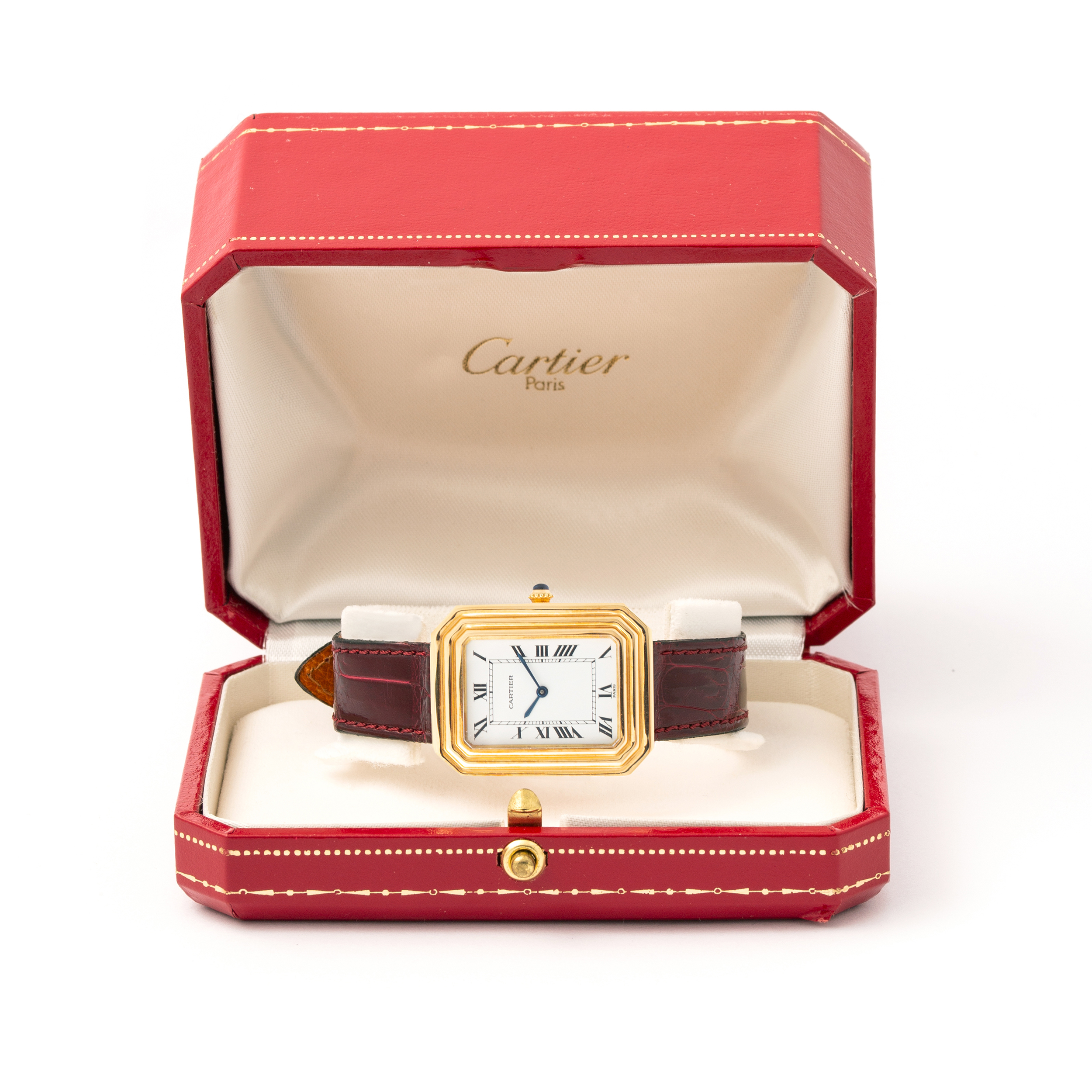 Cartier fine 18K yellow gold rectangular manual winding wristwatch. Le Must de Cartier bracelet with plated clasp. Signed Cartier PARIS. French and Swiss Marks. Numbered 780960786. Original Cartier Box and Document.