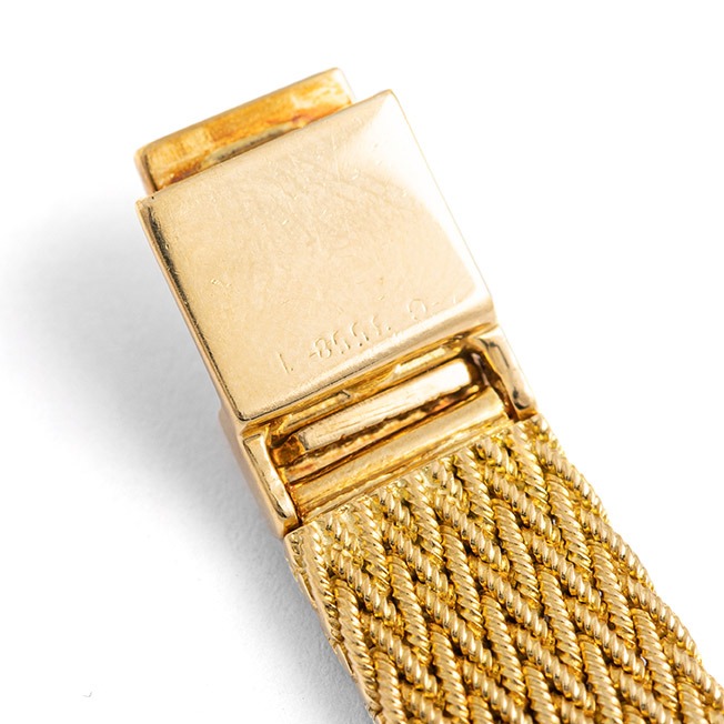 The watch features a captivating design, with round cut and baguette-cut diamonds meticulously pave set throughout. The combination of these exquisite diamonds and the warm glow of the 18K yellow gold case gives the timepiece a distinctive and opulent allure.