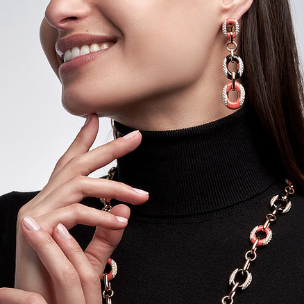 Earrings in 18kt pink gold set with 224 diamonds 3.34 cts, 7 coral and 7 onyx 7.12 cts