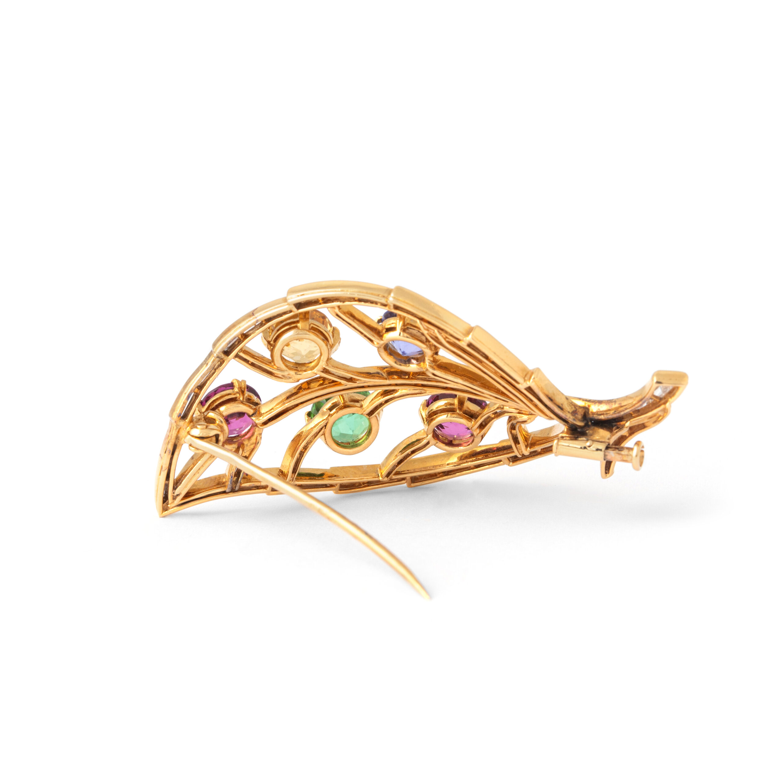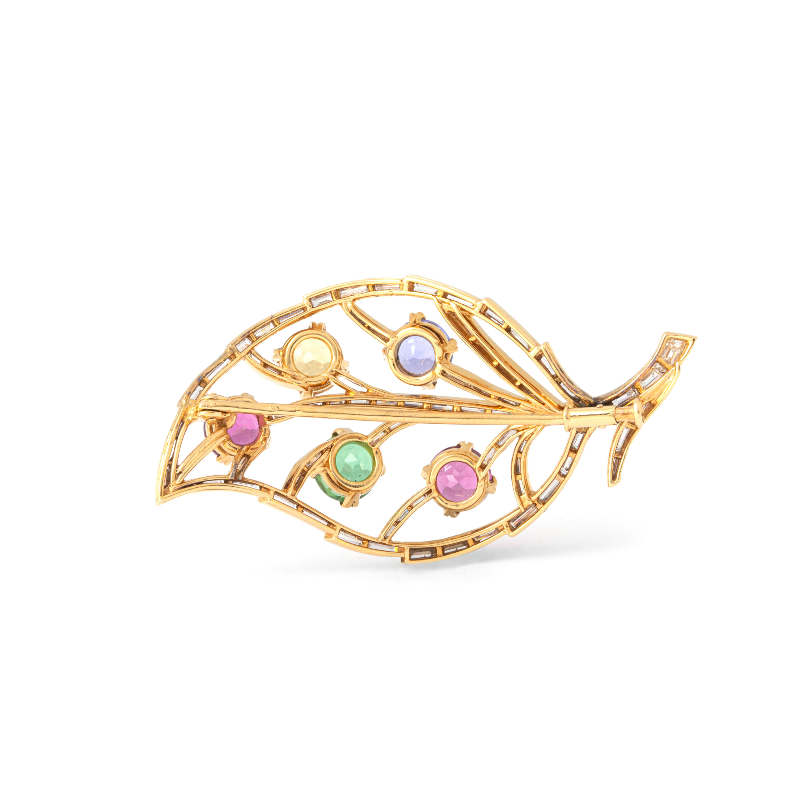 Diamond and Gemstone Leaf Brooch set on a bed of gold and platinum. This exquisite piece of jewelry showcases the timeless beauty of nature in an elegant and artistic manner.