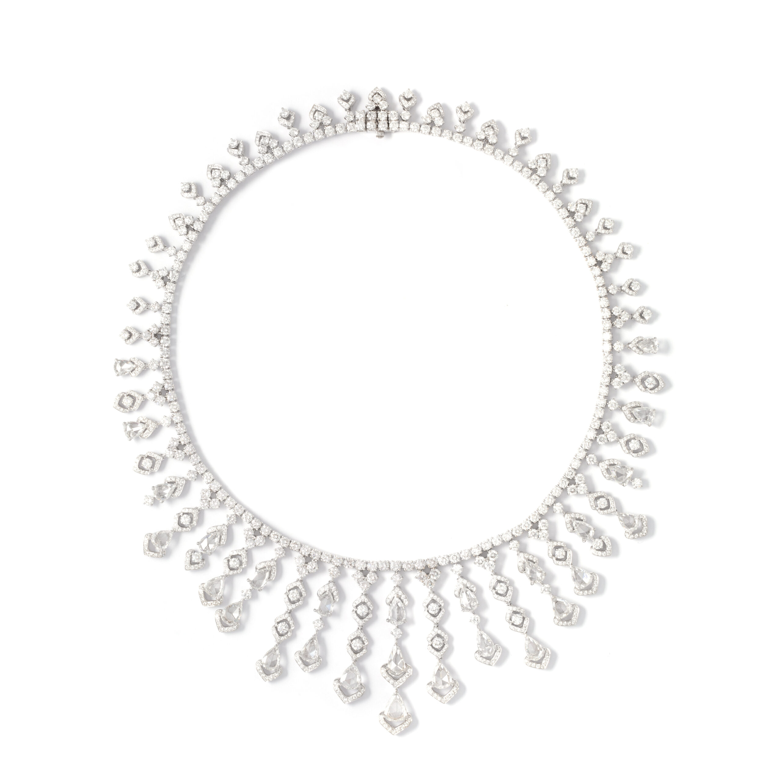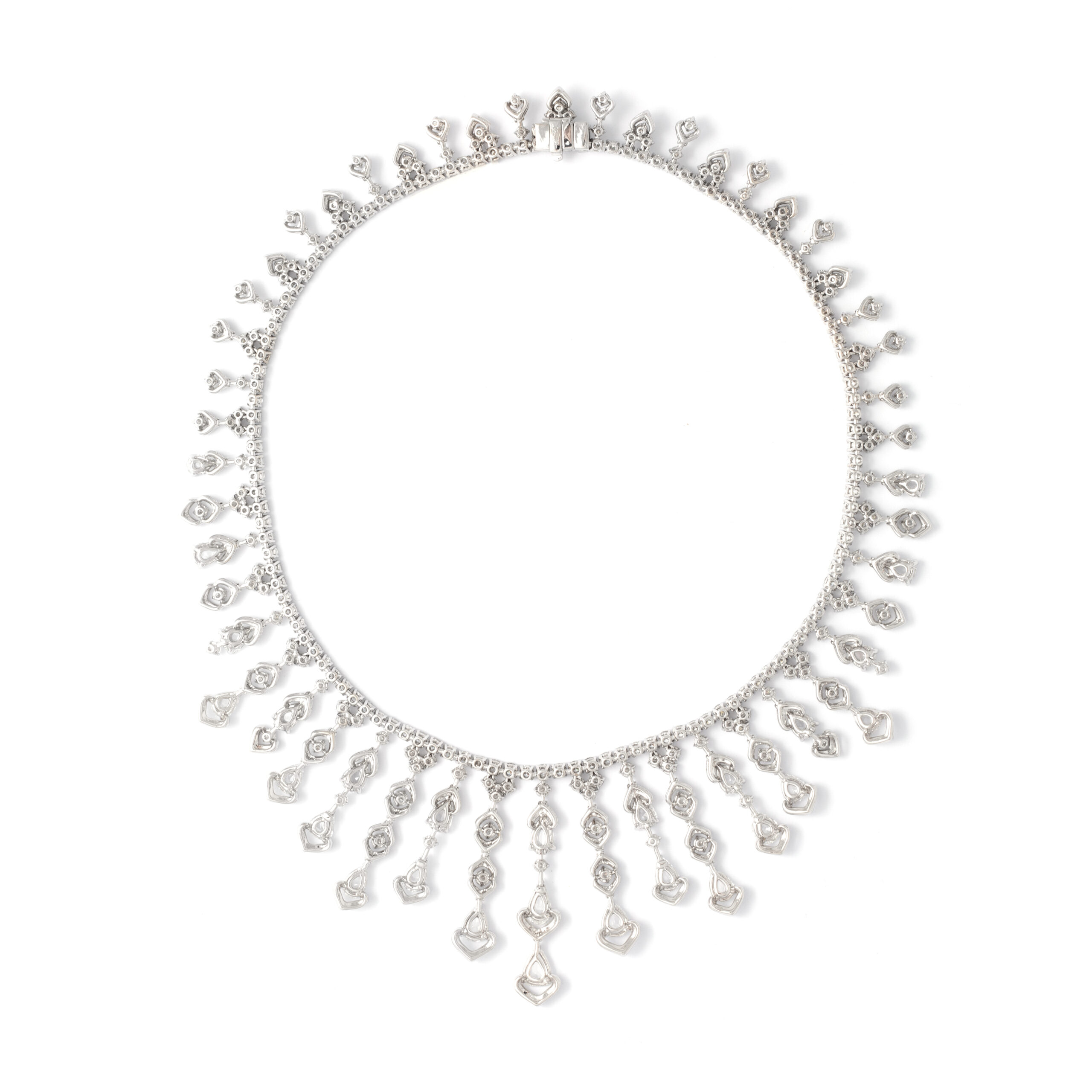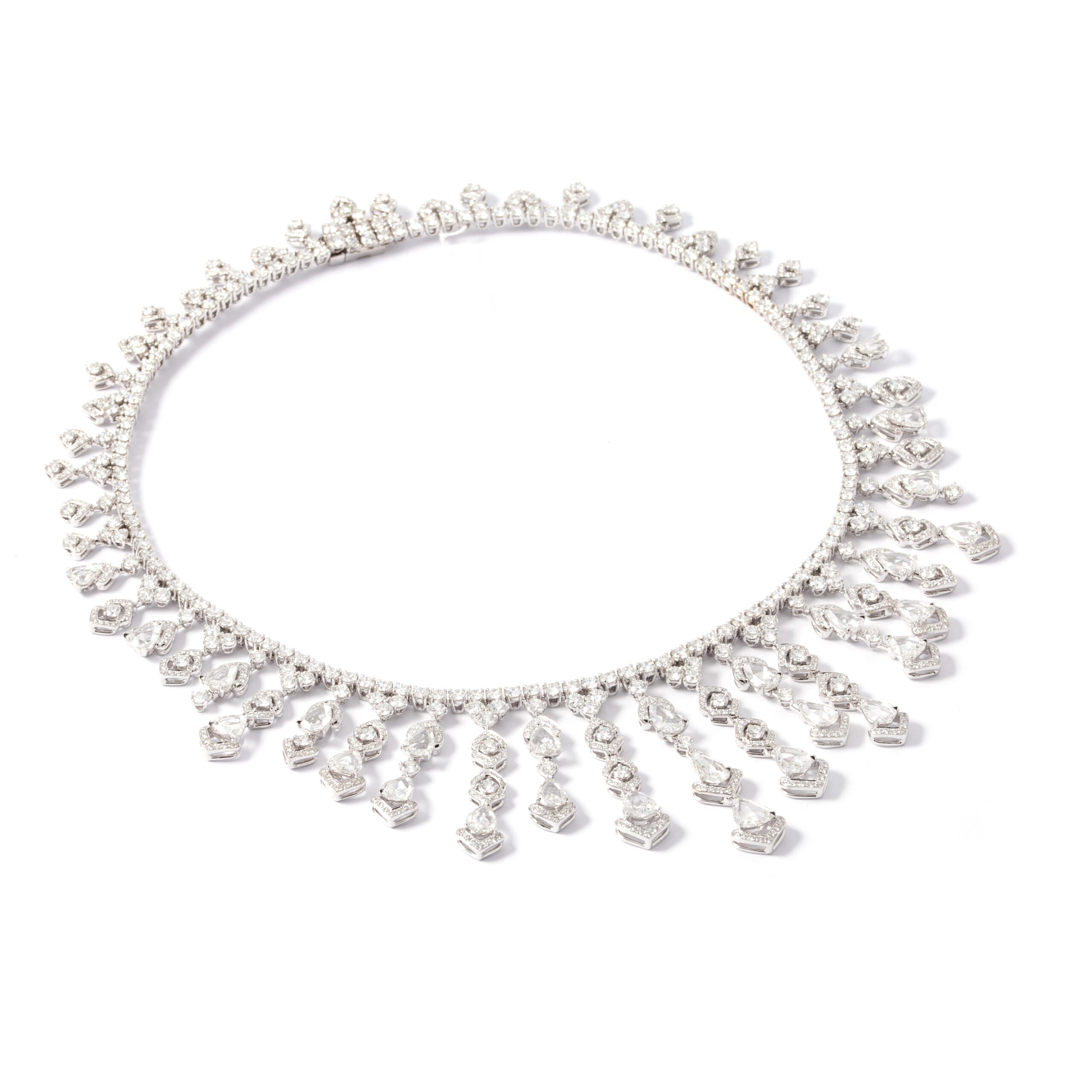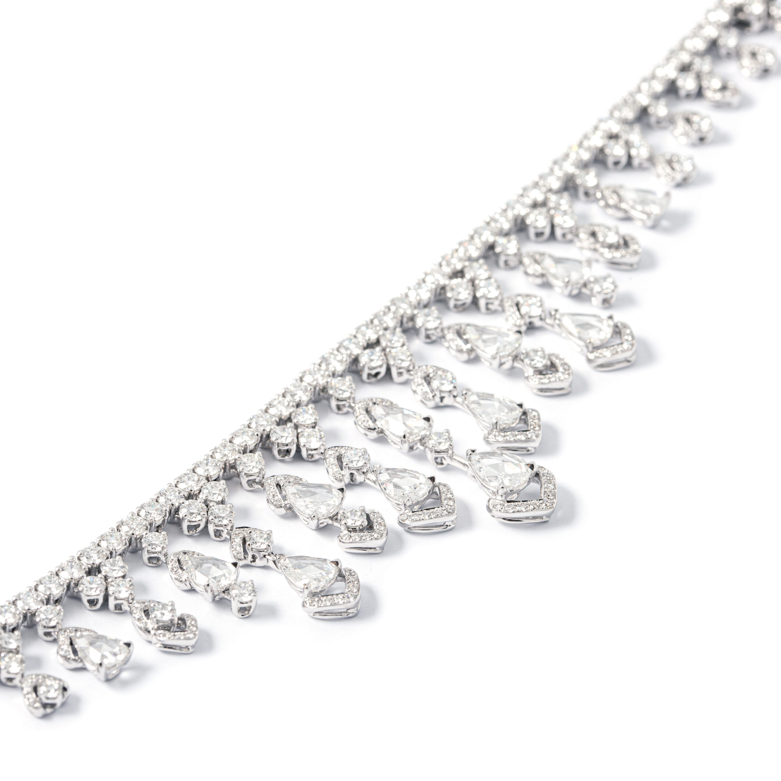Necklace in 18kt white gold set with 27 pear-shaped rose cut diamonds 12.88 cts and 904 diamonds 26.10 cts.