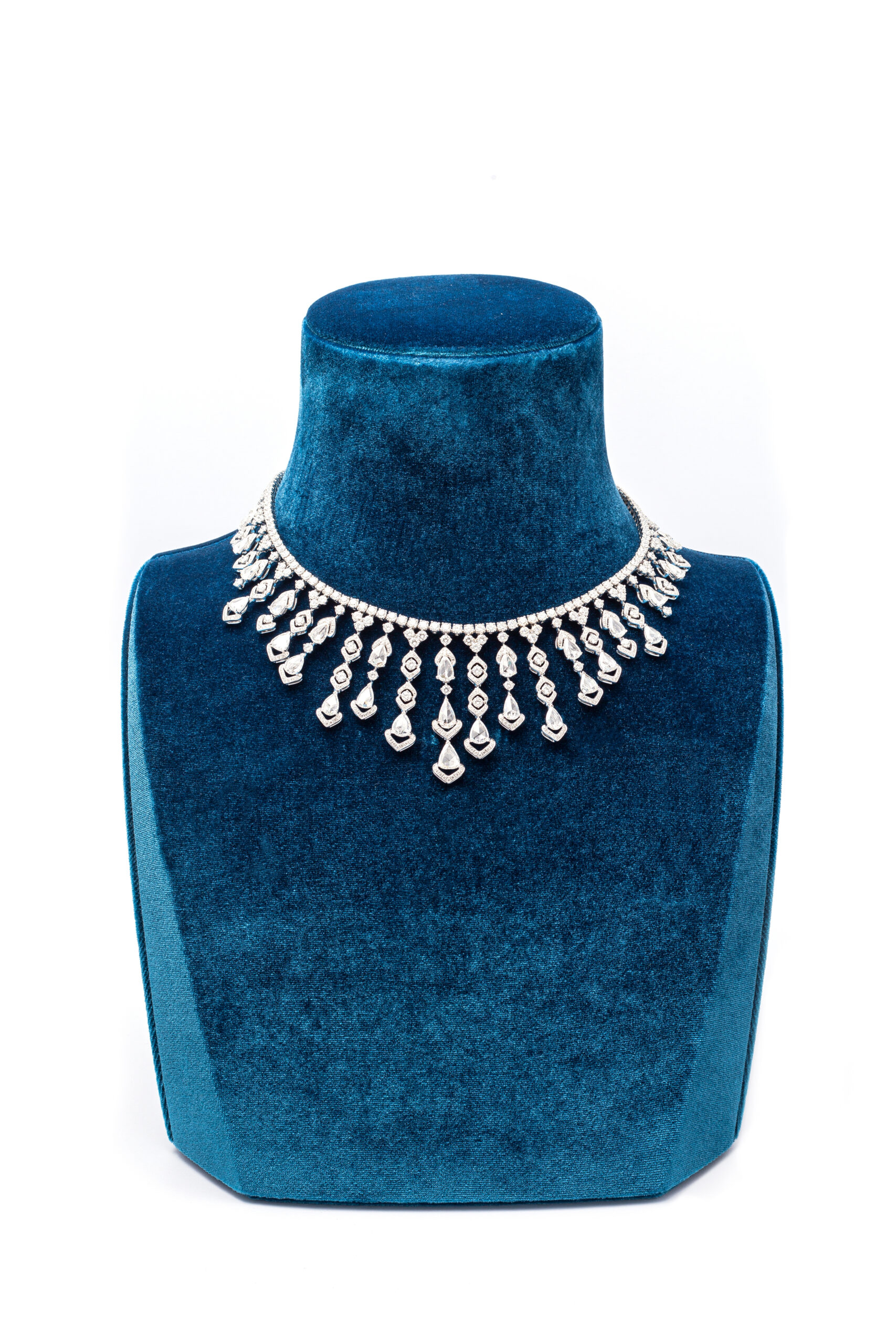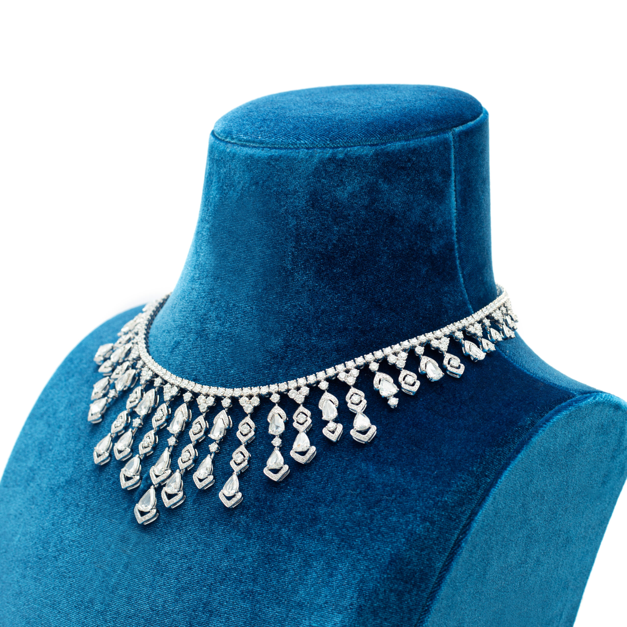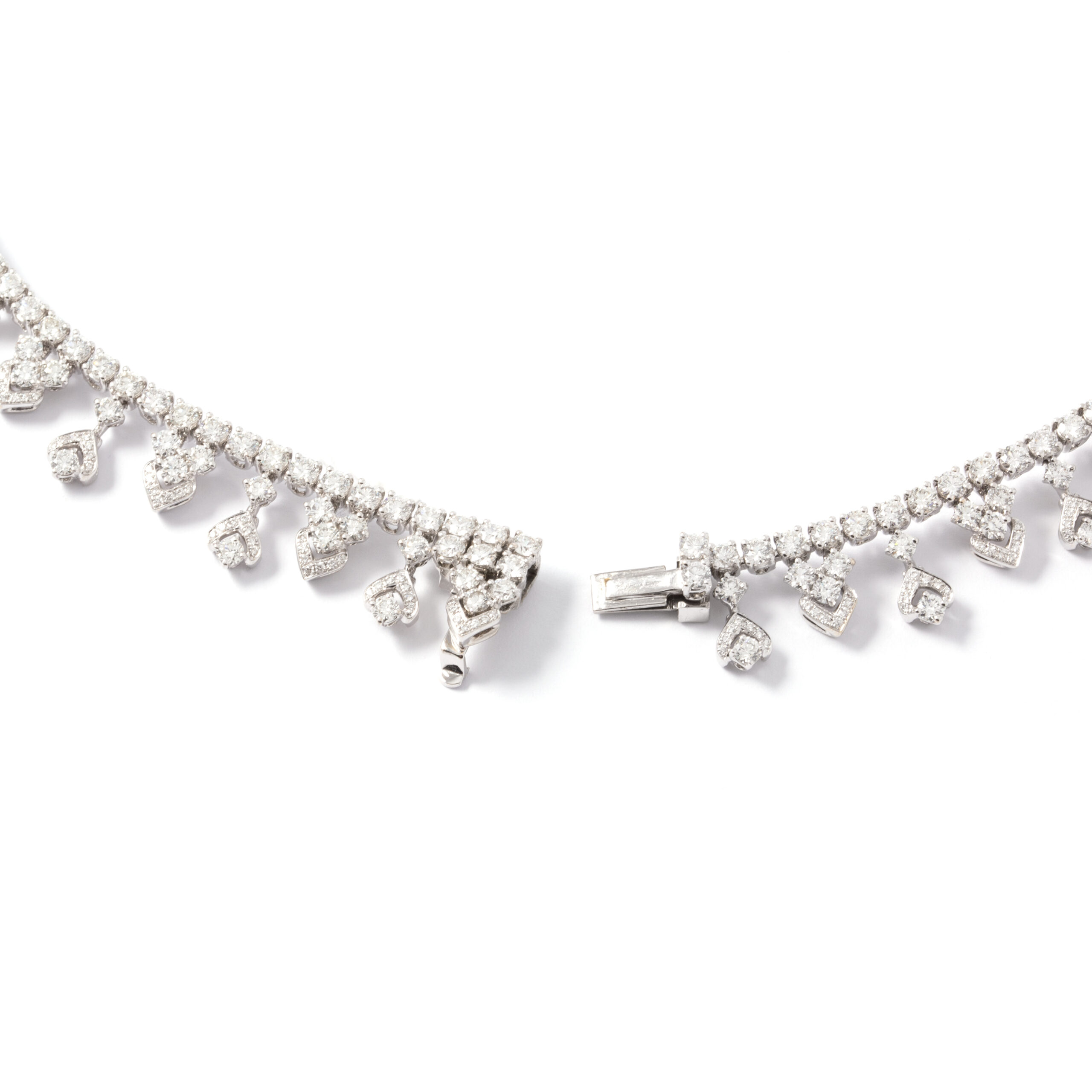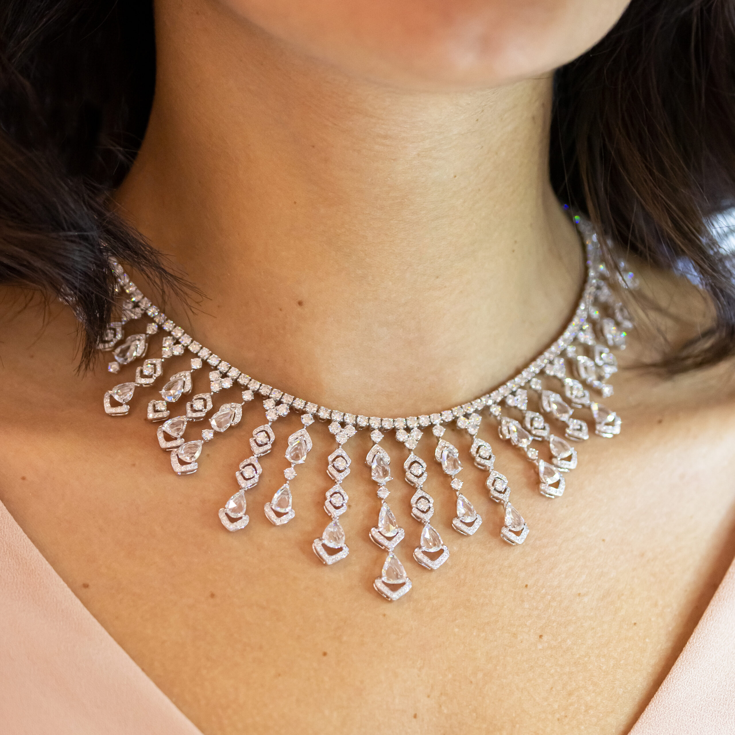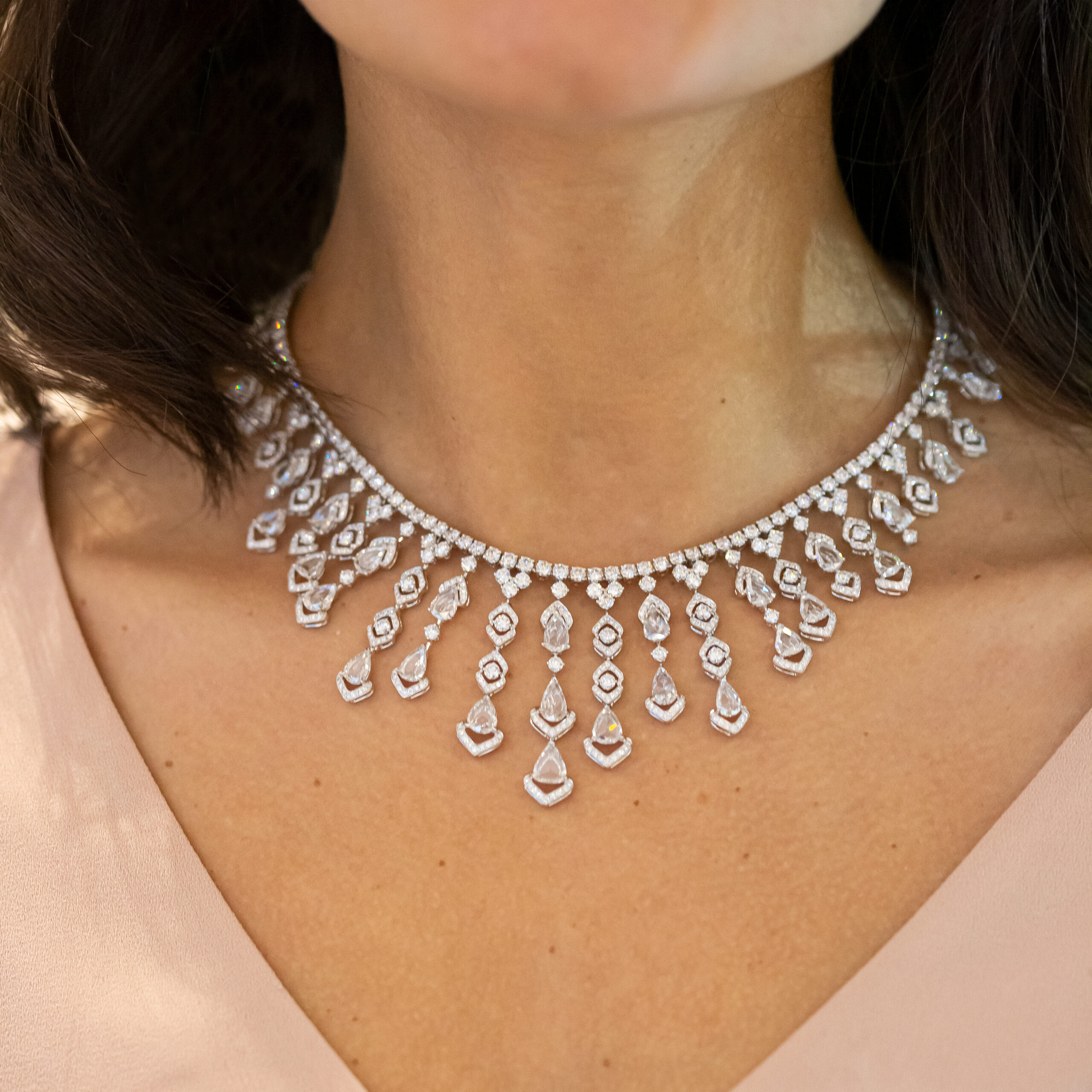 Necklace in 18kt white gold set with 27 pear-shaped rose cut diamonds 12.88 cts and 904 diamonds 26.10 cts.