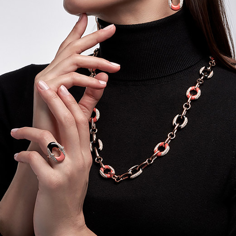 Necklace in 18kt pink gold set with 737 diamonds 10.61 cts, 18 onyx 24.92 cts and 18 coral 17.13 cts