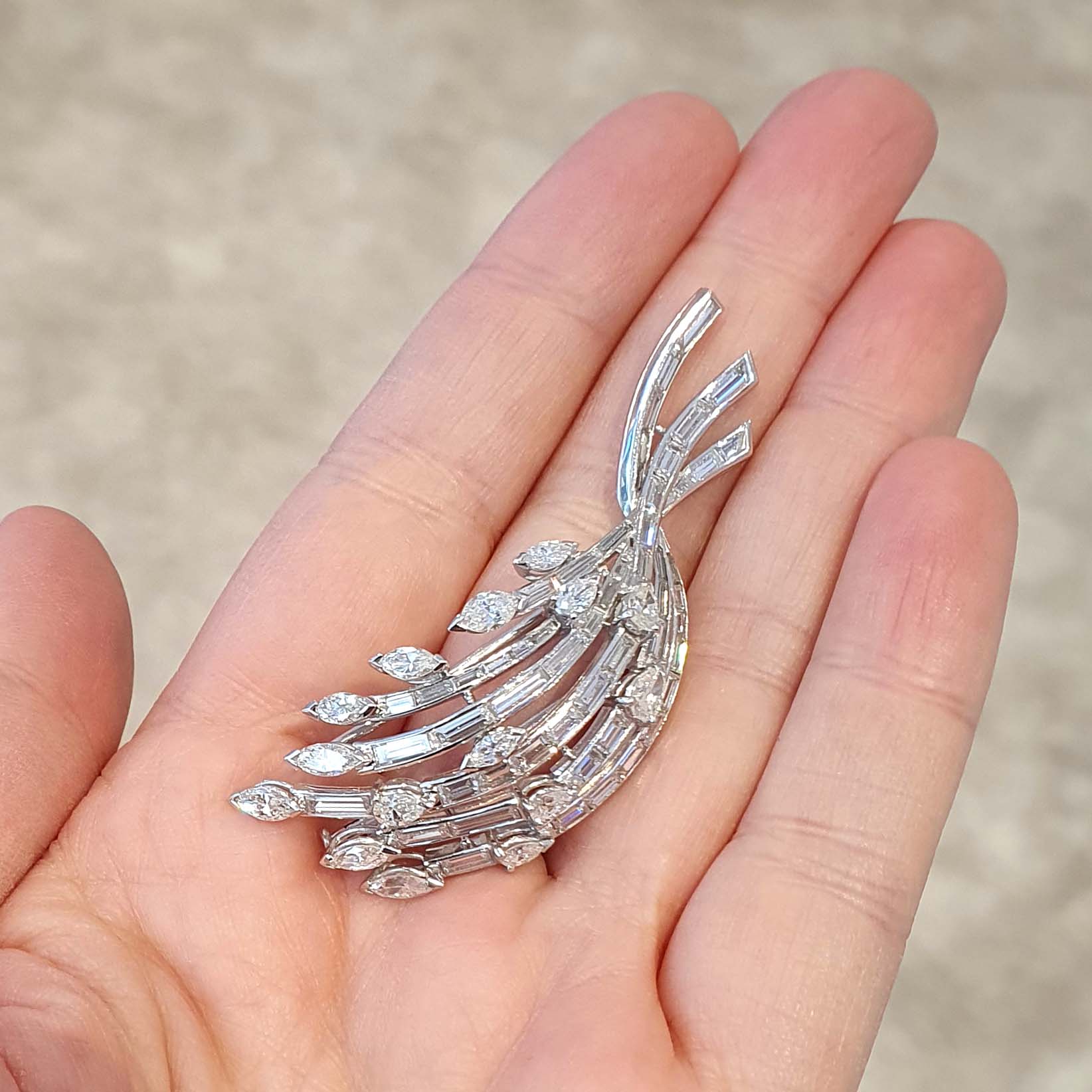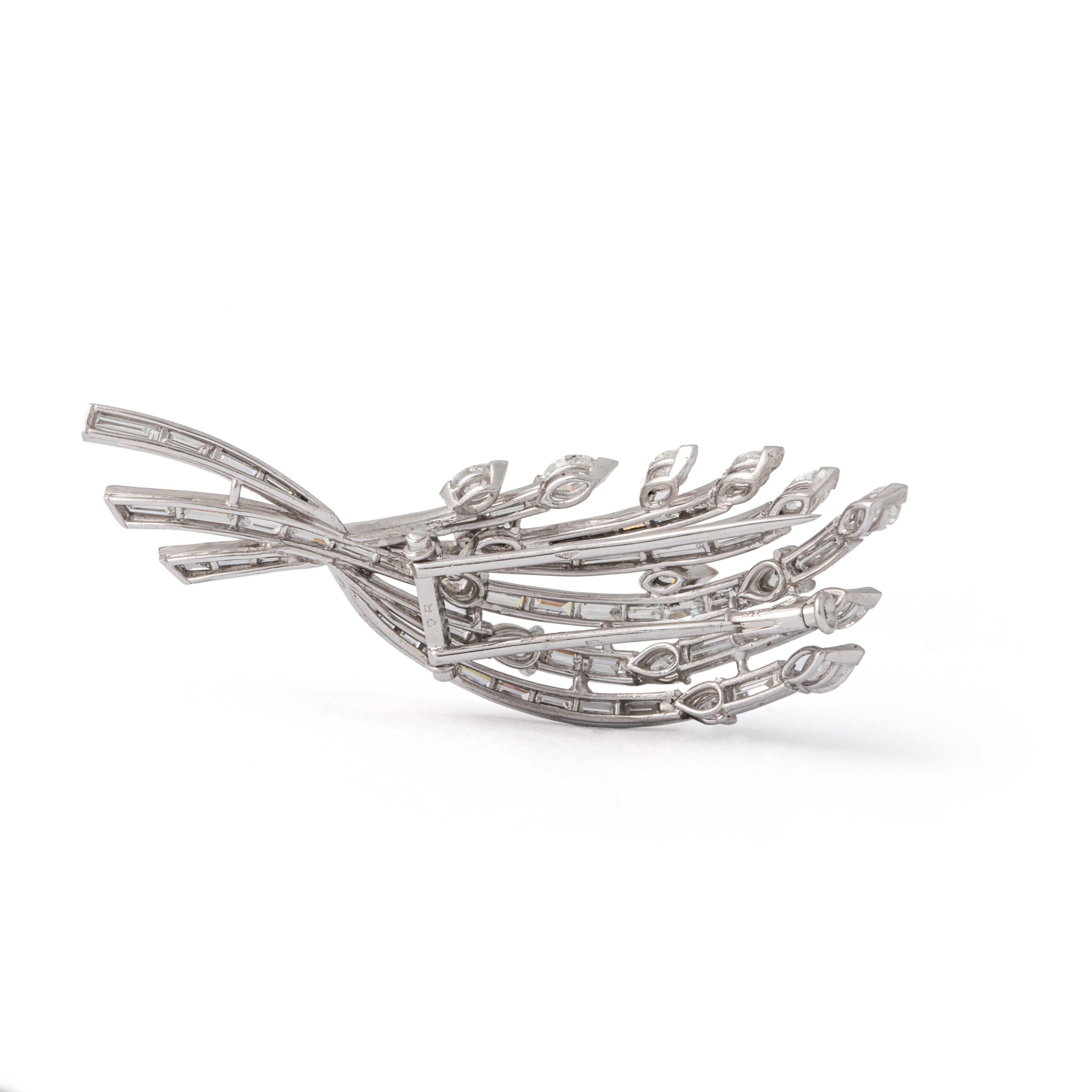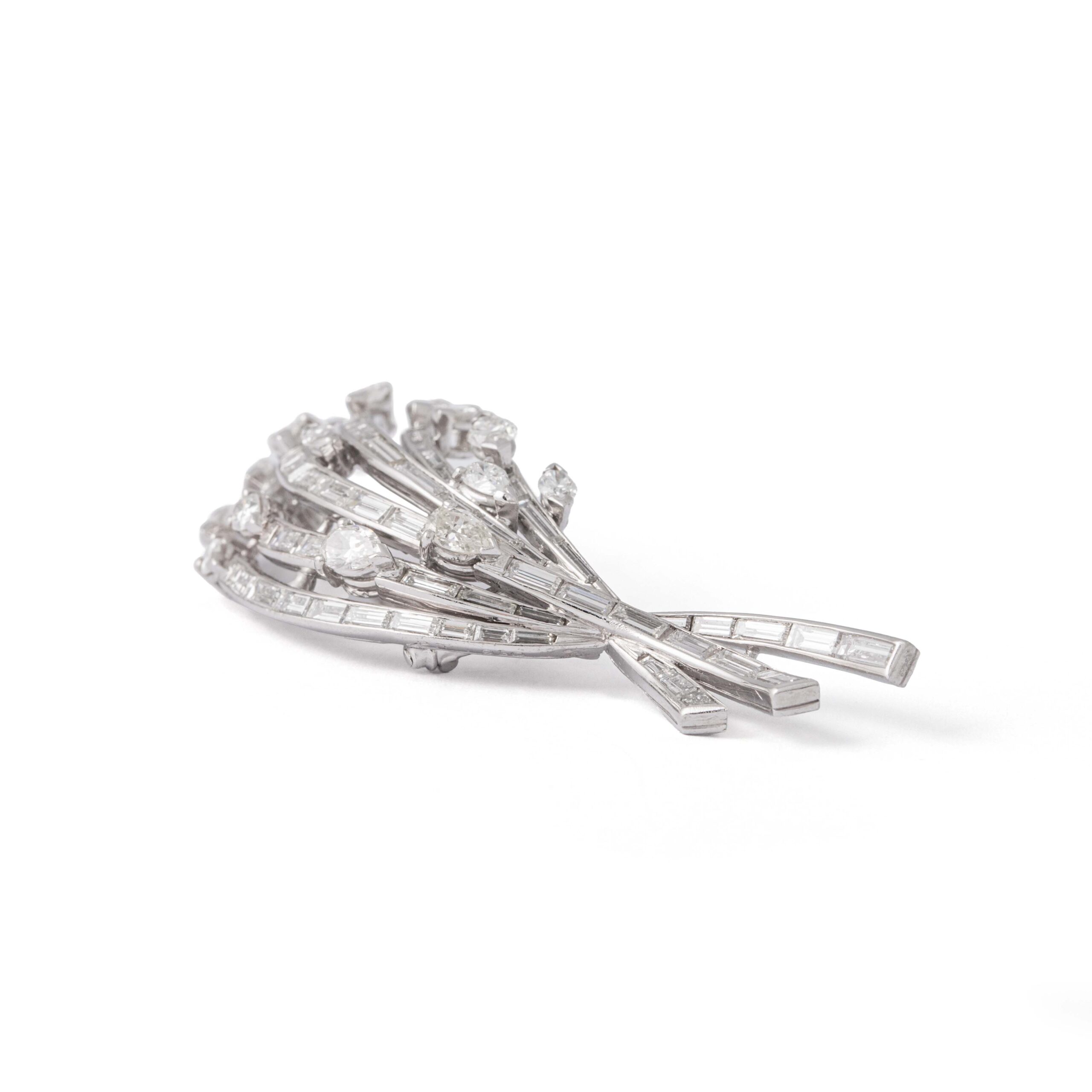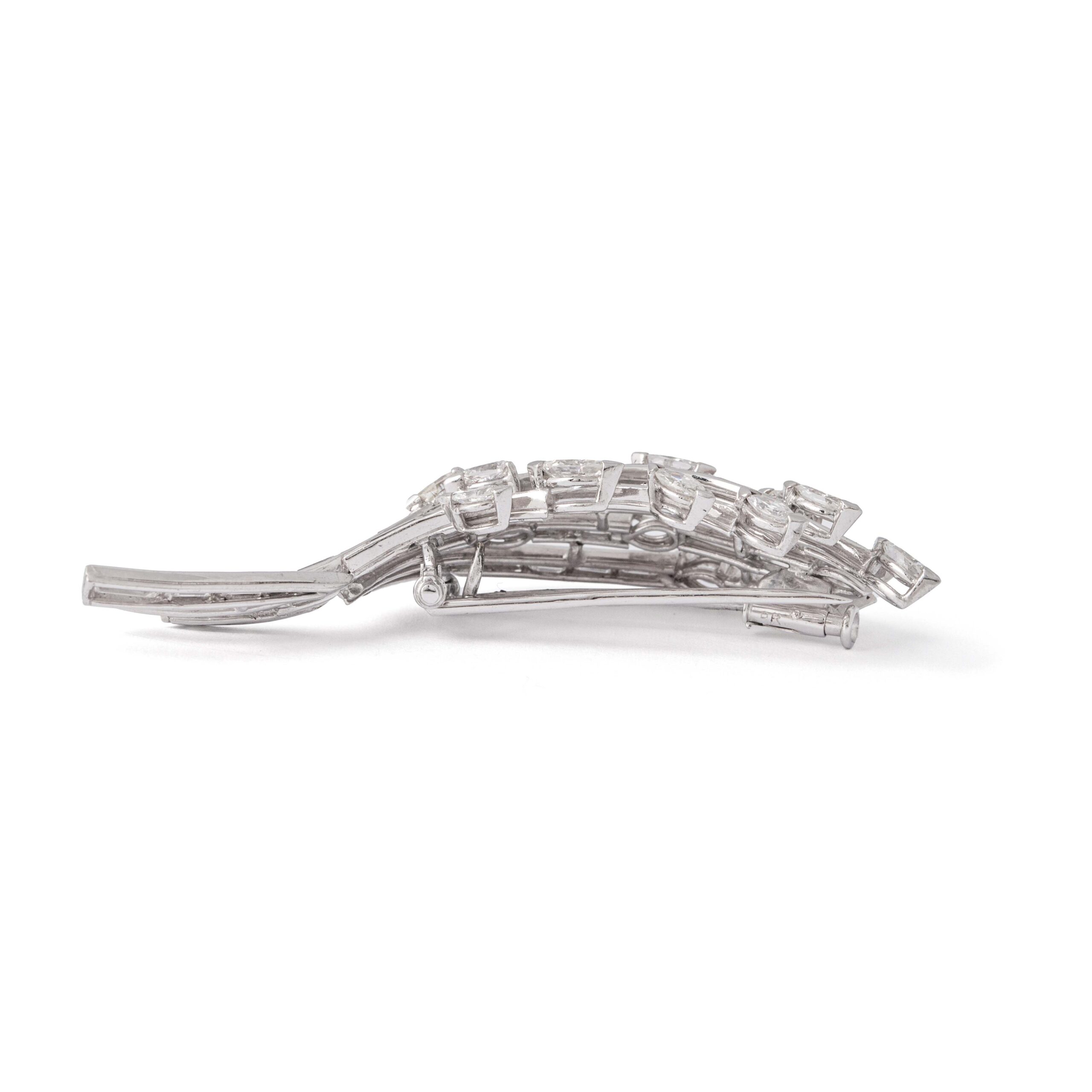 Elevate your style with this captivating Diamond and Platinum Brooch, adorned with a mesmerizing combination of diamonds. Featuring a brilliant 2.25-carat pear-shaped and marquise-cut diamonds, alongside 3.85 carats of baguette-cut diamonds, this brooch exudes timeless elegance and sophistication. The platinum setting adds a touch of refinement, making it a radiant statement piece for any occasion.