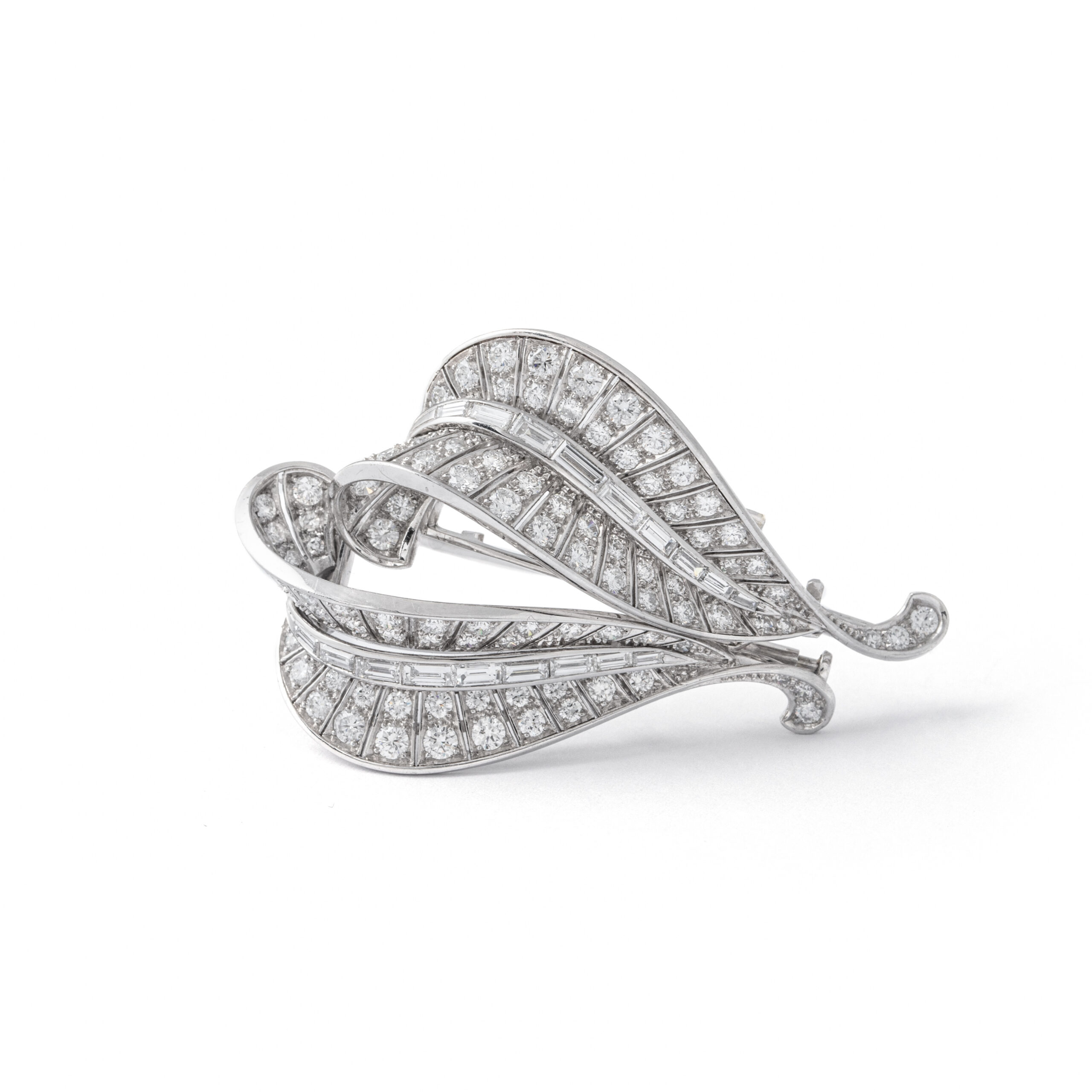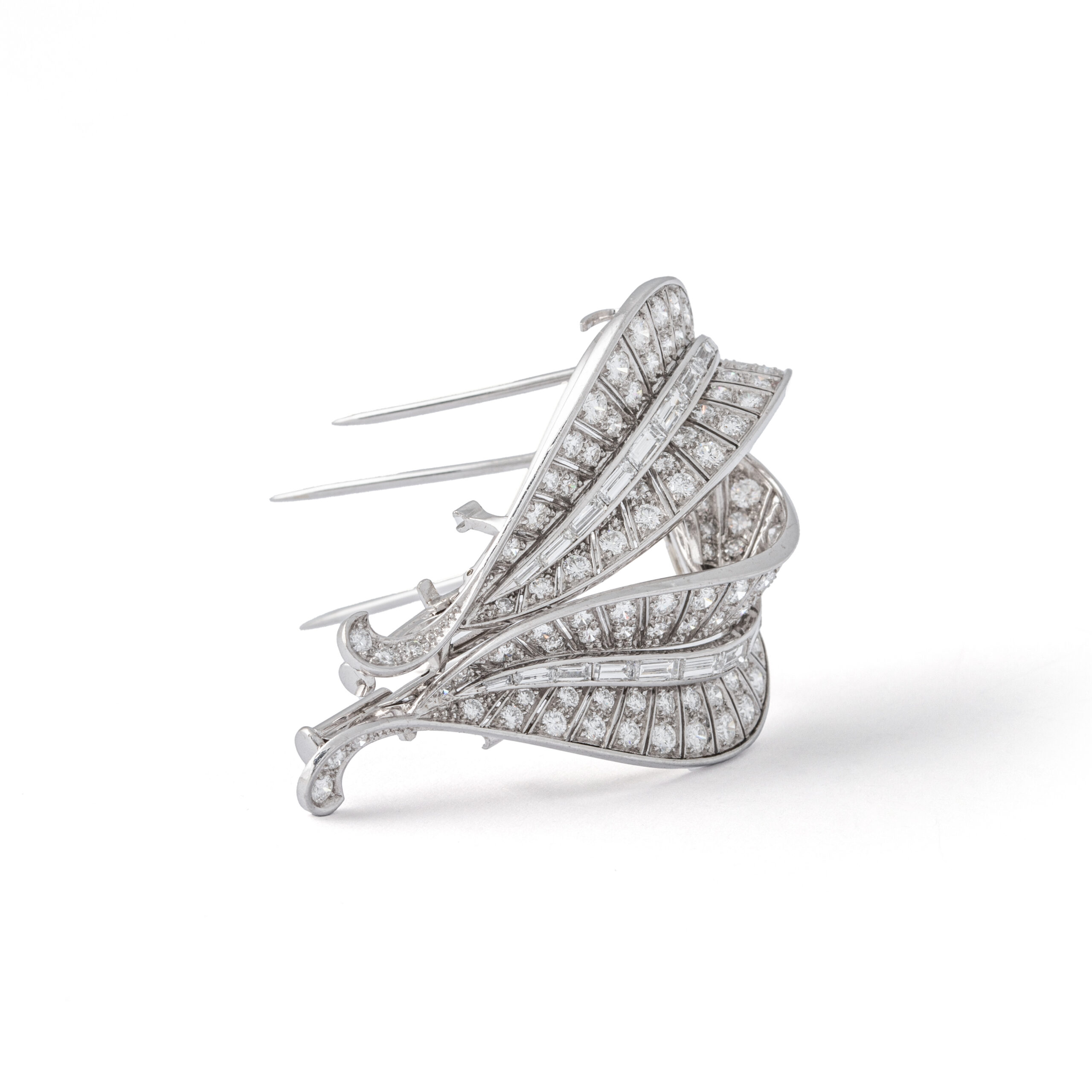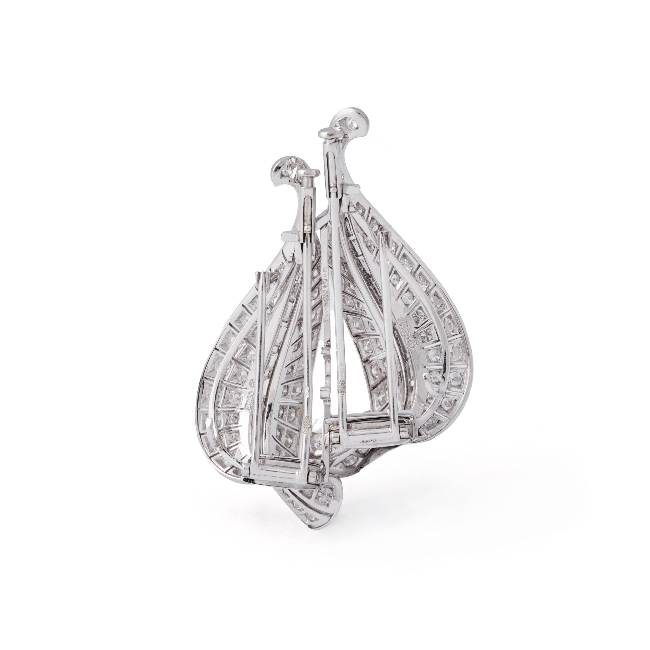 Diamond platinum and white gold 18K double clip brooch. Crafted with timeless elegance, this brooch showcases a stunning combination of platinum and white gold, accentuated by a dazzling array of diamonds.