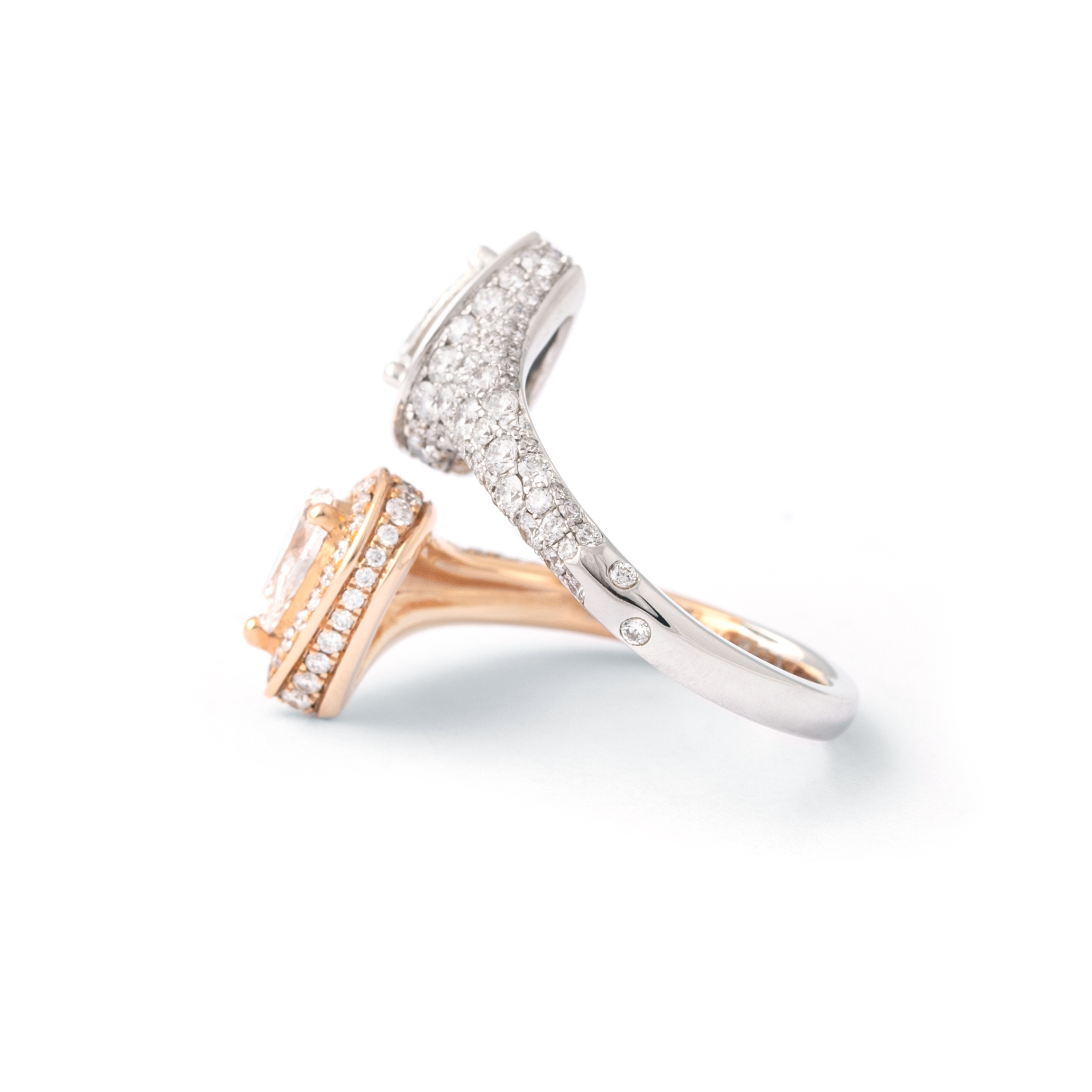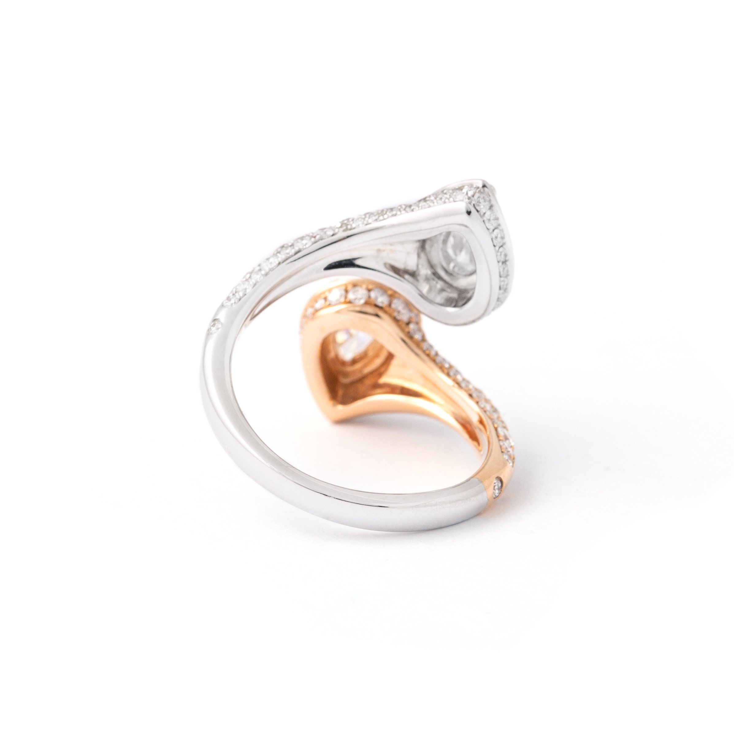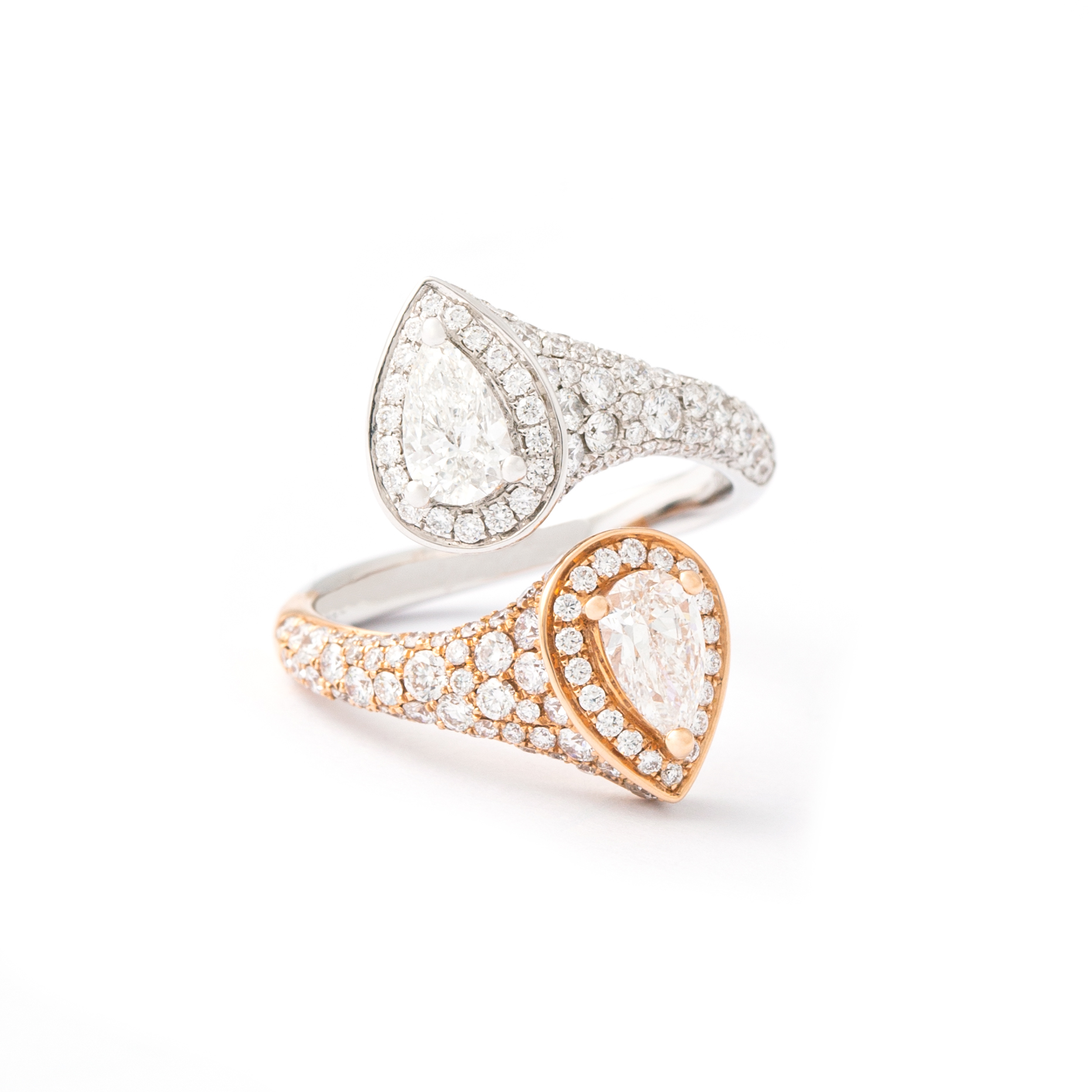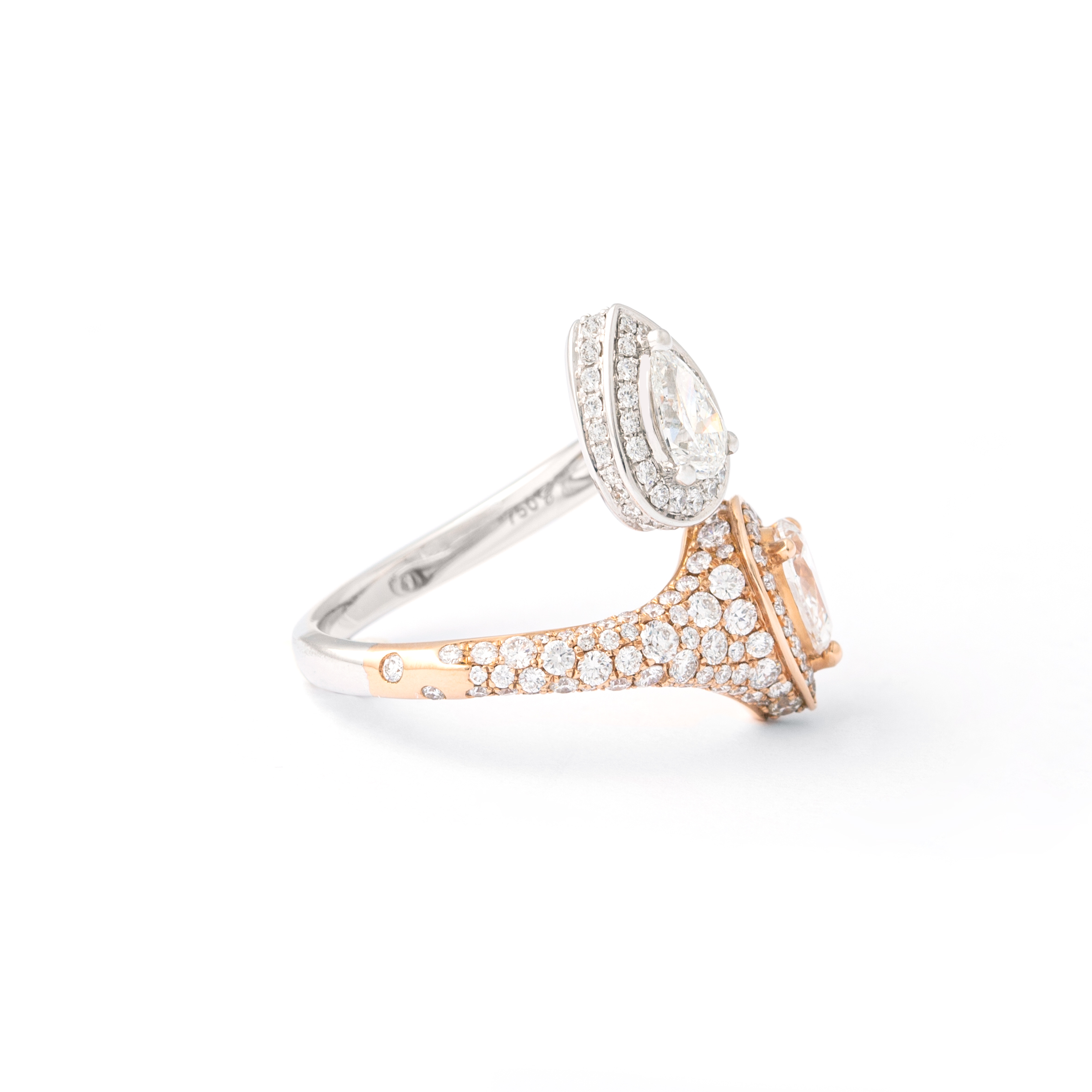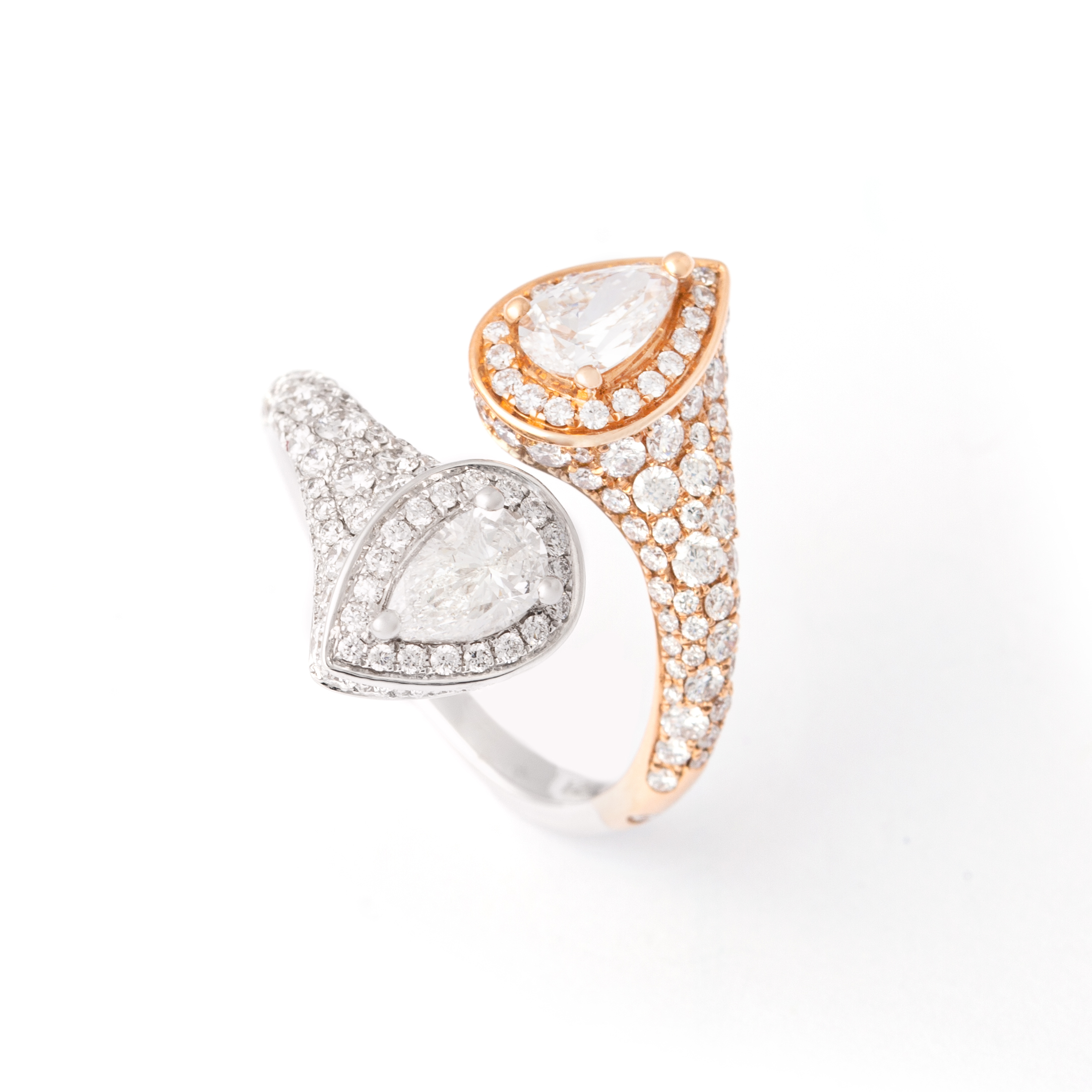 Ring in 18kt pink and white gold set with 2 pear-shaped cut diamonds 0.83 cts and 172 diamonds 1.26 cts, size 6.5