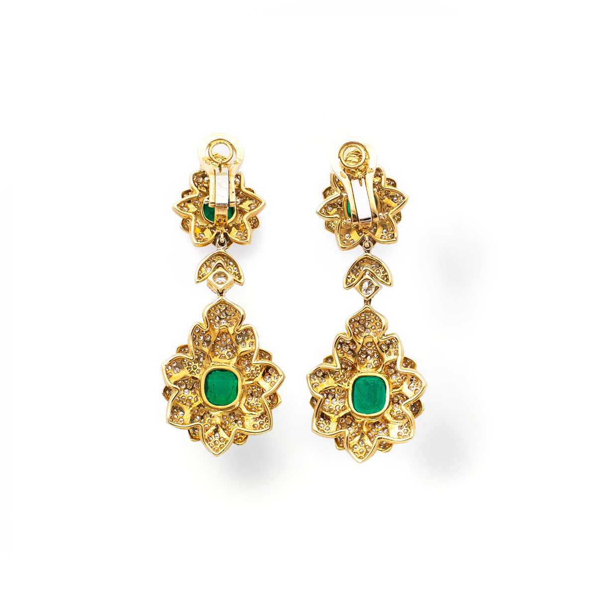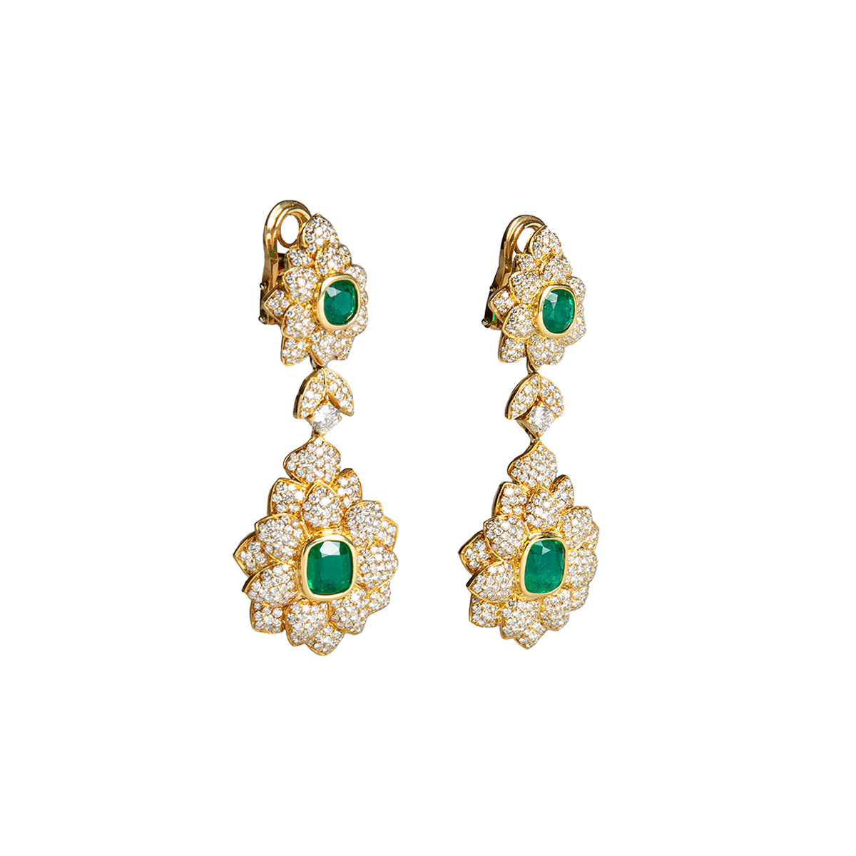 Earrings designed as stylized flowers set by diamonds 5.84 carats and emerald 6.42 carats on yellow gold.