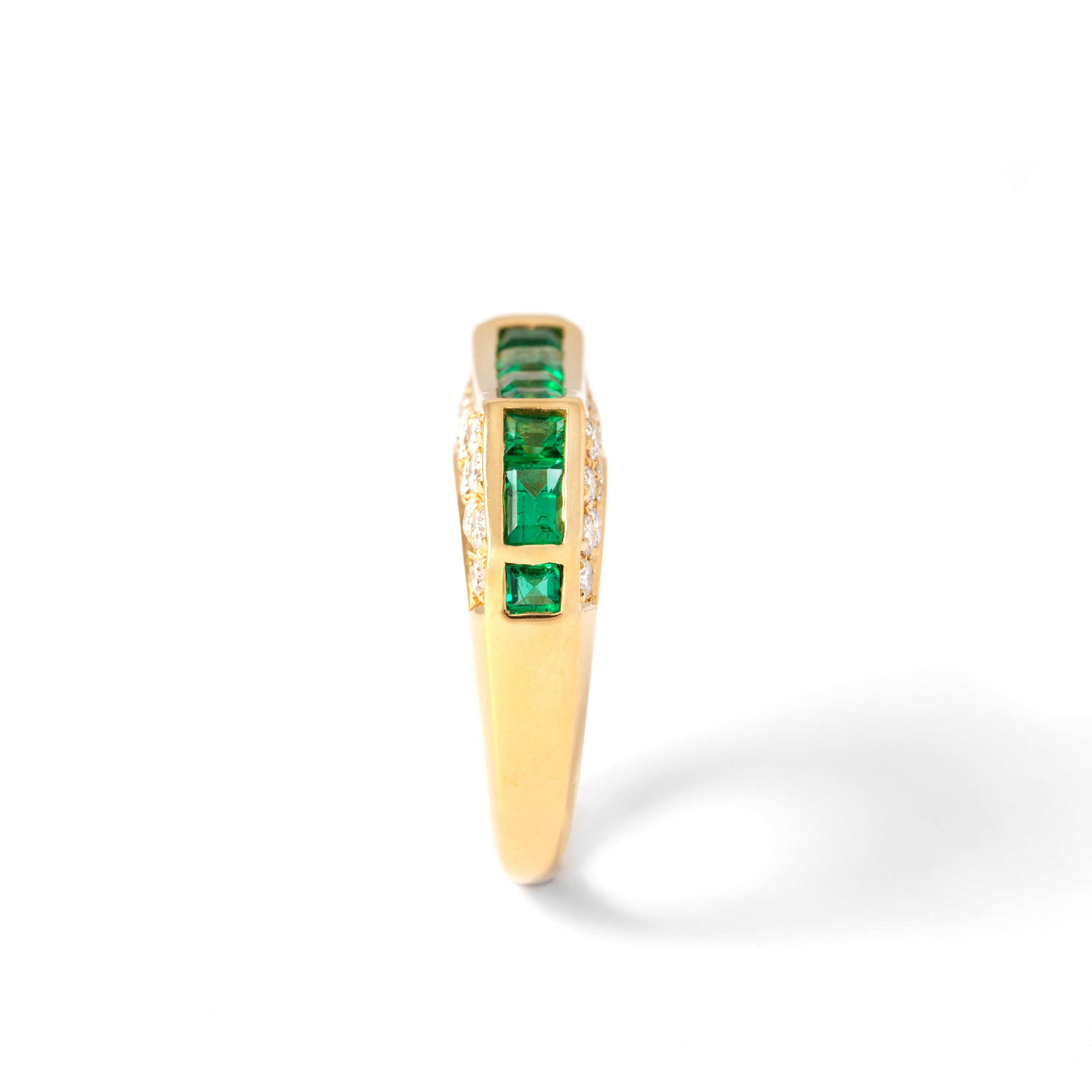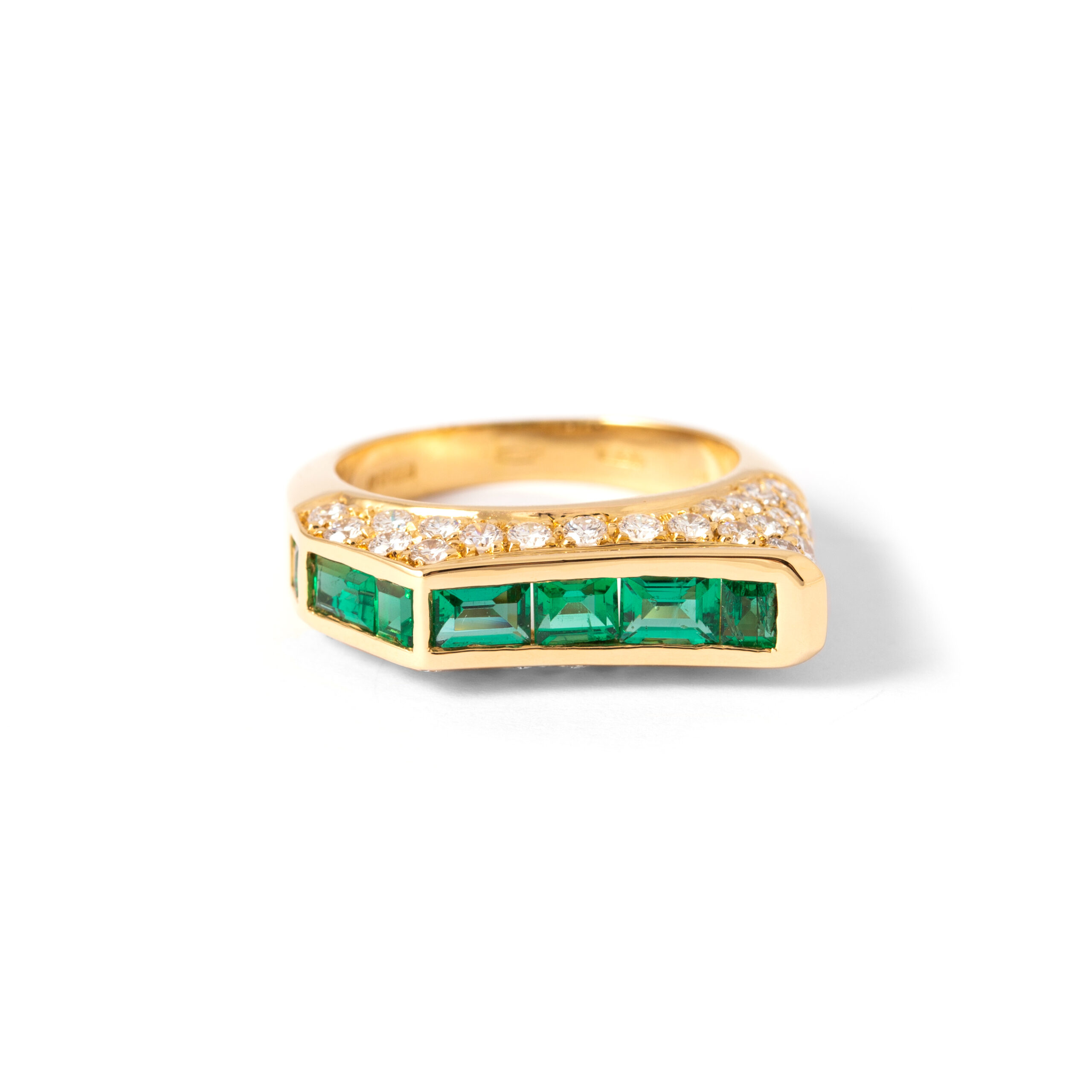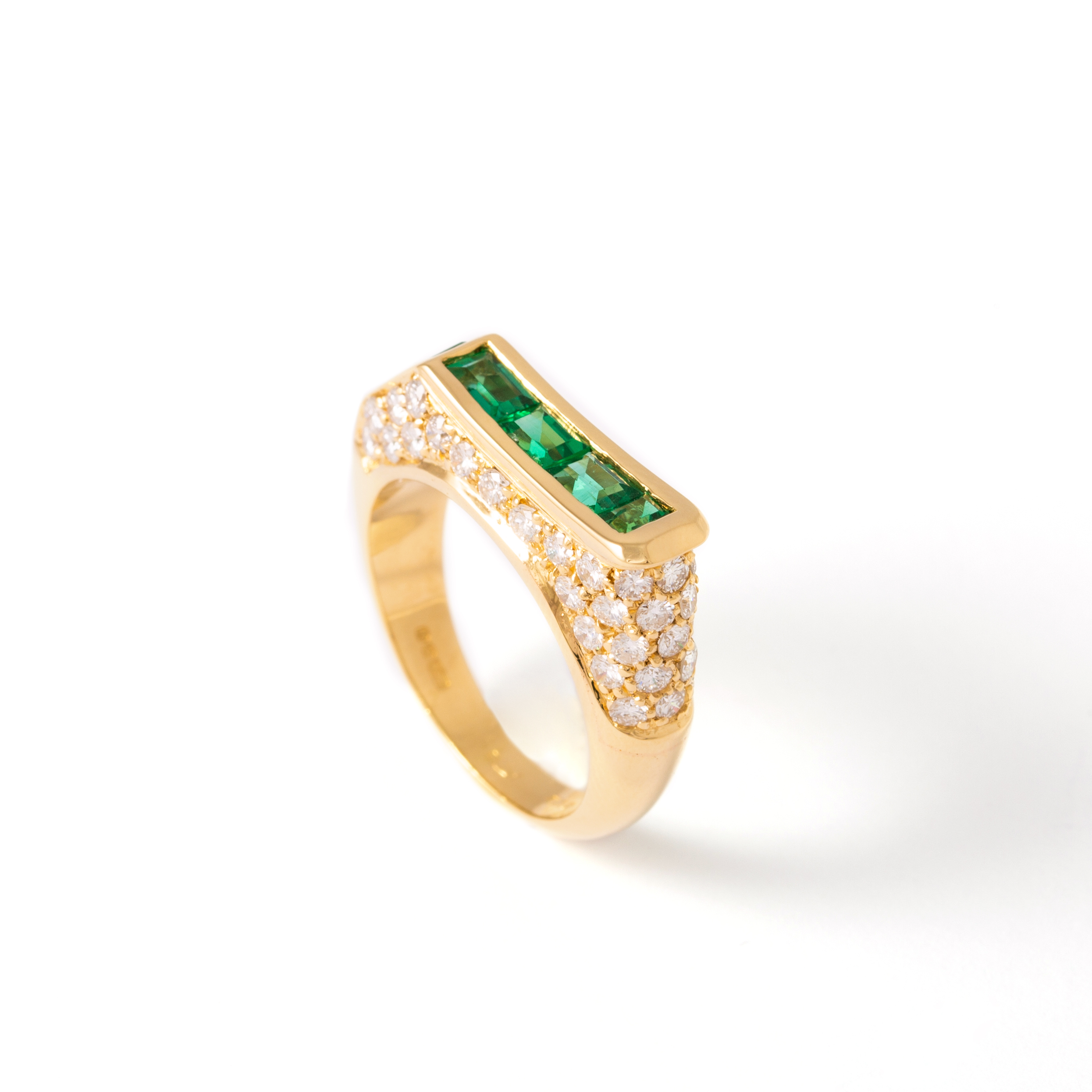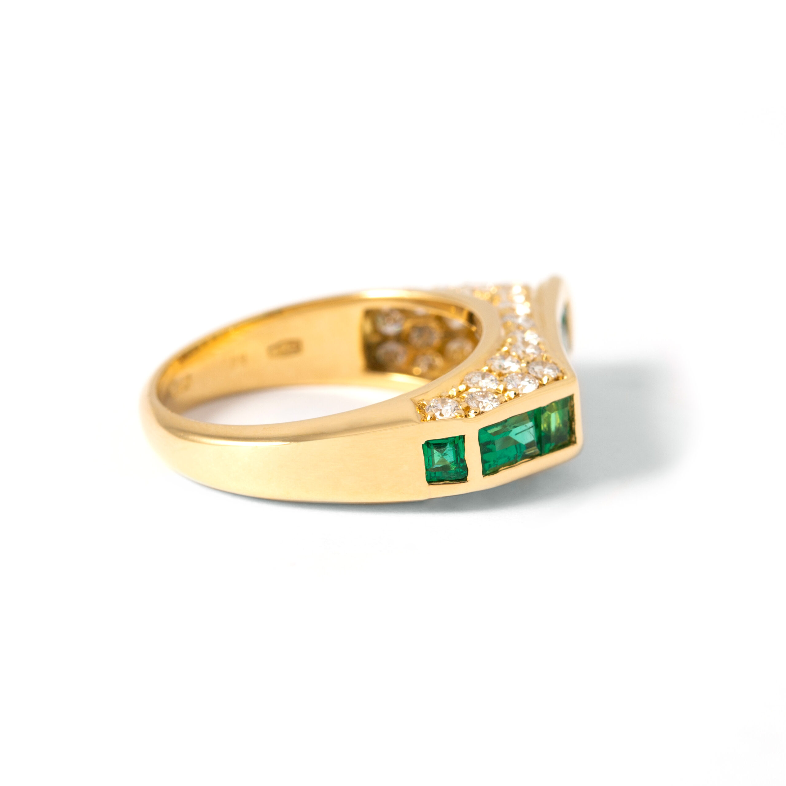 Ring in 18kt yellow gold set with square cut emeralds 0.92 cts and diamonds
