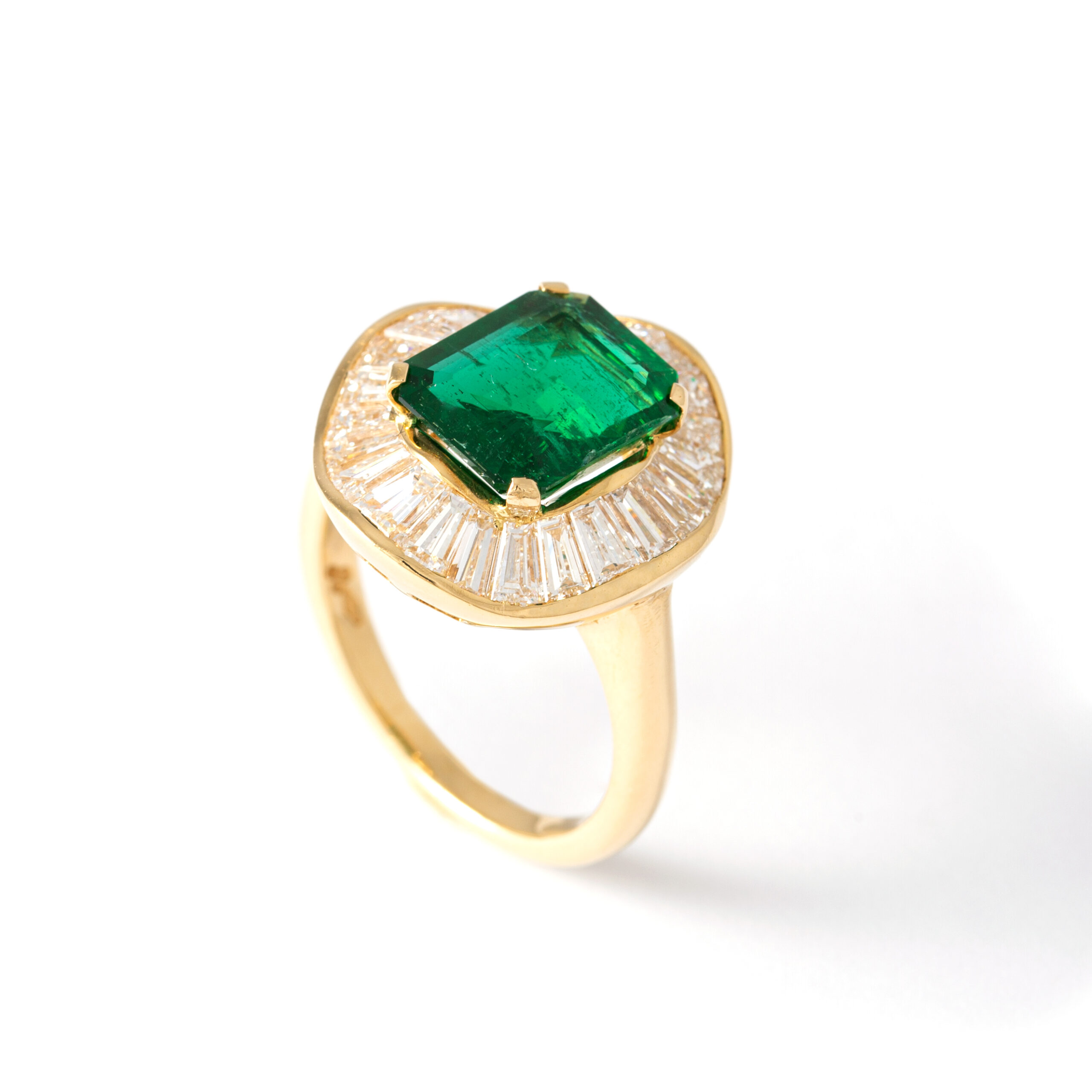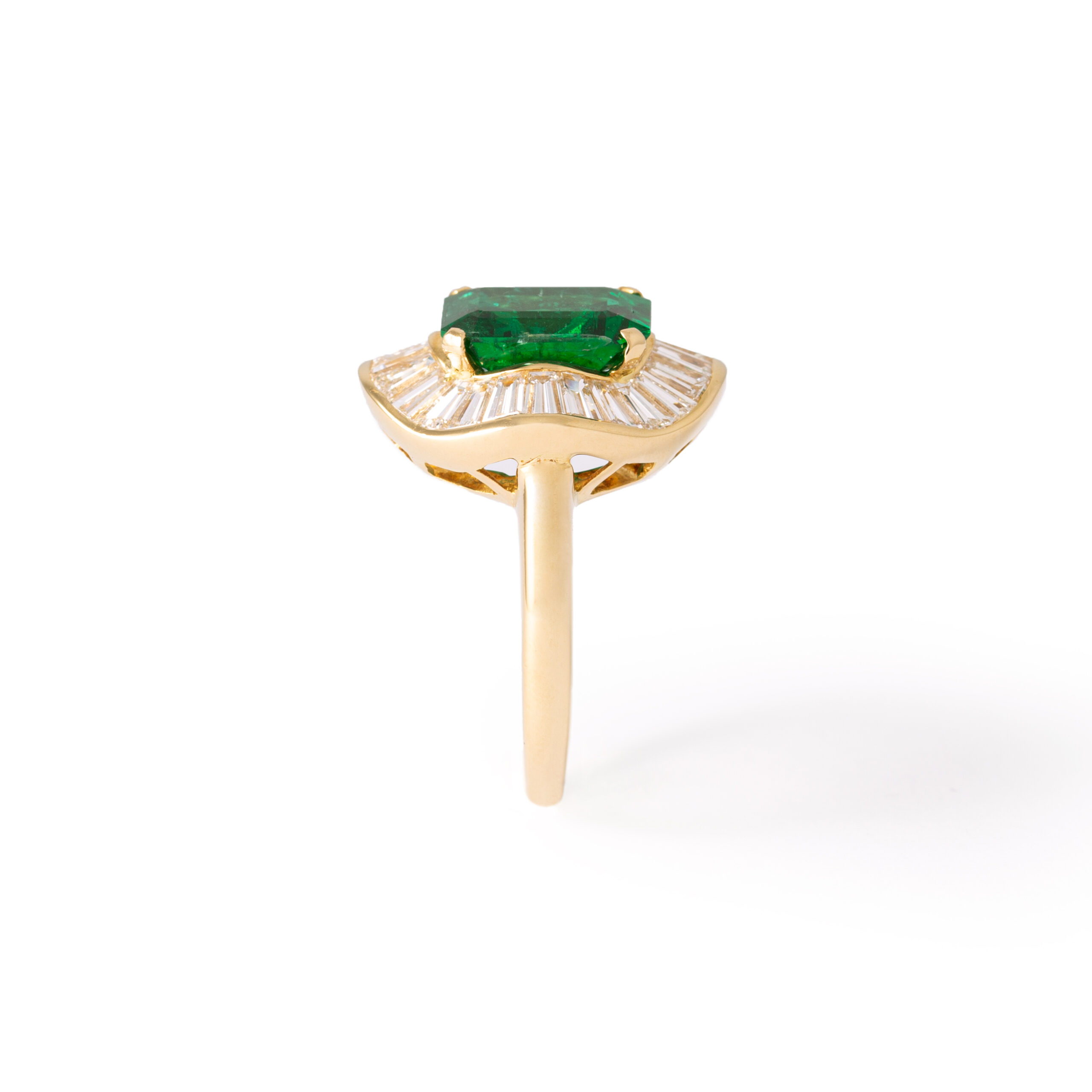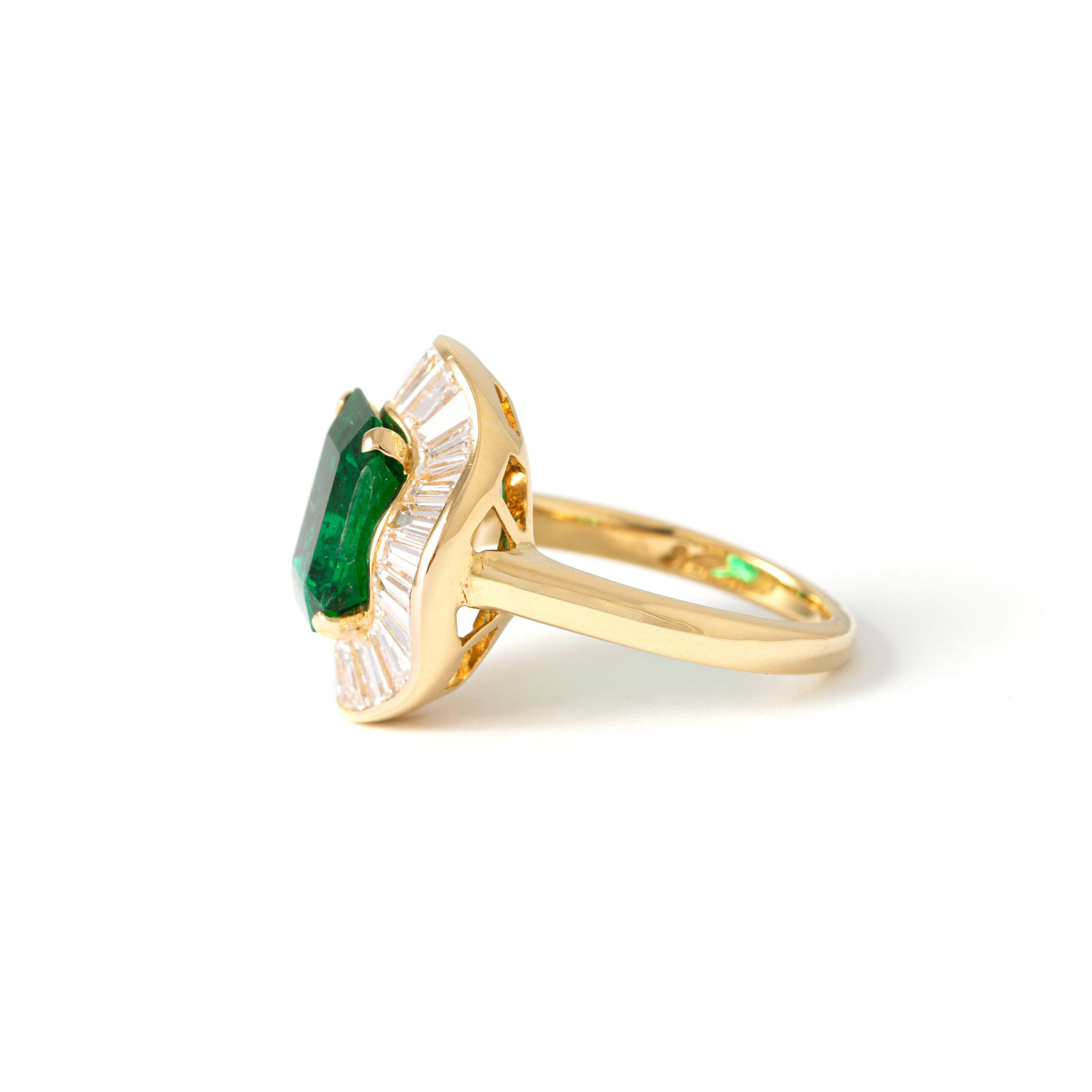 Ring in 18kt yellow gold set with one square cut emerald 3.22 cts and diamonds 2.18cts