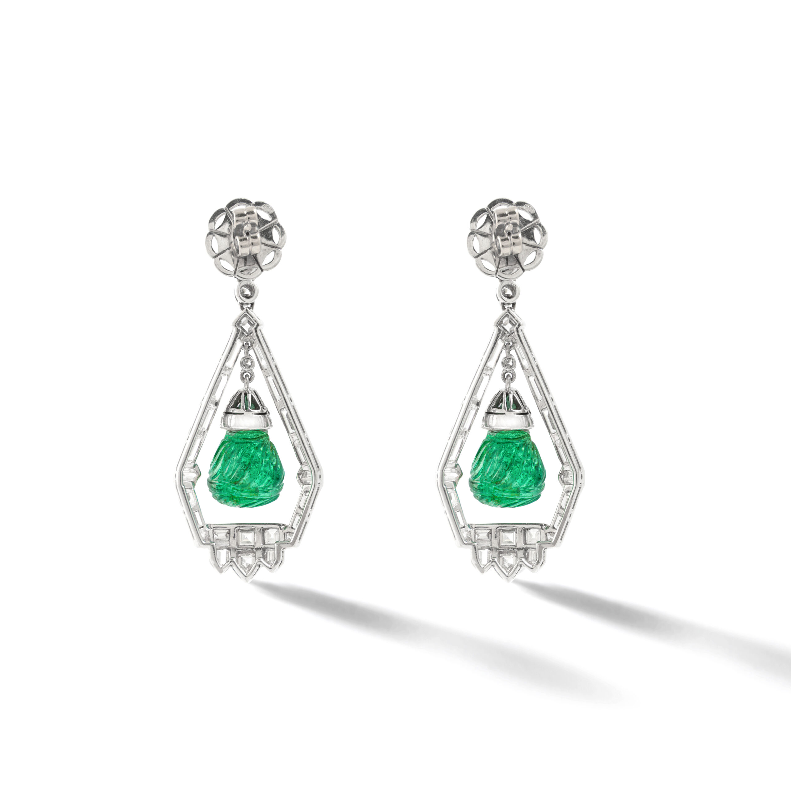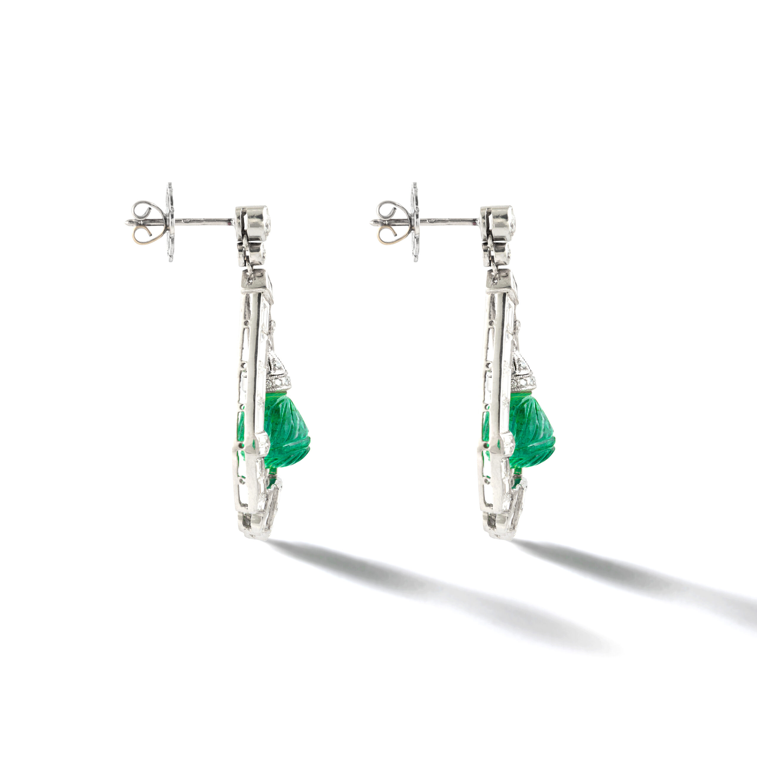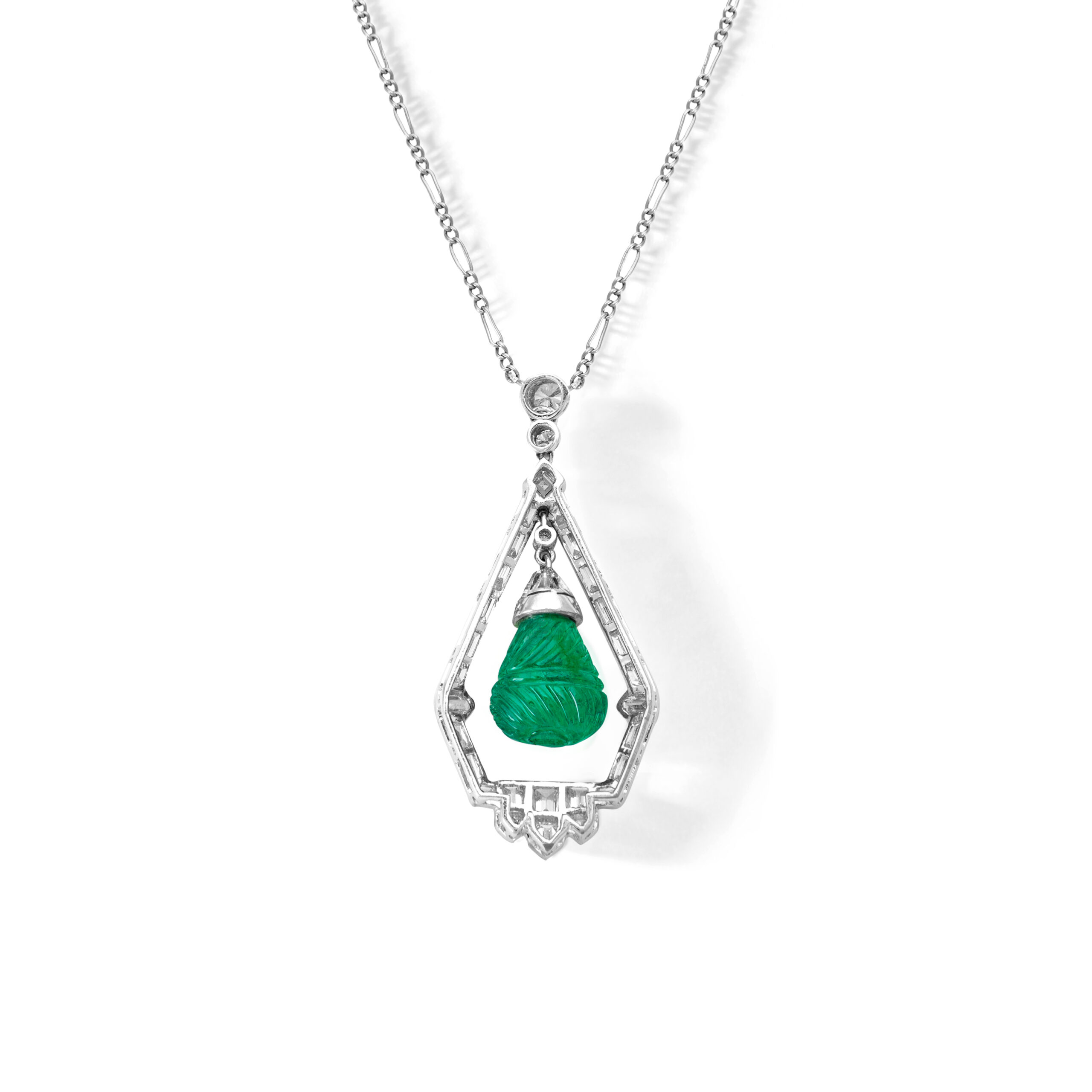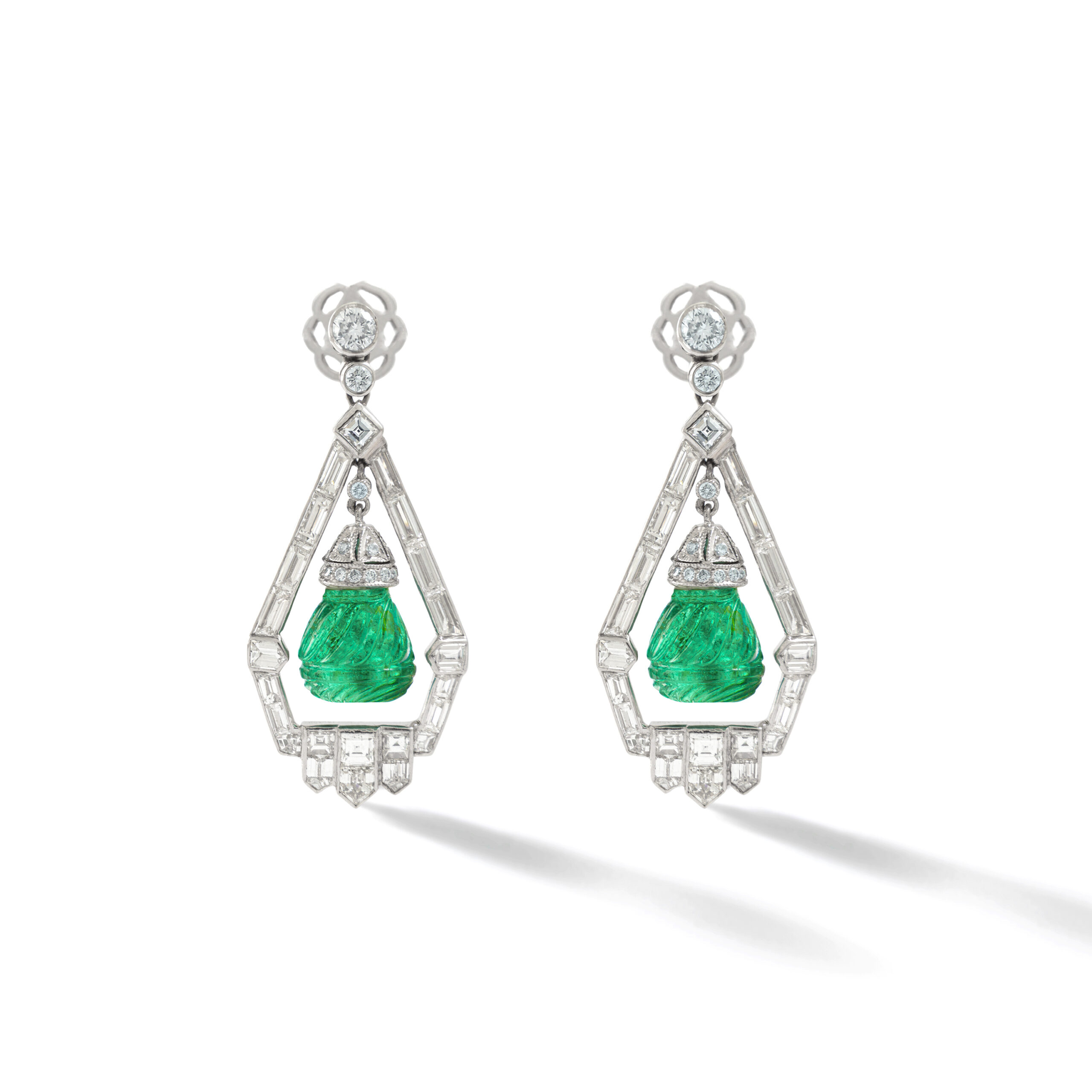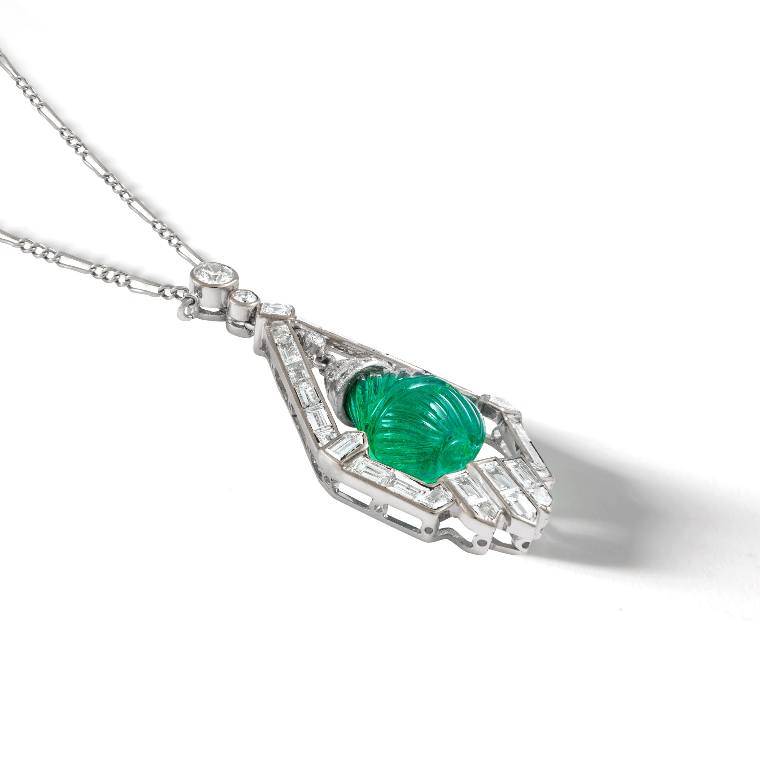 Art Deco design Demi-Parure including Ear Pendants and a Pendant in Platinum and Diamond (baguette cut and round cut) holding engraved Emeralds.