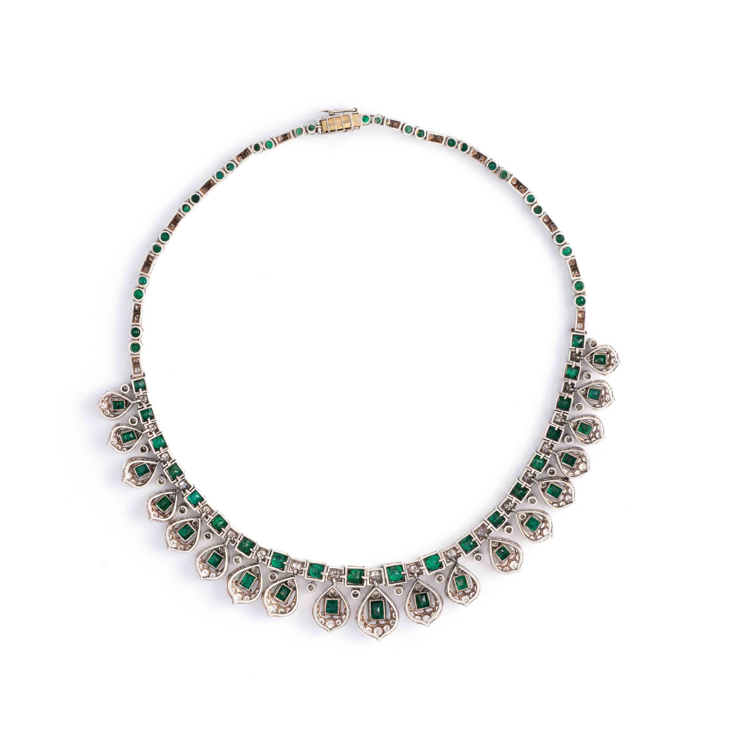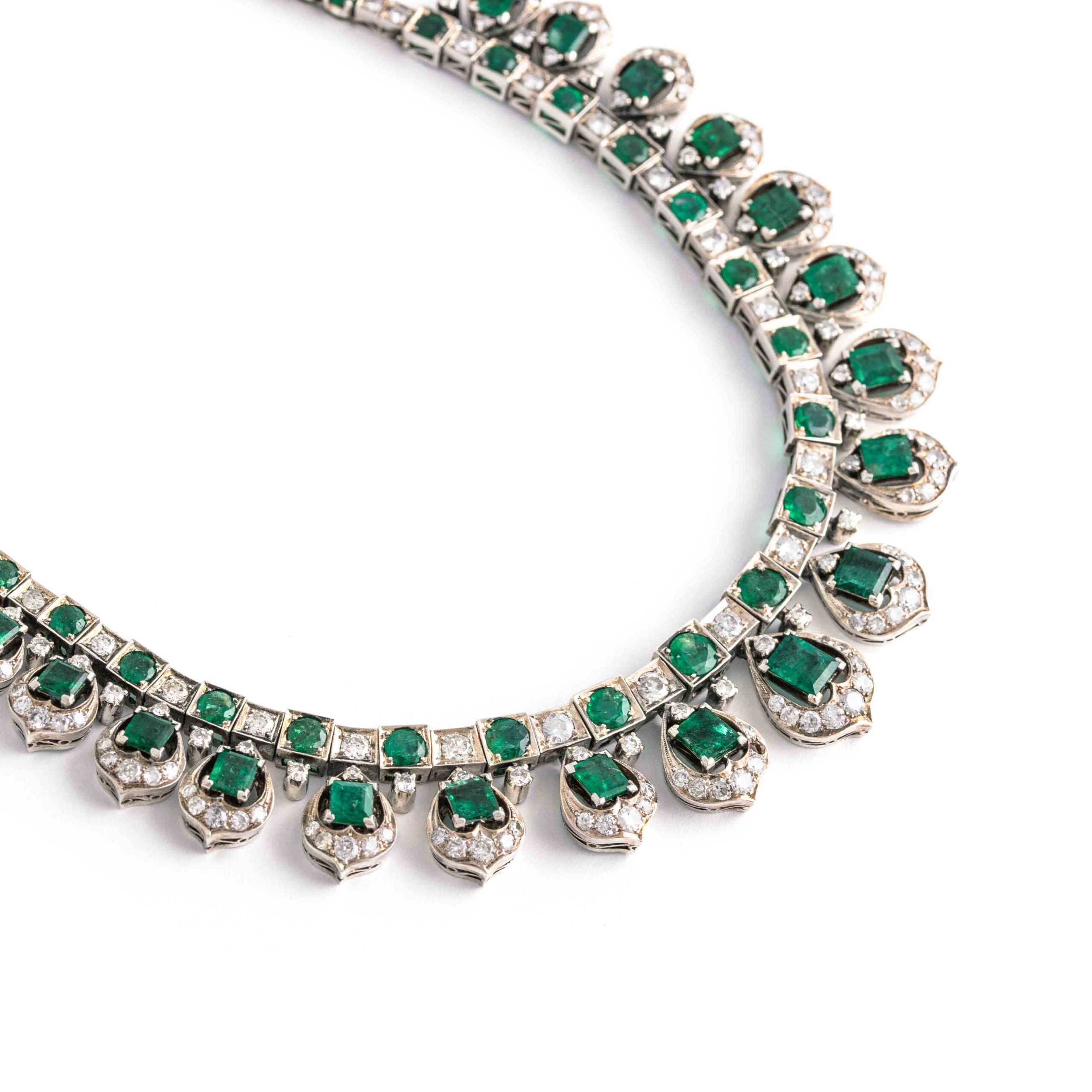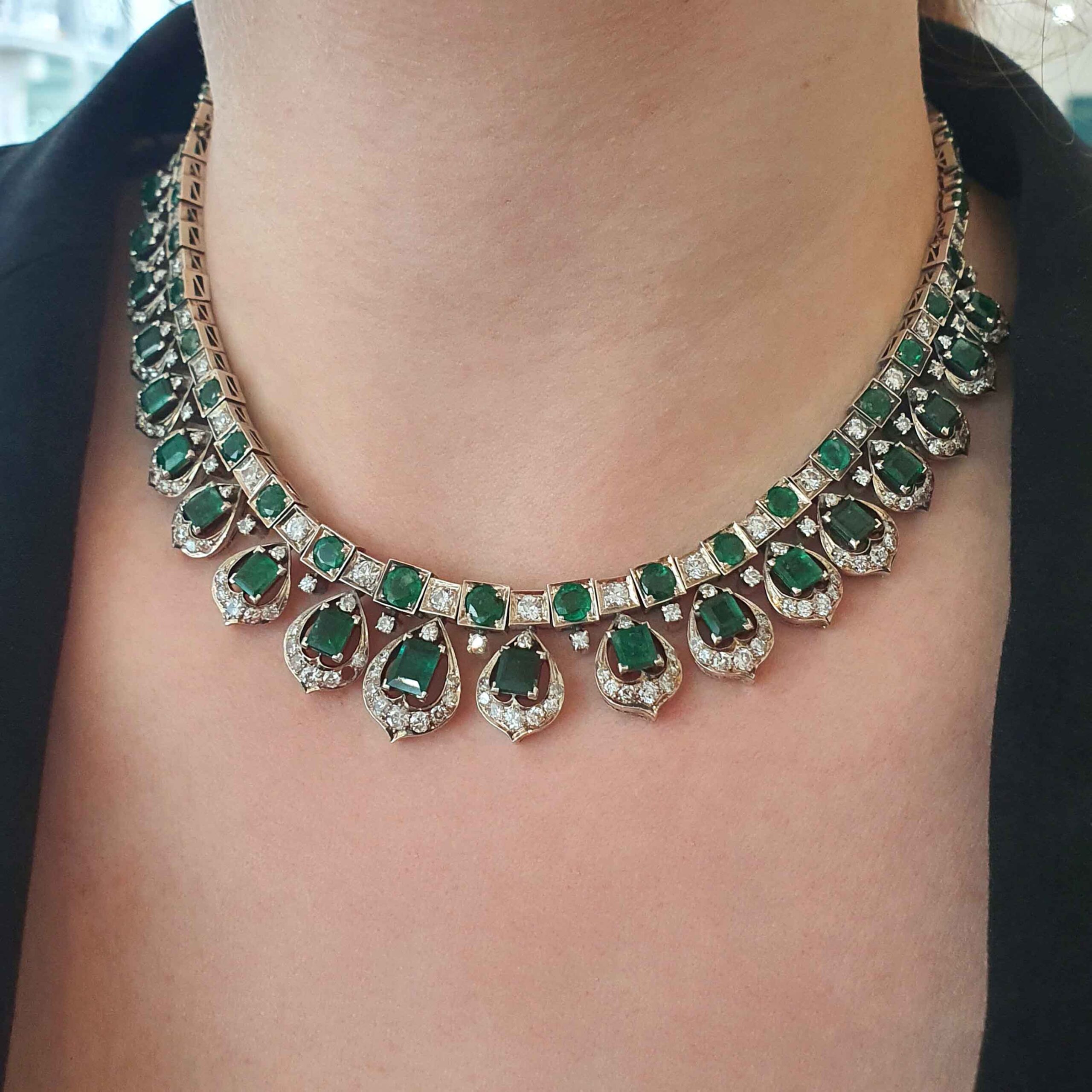 The lustrous white gold setting accentuates the vibrant green hues of the emeralds, while the dazzling diamonds add a touch of brilliance and luxury. Perfect for adding a touch of glamour to any ensemble, this necklace is a symbol of refined sophistication and beauty.