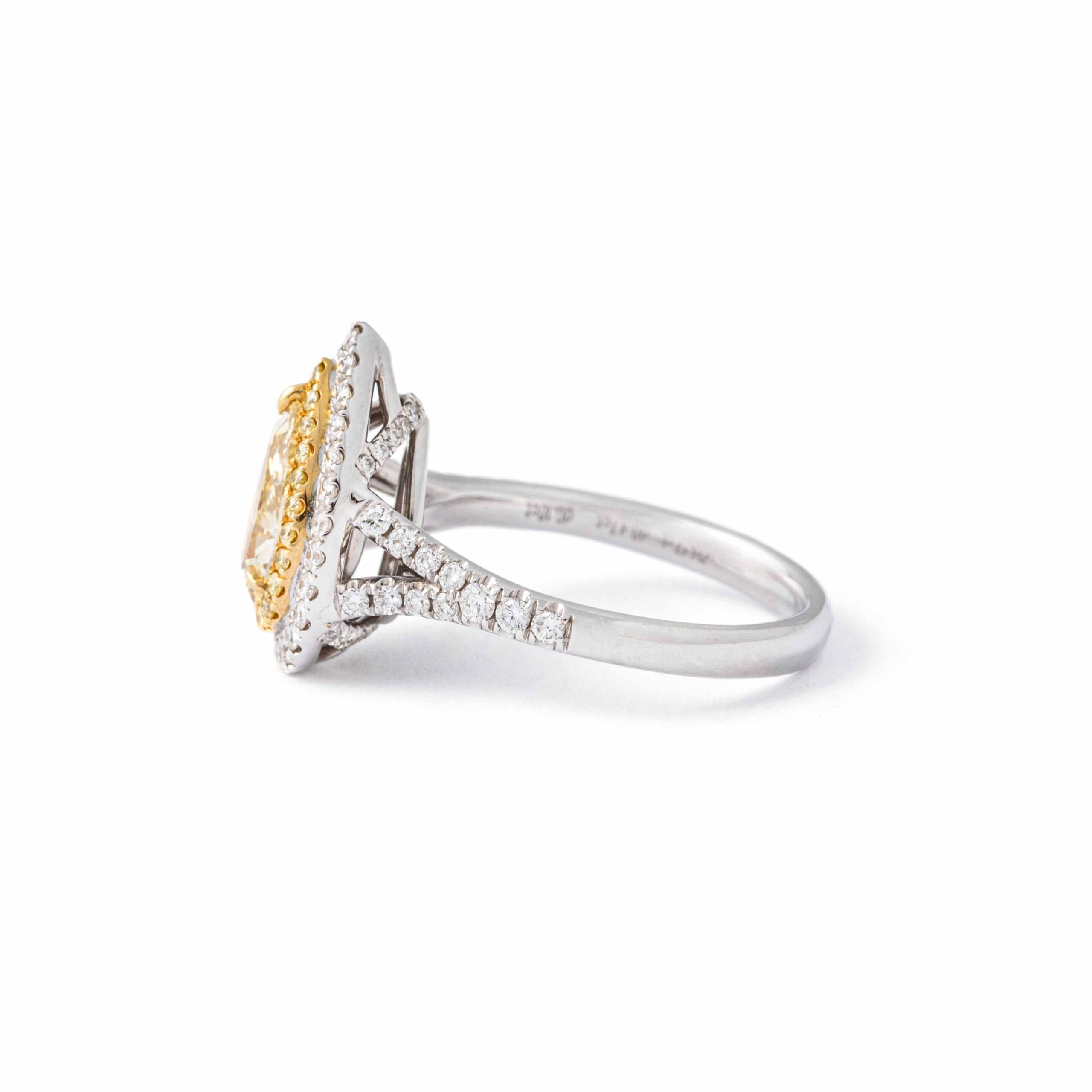 This exquisite ring features a stunning fancy light brownish yellow diamond, carefully set in luxurious 18K white gold. The centerpiece of this piece is a radiant-cut diamond that showcases a unique and captivating hue, combining light brown and yellow tones to create a warm, sophisticated glow.
