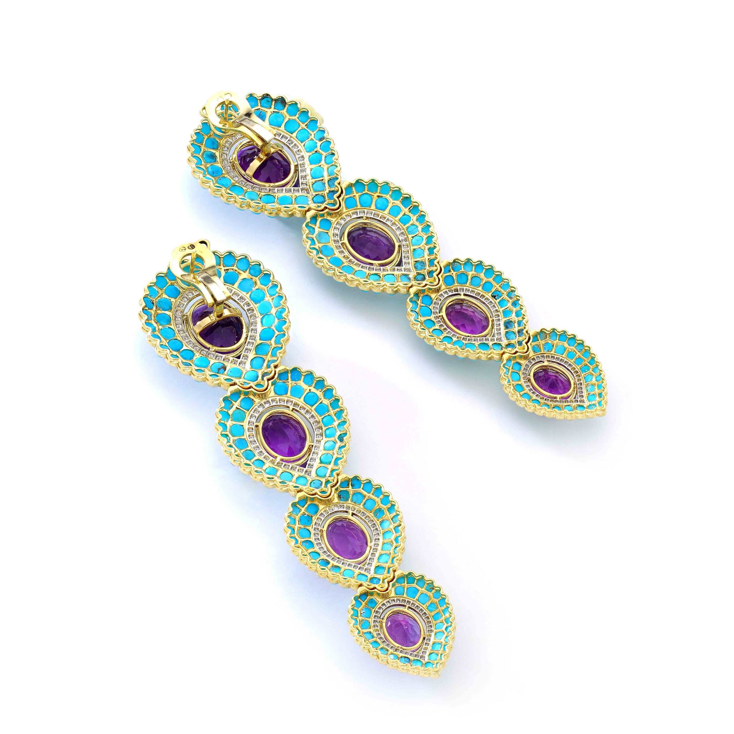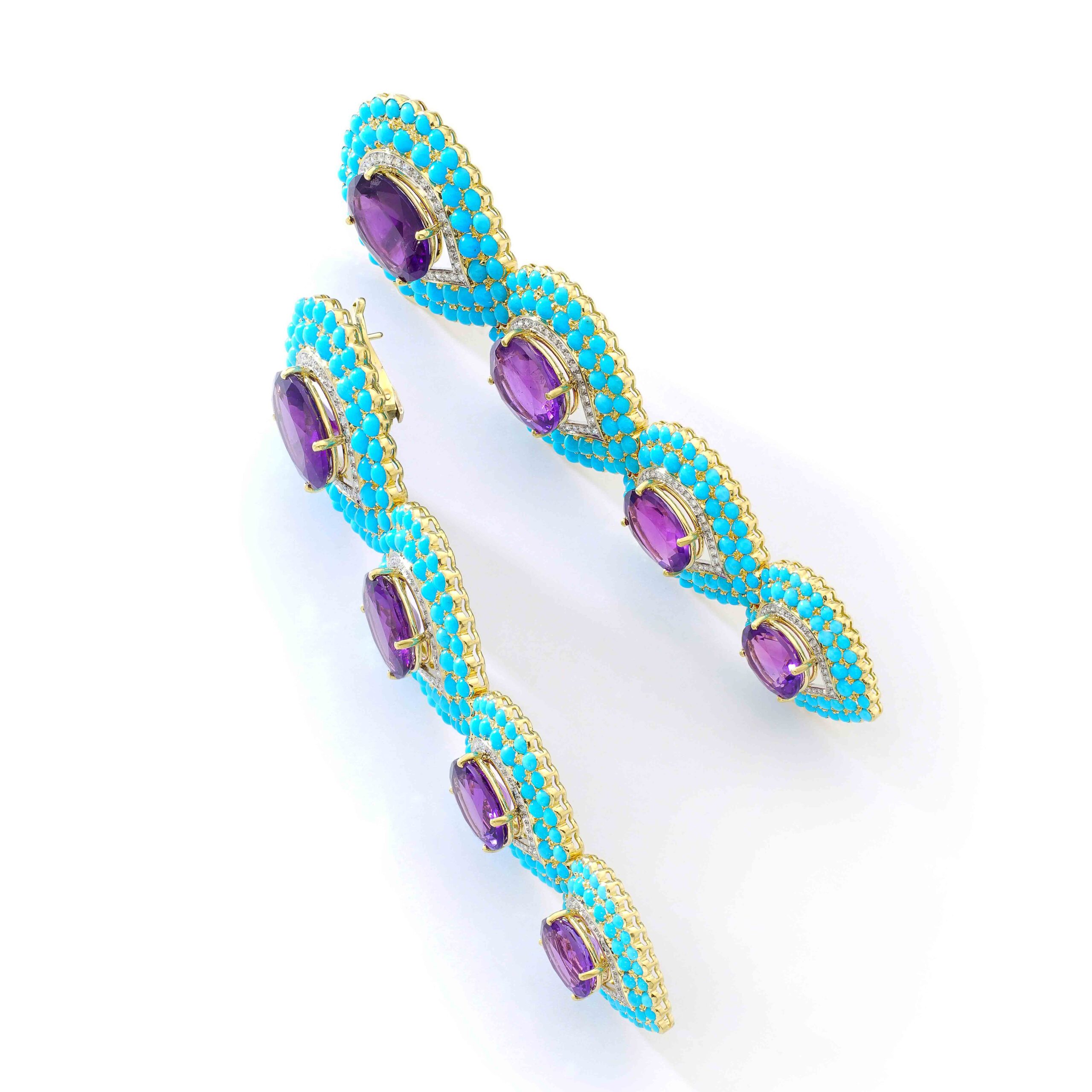 French Amethyst,Turquoise and Diamond Earrings. Crafted in Platinum and Yellow Gold 18K, each ear-pendant features a stunning oval amethyst weighing approximately 54.00 carats, radiating regal purple hues.