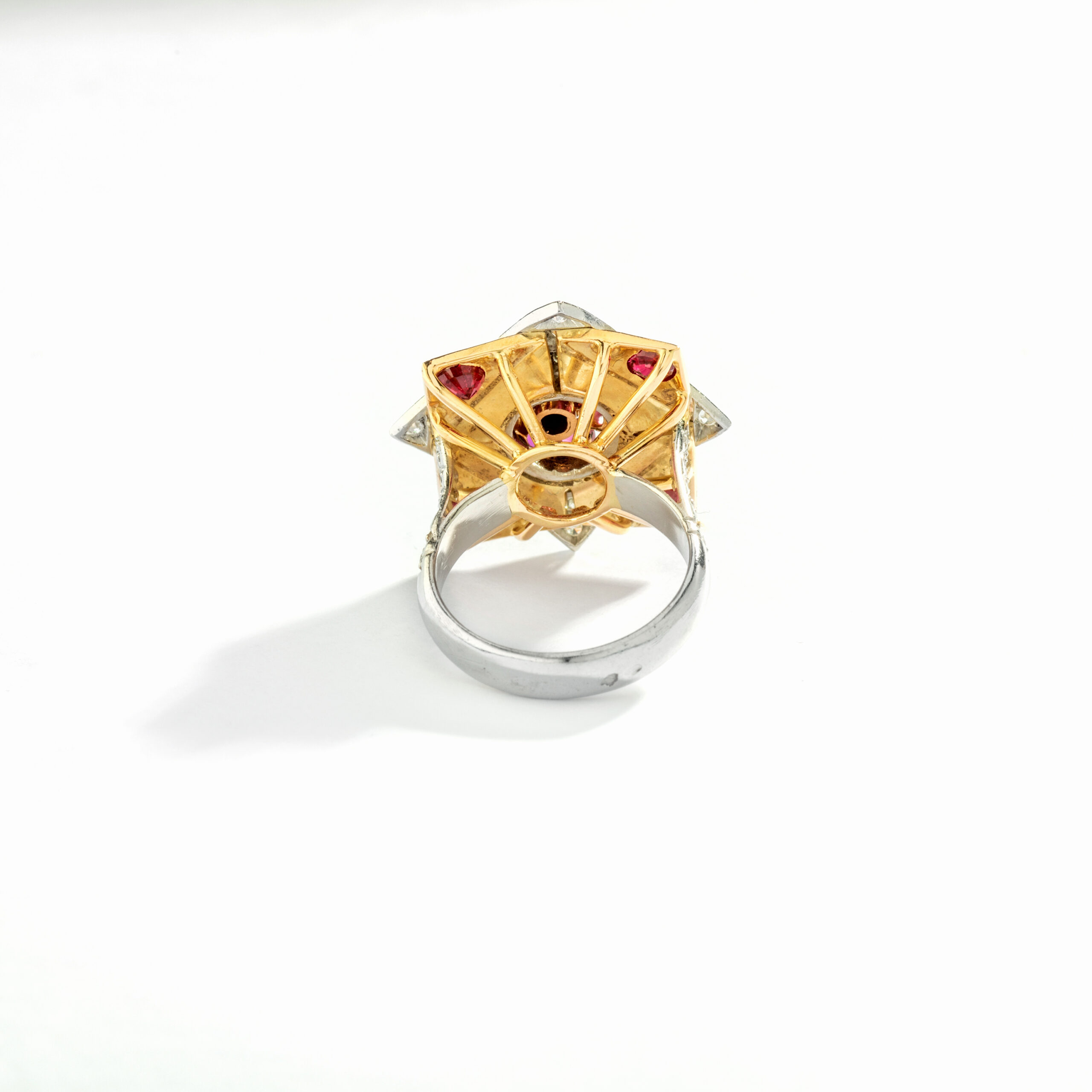 Stylized Flower star platinum and yellow gold 18k 75 ring with diamond and ruby.