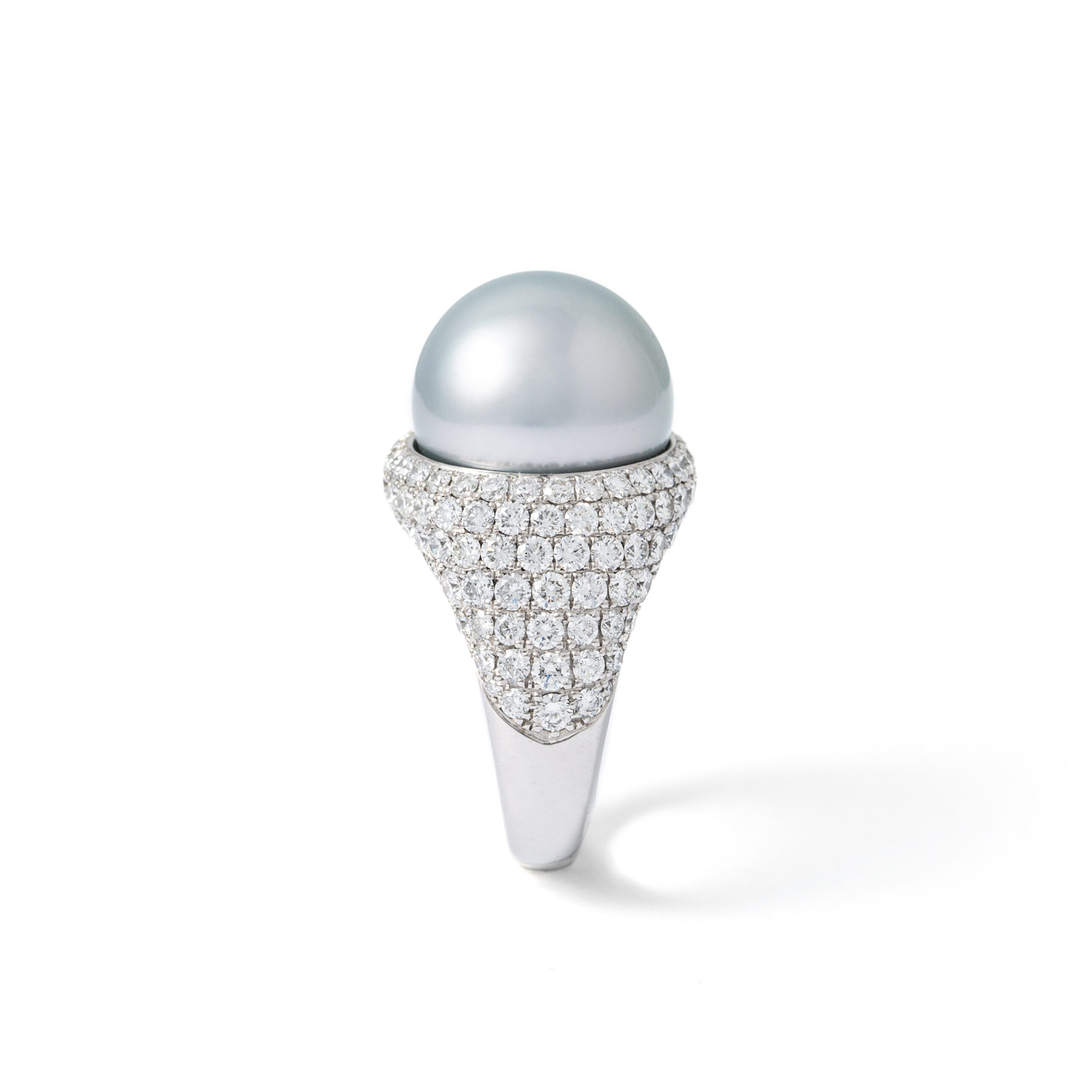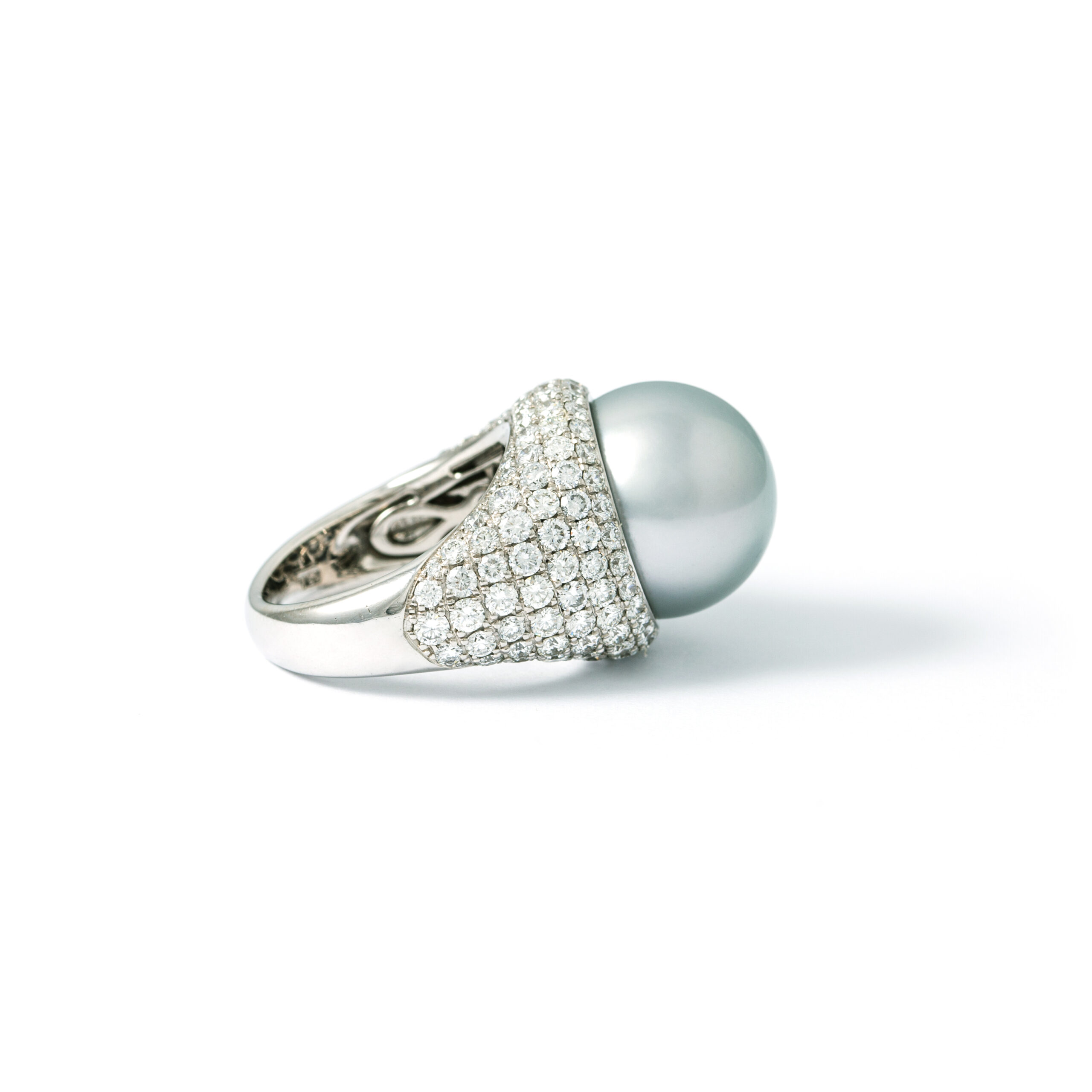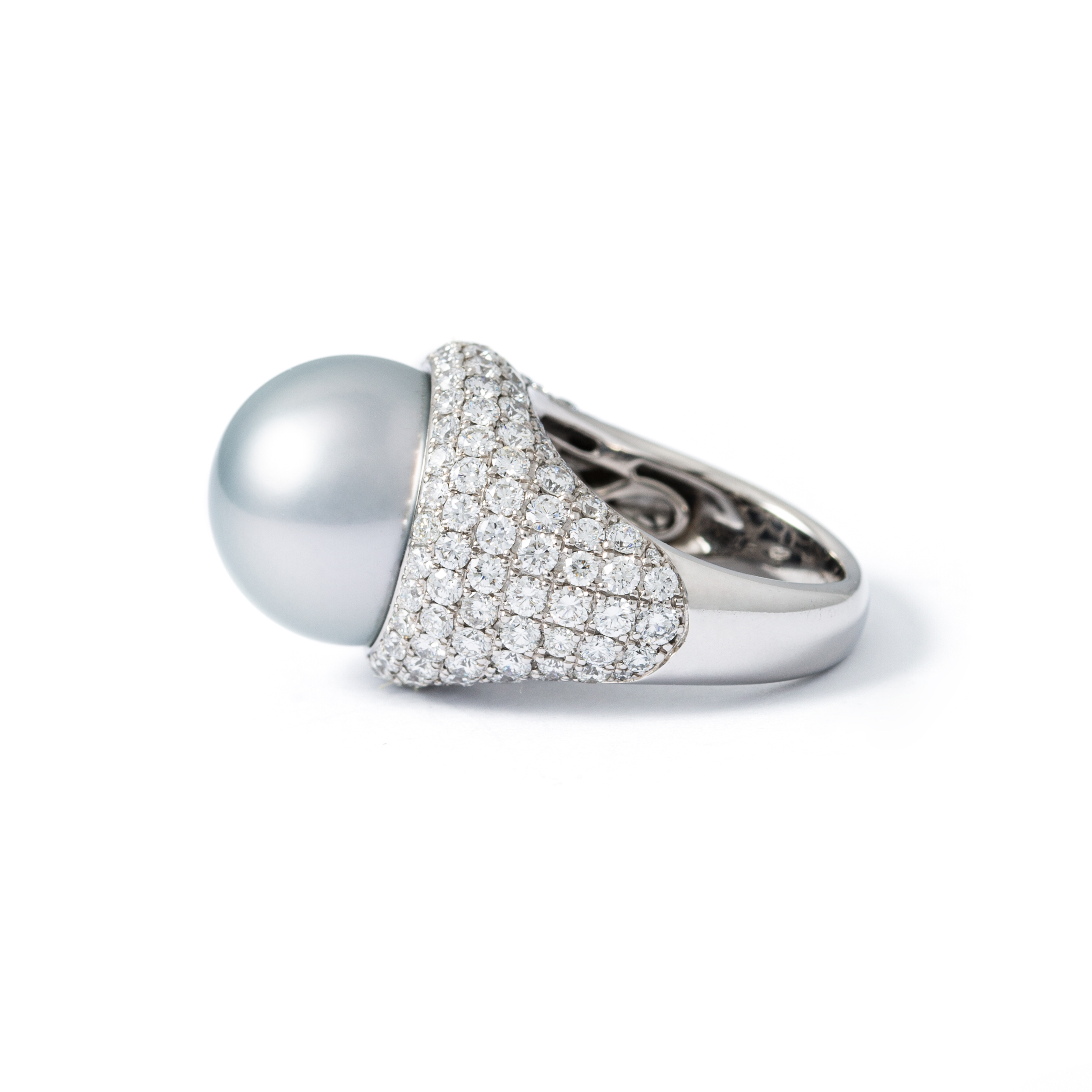 Ring in 18kt white gold set with one grey pearl and 151 diamonds 3.39 cts