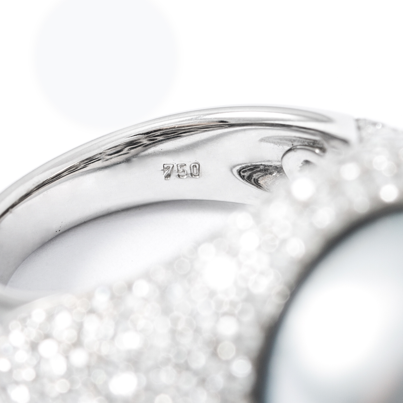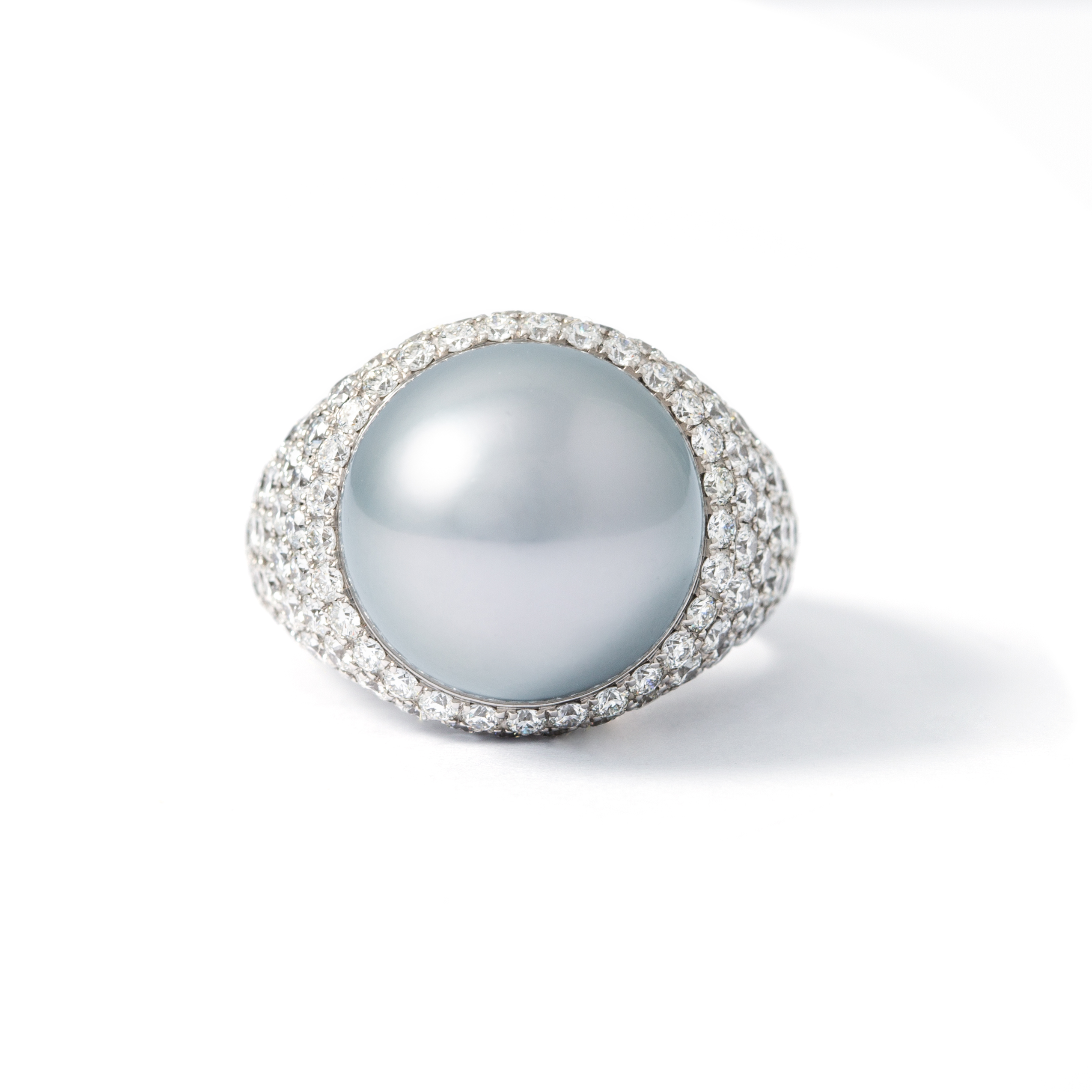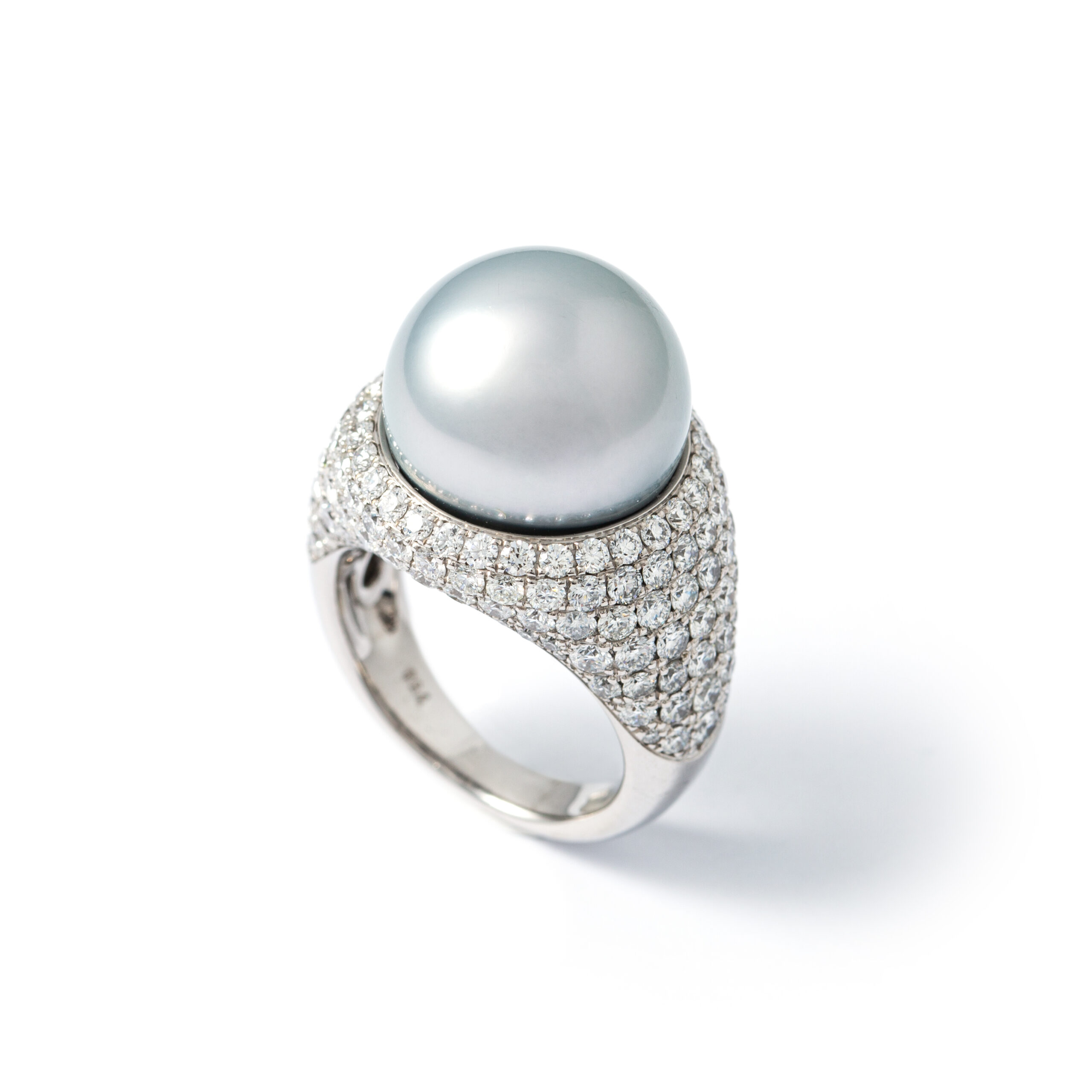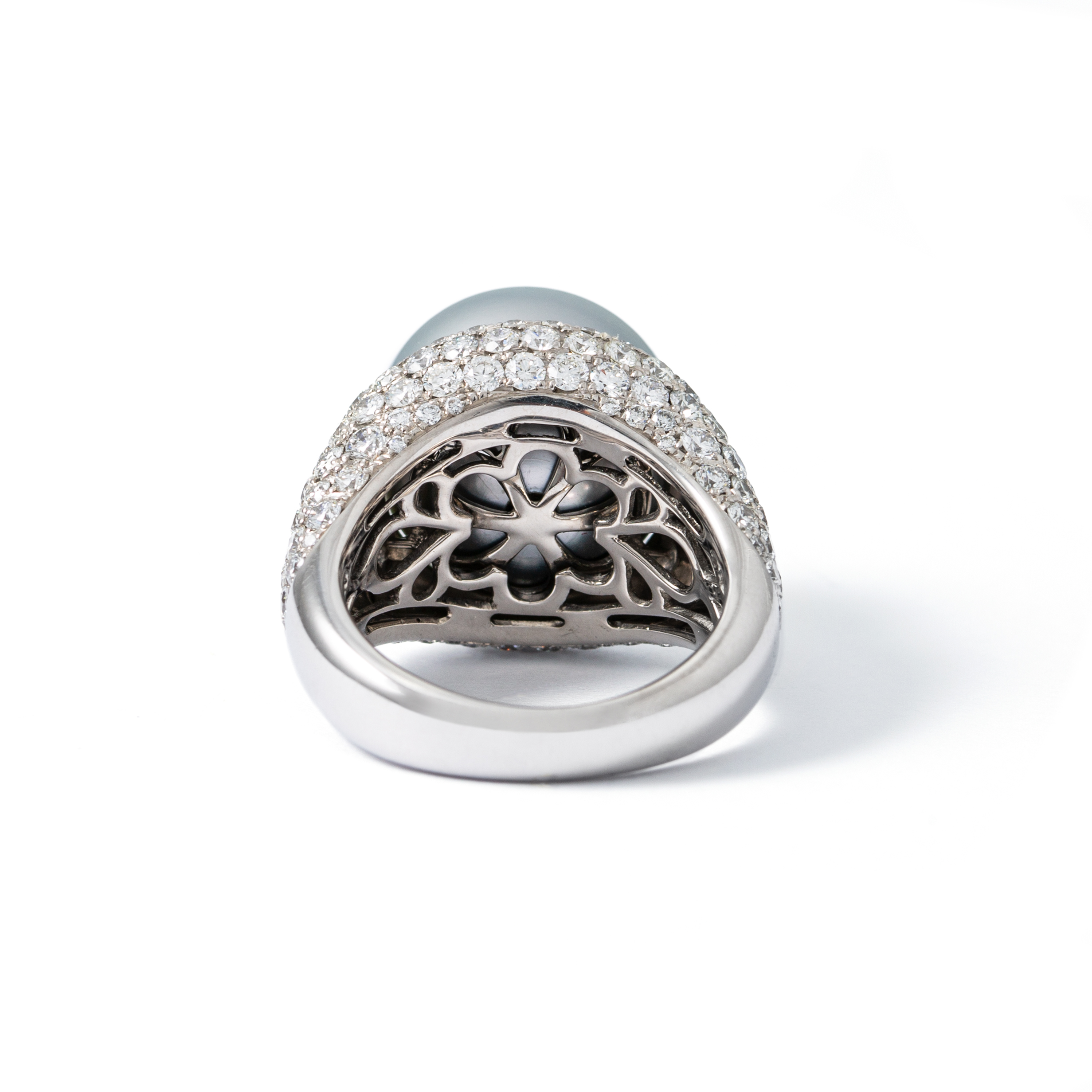 Ring in 18kt white gold set with one grey pearl and 151 diamonds 3.39 cts