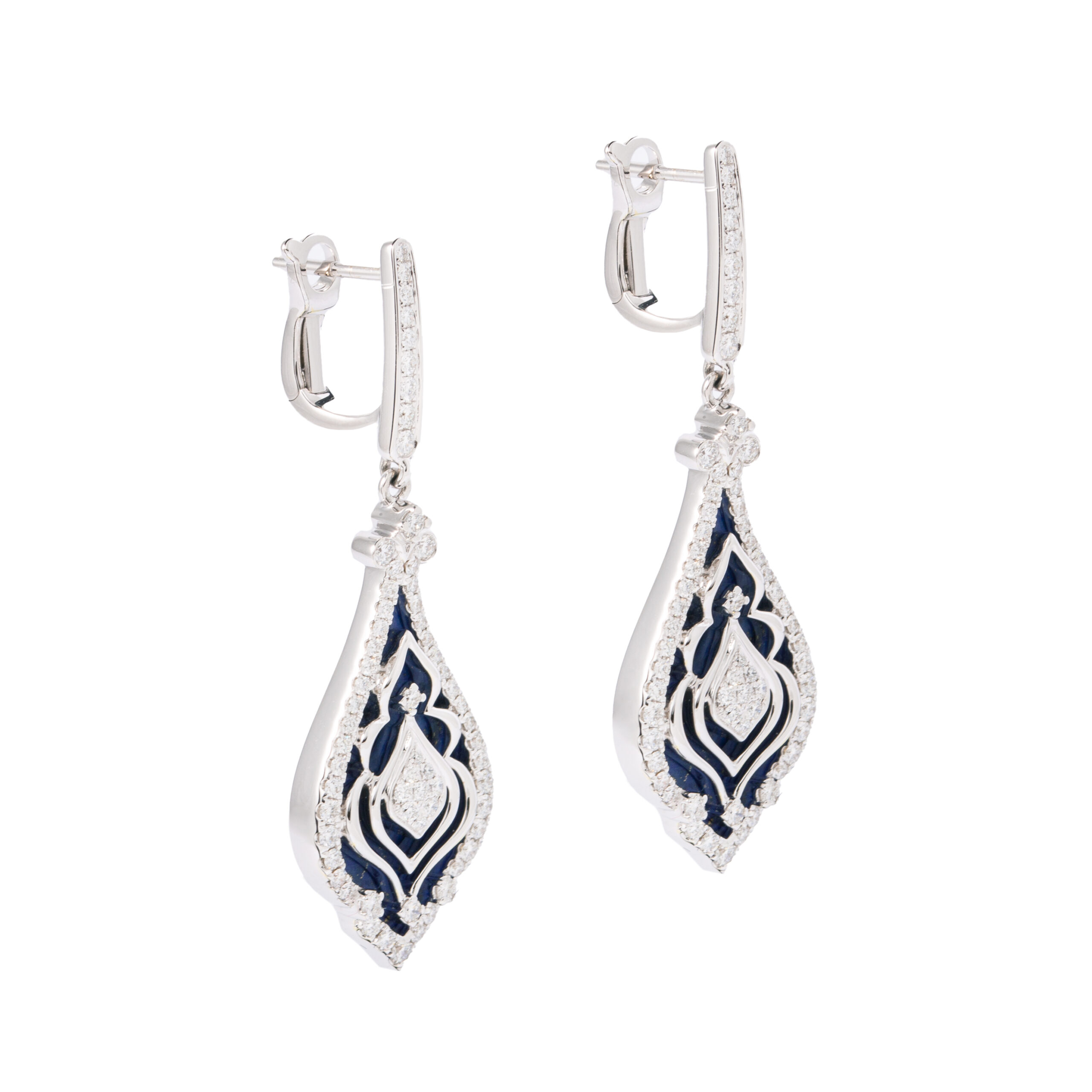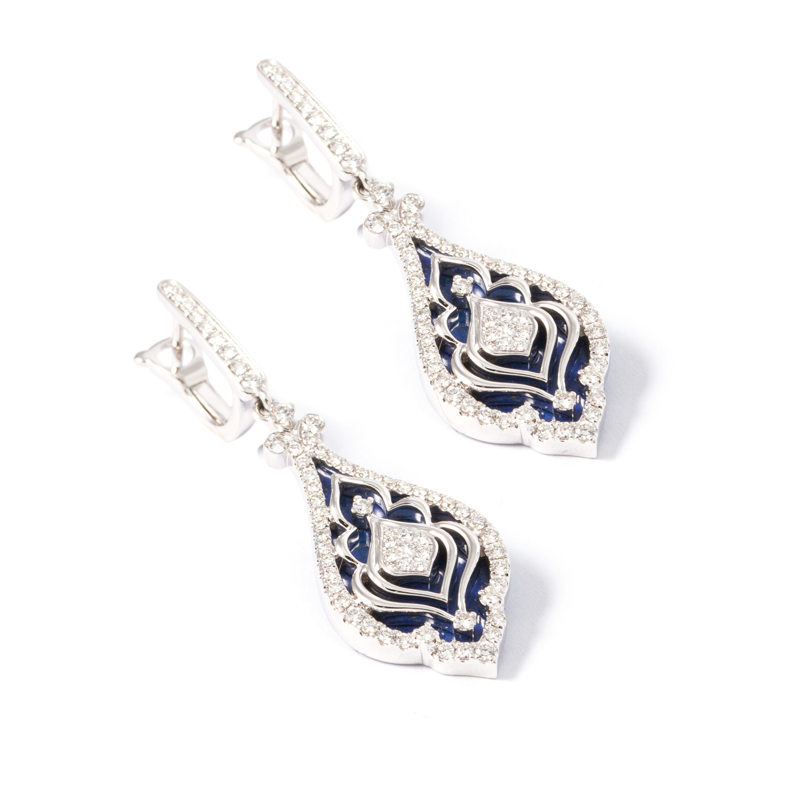 Earrings in 18kt white gold set with 128 diamonds 1.14 cts and 2 lapis lazuli 5.09 cts