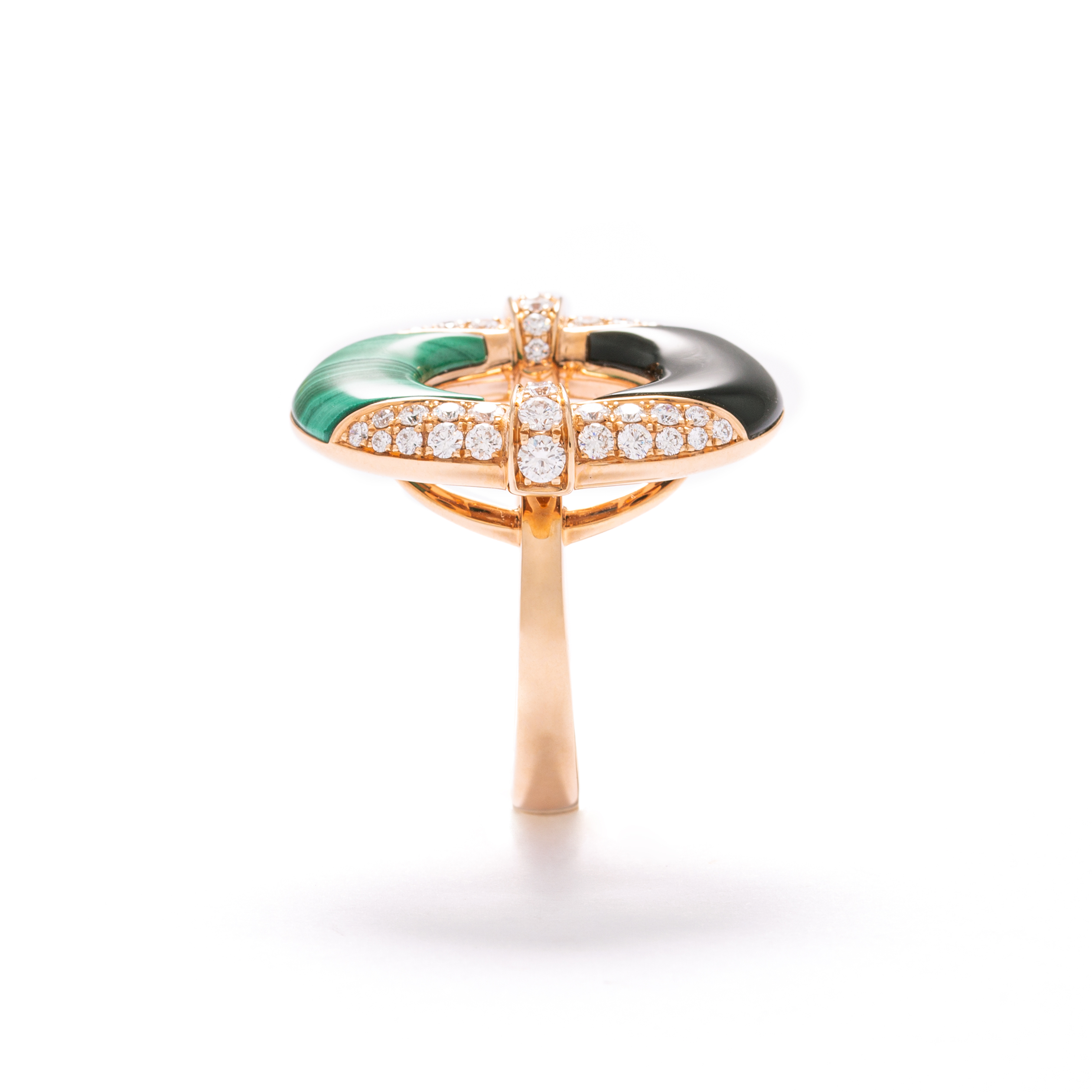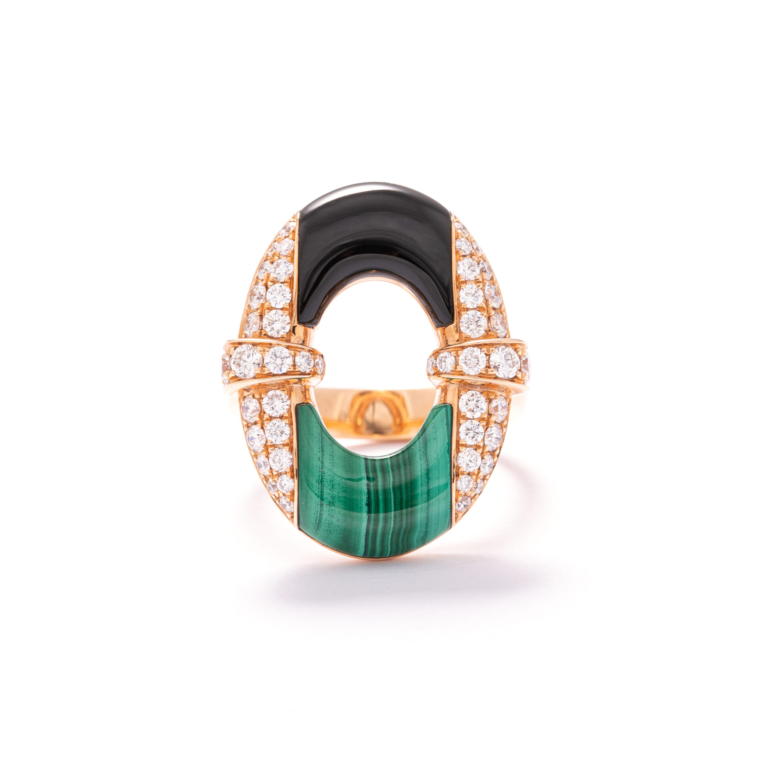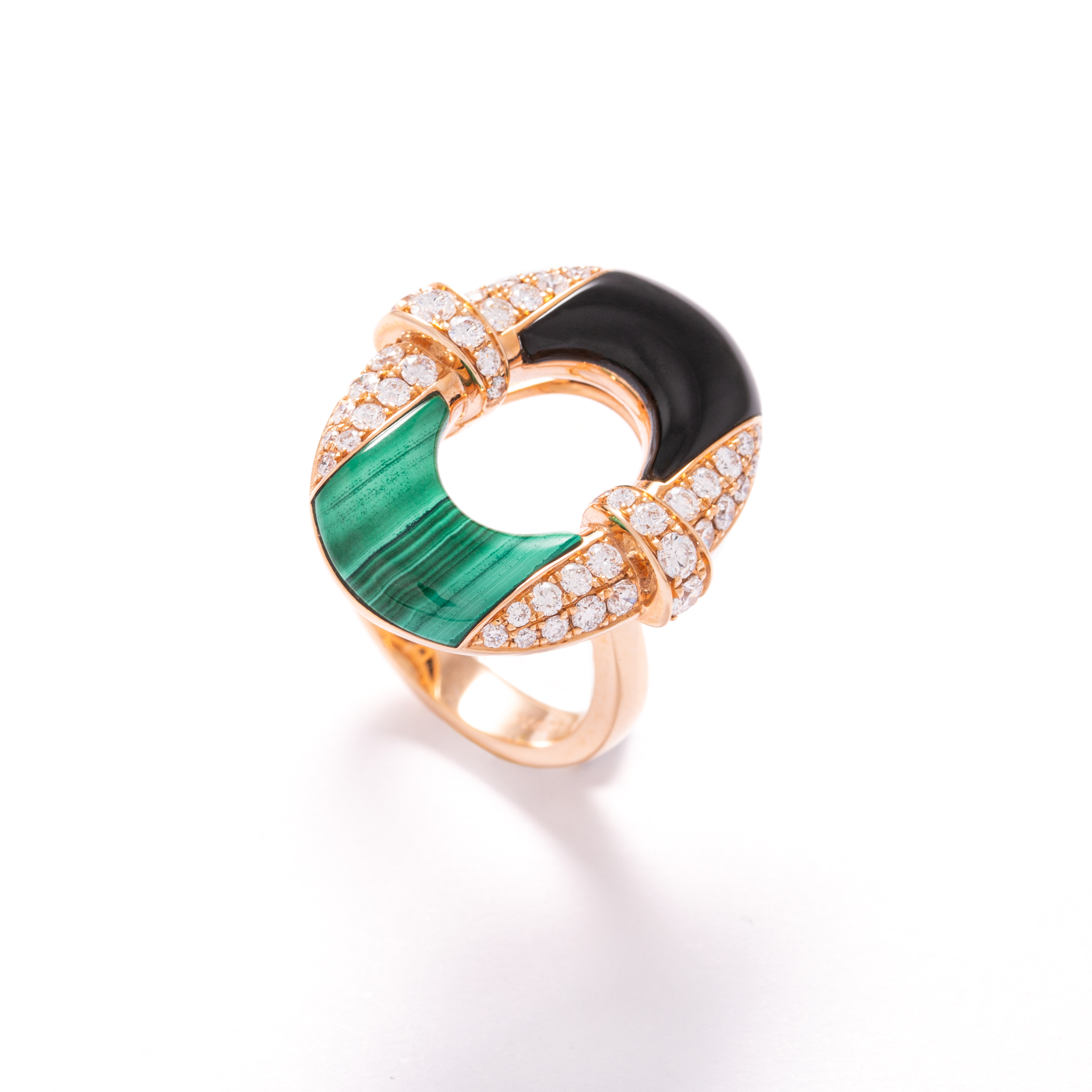 Ring in 18kt pink gold set with 46 diamonds 0.92 cts, one onyx 1.90 cts and one malachite 2.80 cts