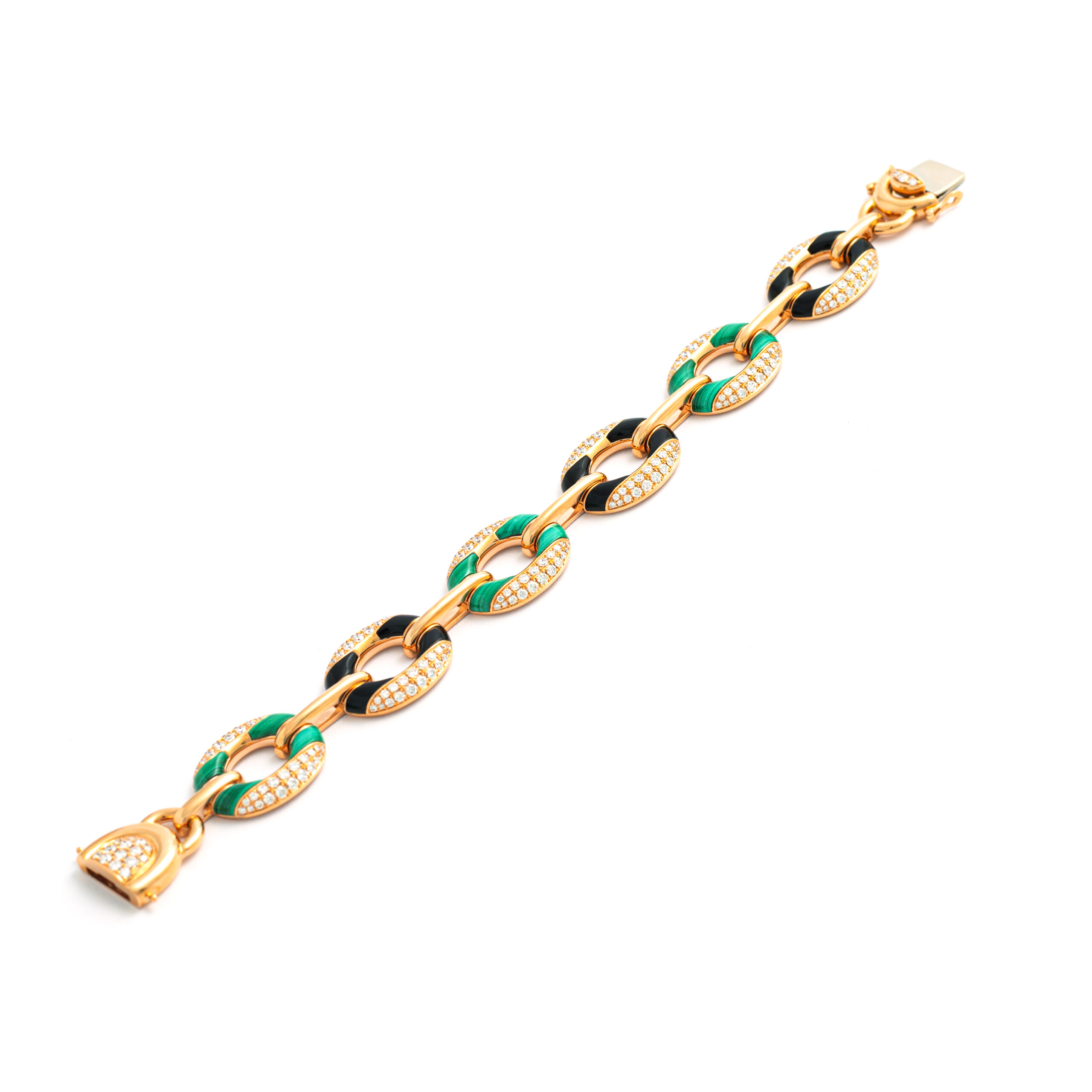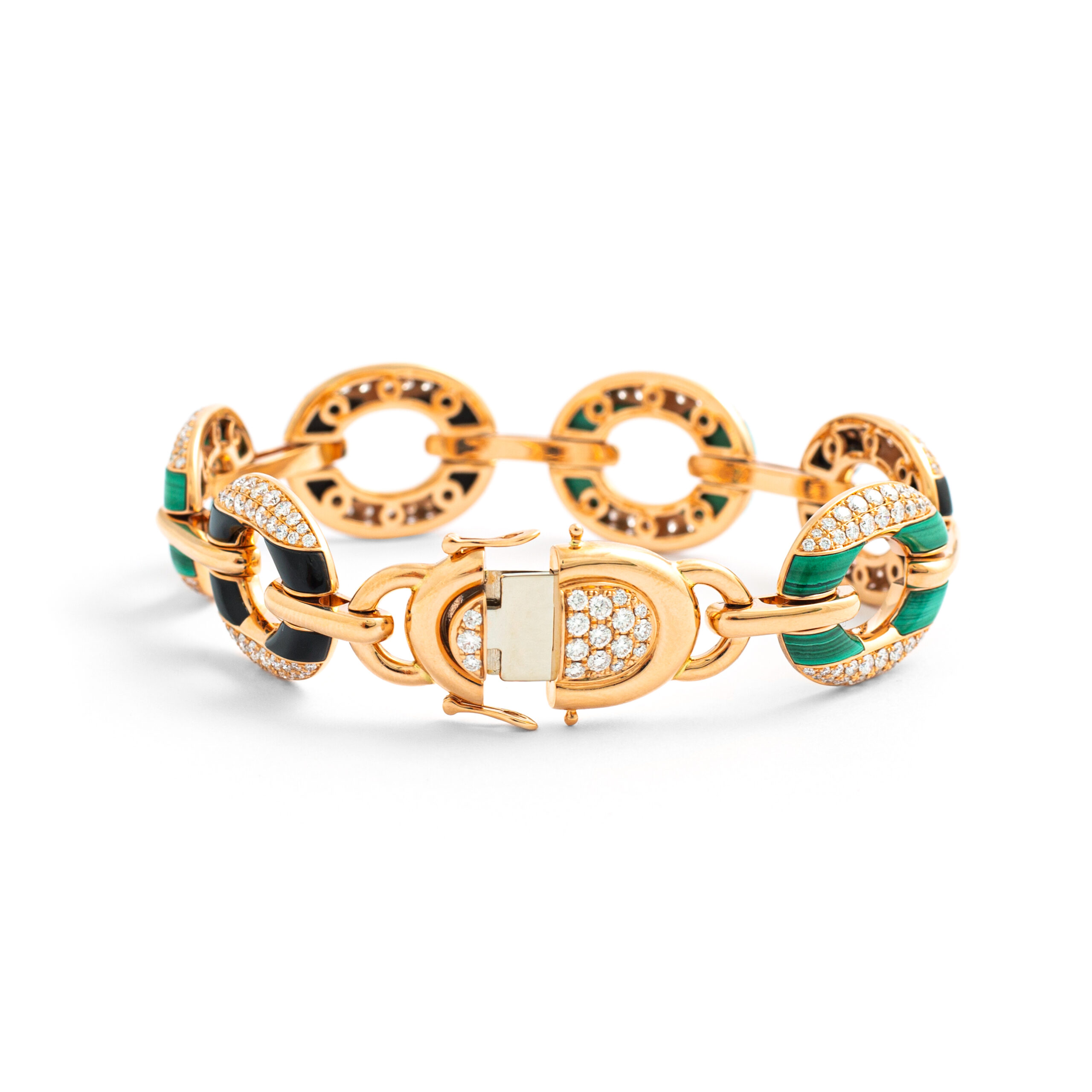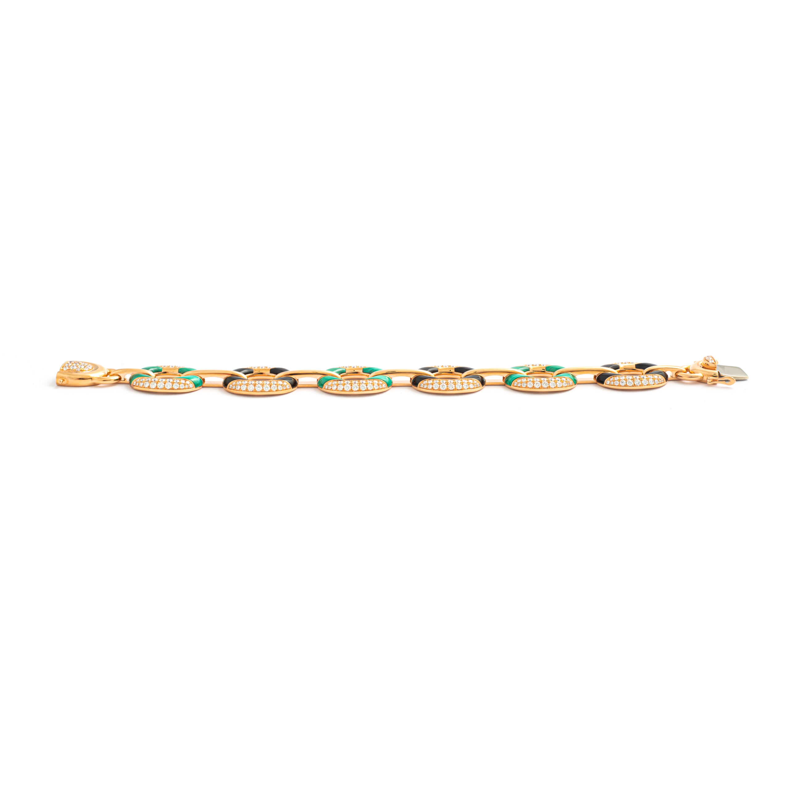 Bracelet in 18kt pink gold set with 257 diamonds 3.75 cts, 12 onyx 5.30 cts and 12 malachites 7.70 cts
