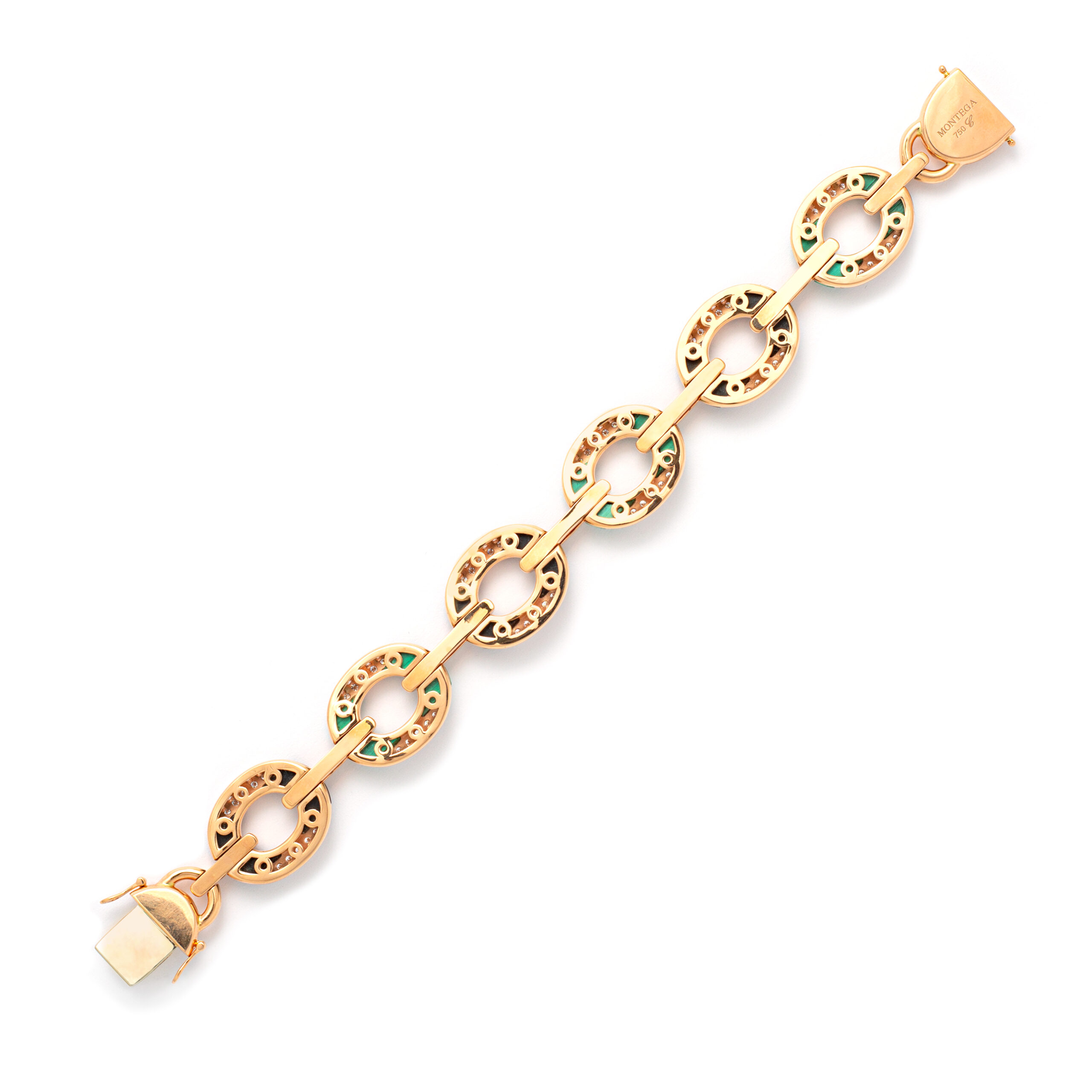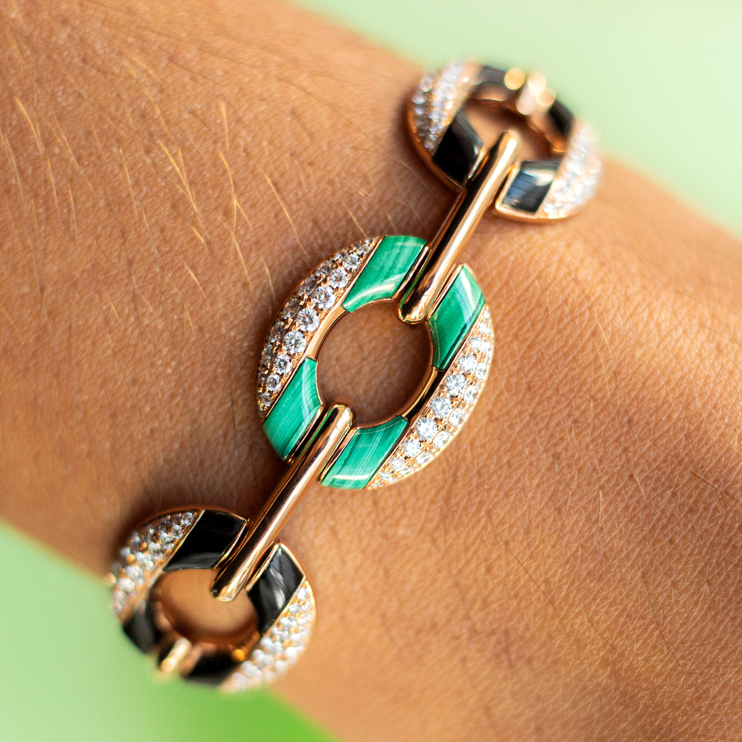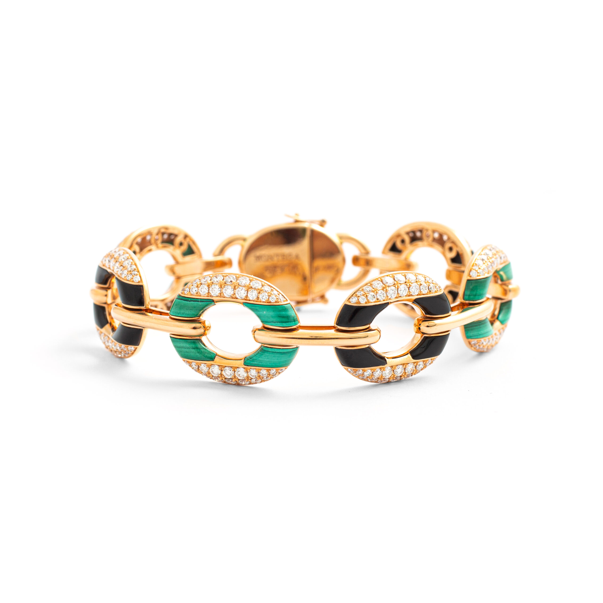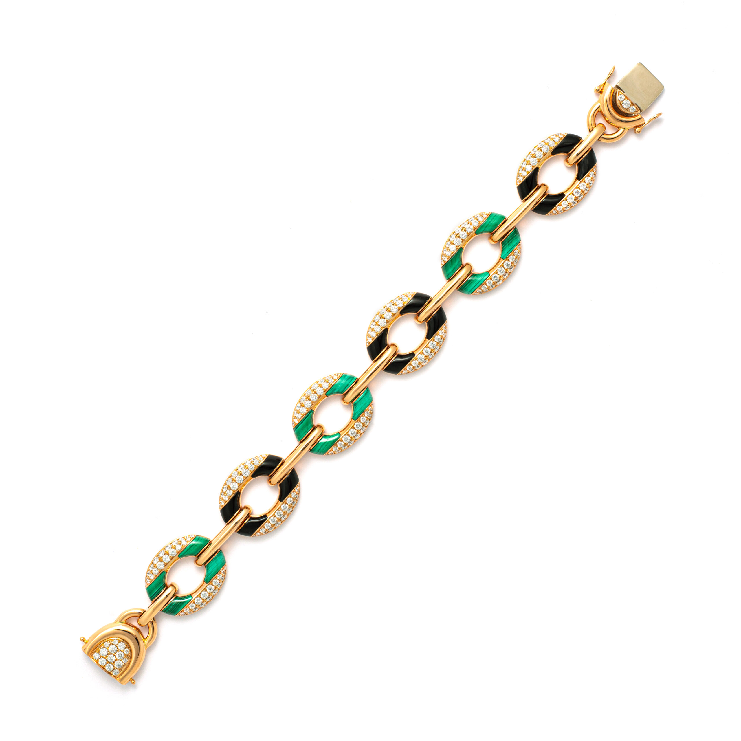 Bracelet in 18kt pink gold set with 257 diamonds 3.75 cts, 12 onyx 5.30 cts and 12 malachites 7.70 cts