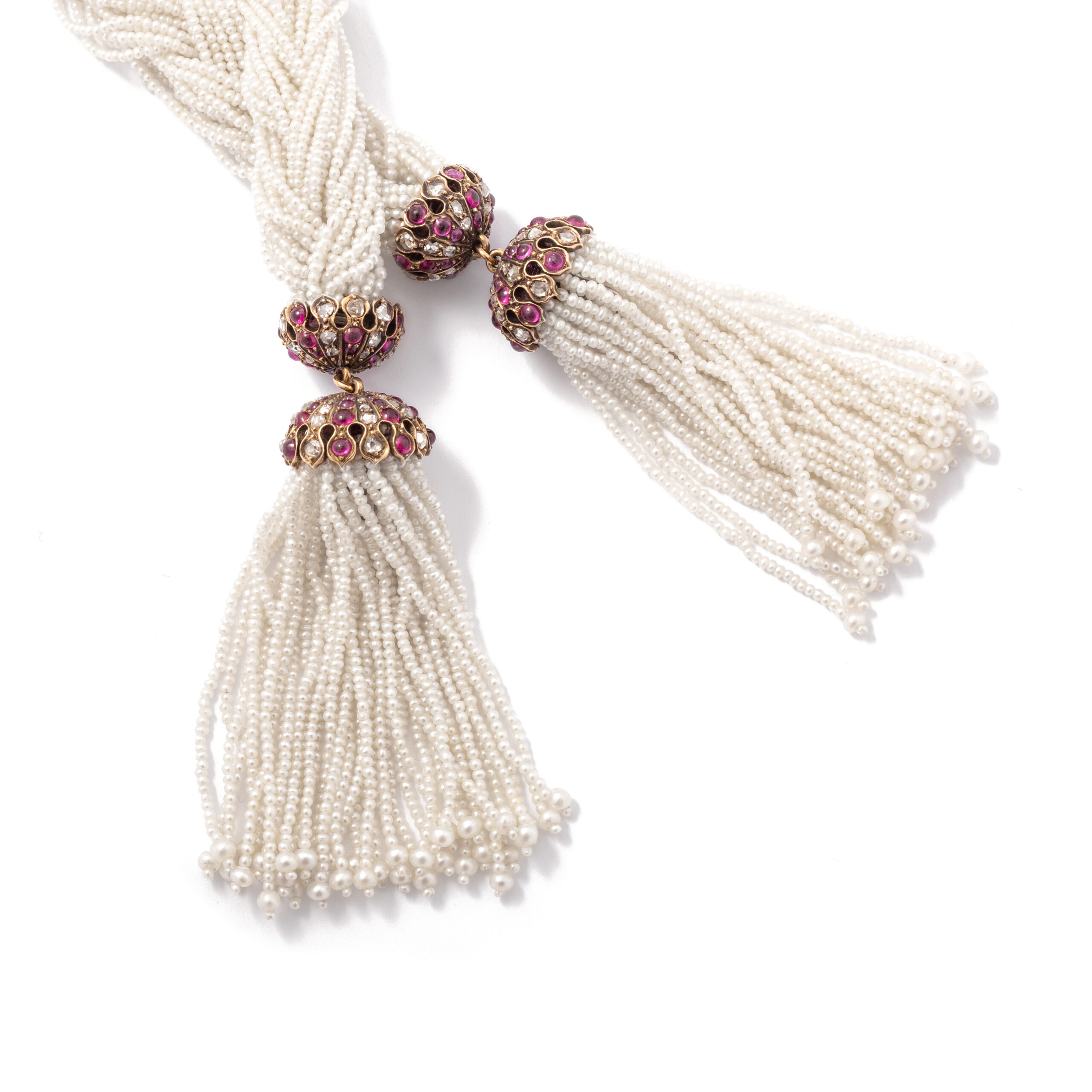This necklace is a Haute-Couture dress. Natural pearl braid necklace composed by two suspending pendants in yellow gold 18k 750 surrounded by cabochon ruby and rose-cut diamond. Early XXth Century.