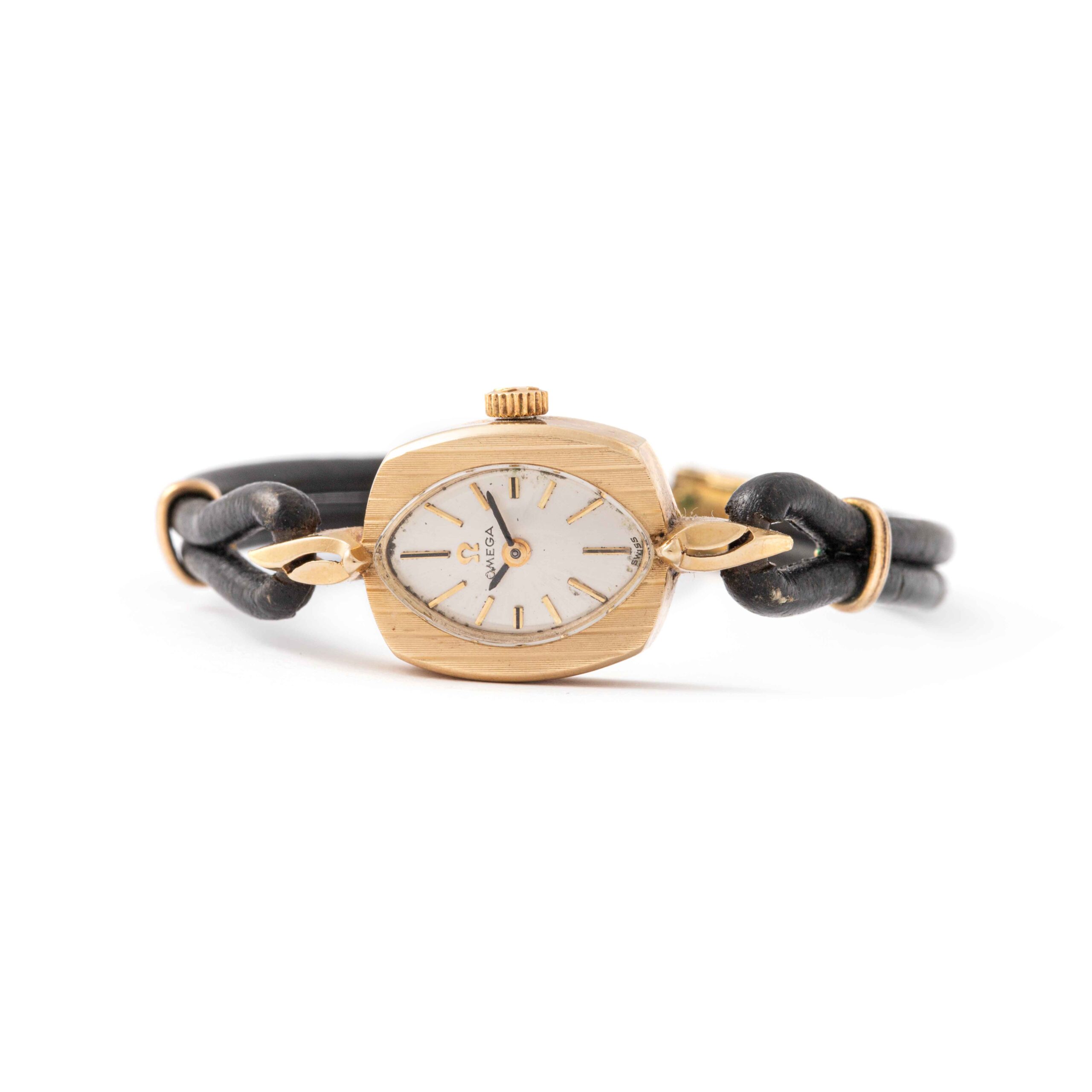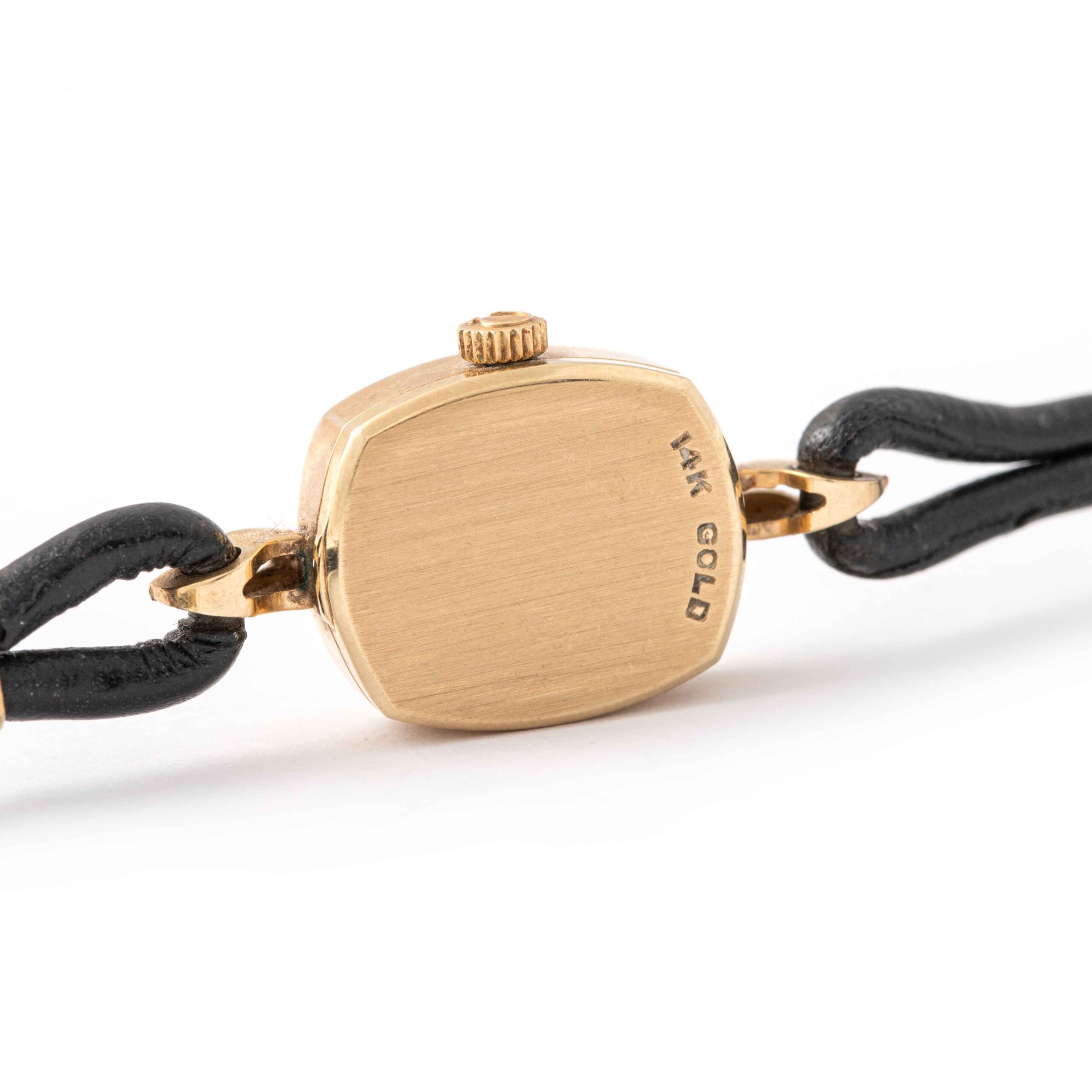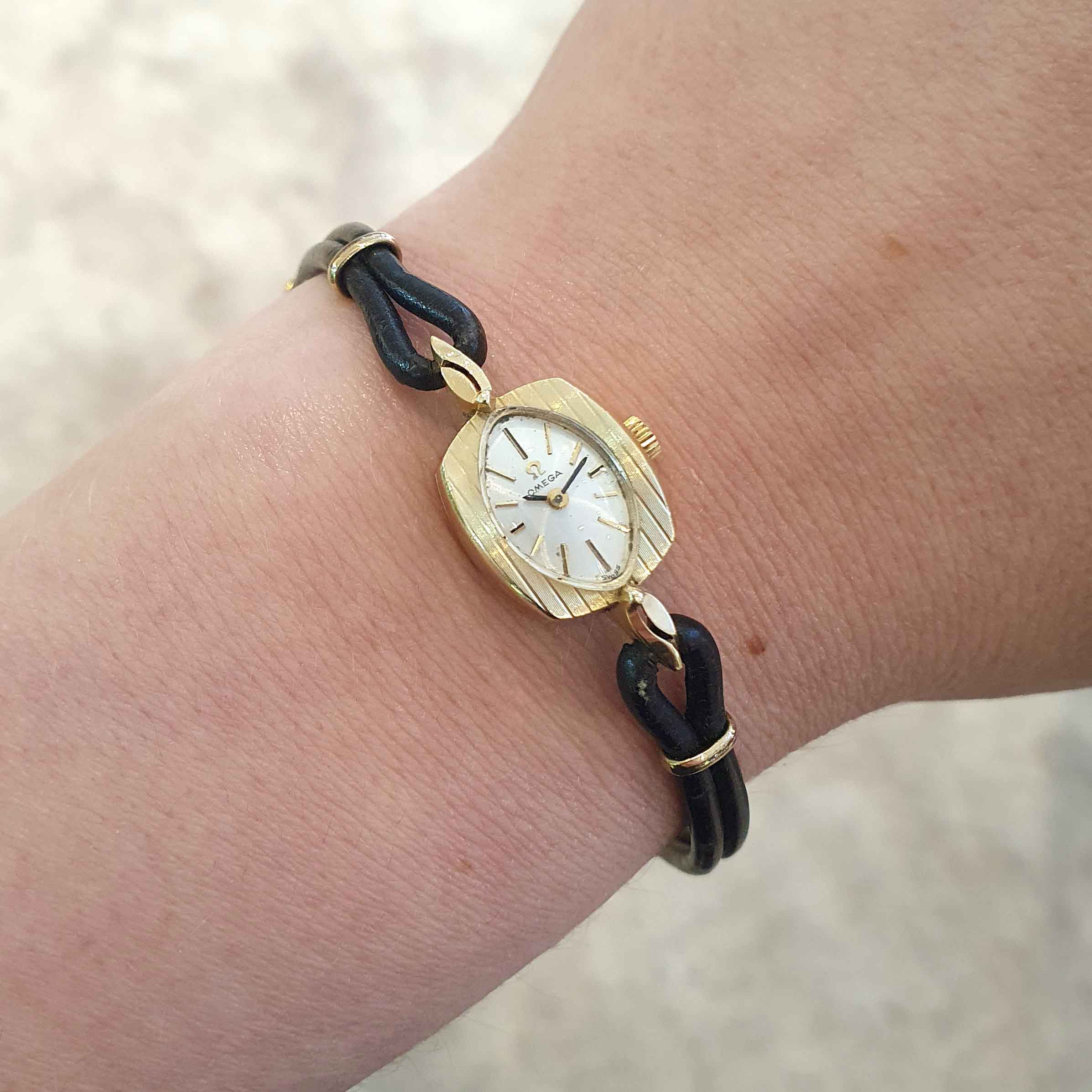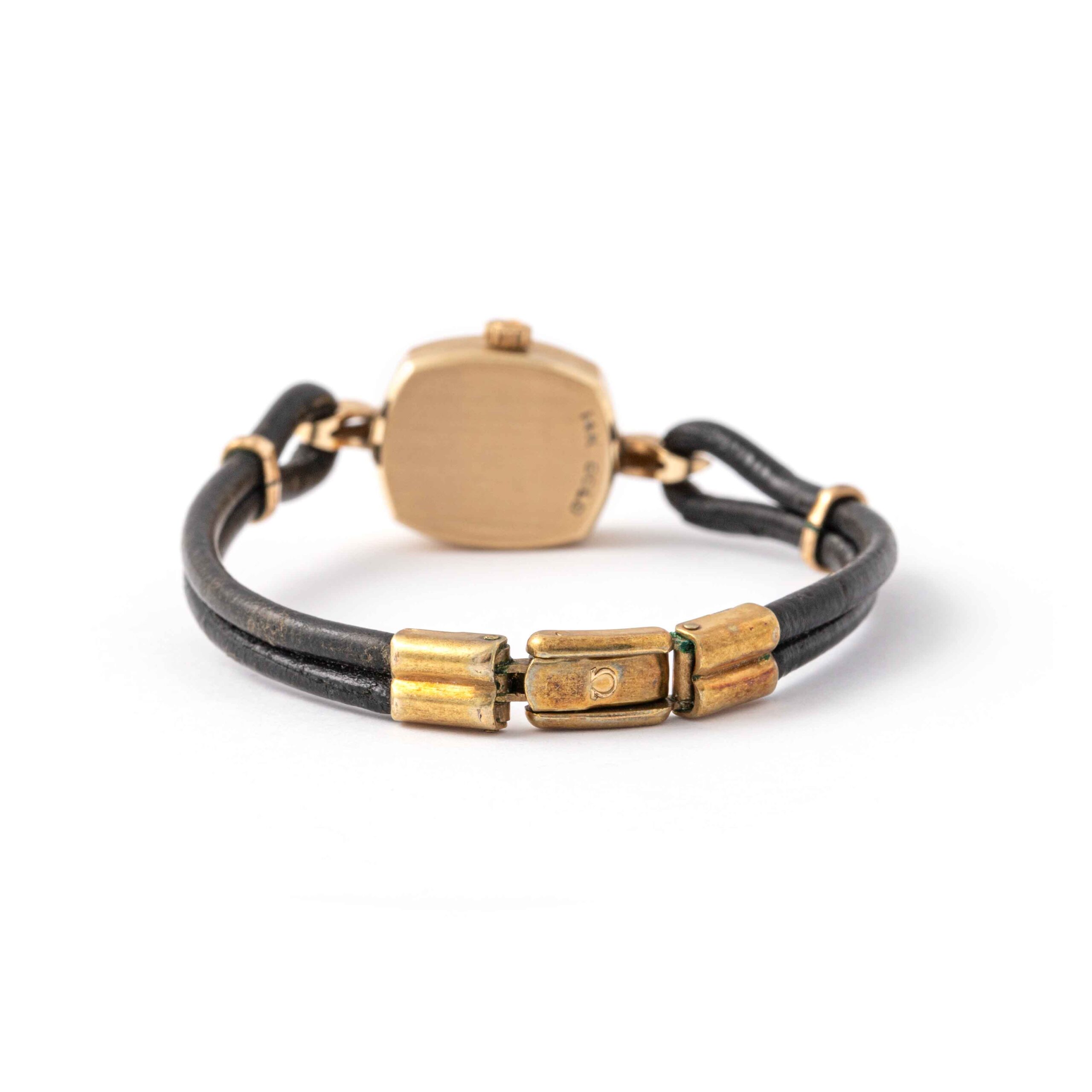 Omega Cocktail Gold 14K Wristwatch.This elegant Omega Cocktail wristwatch, circa 1950, features a 14K gold case and a sophisticated leather strap.