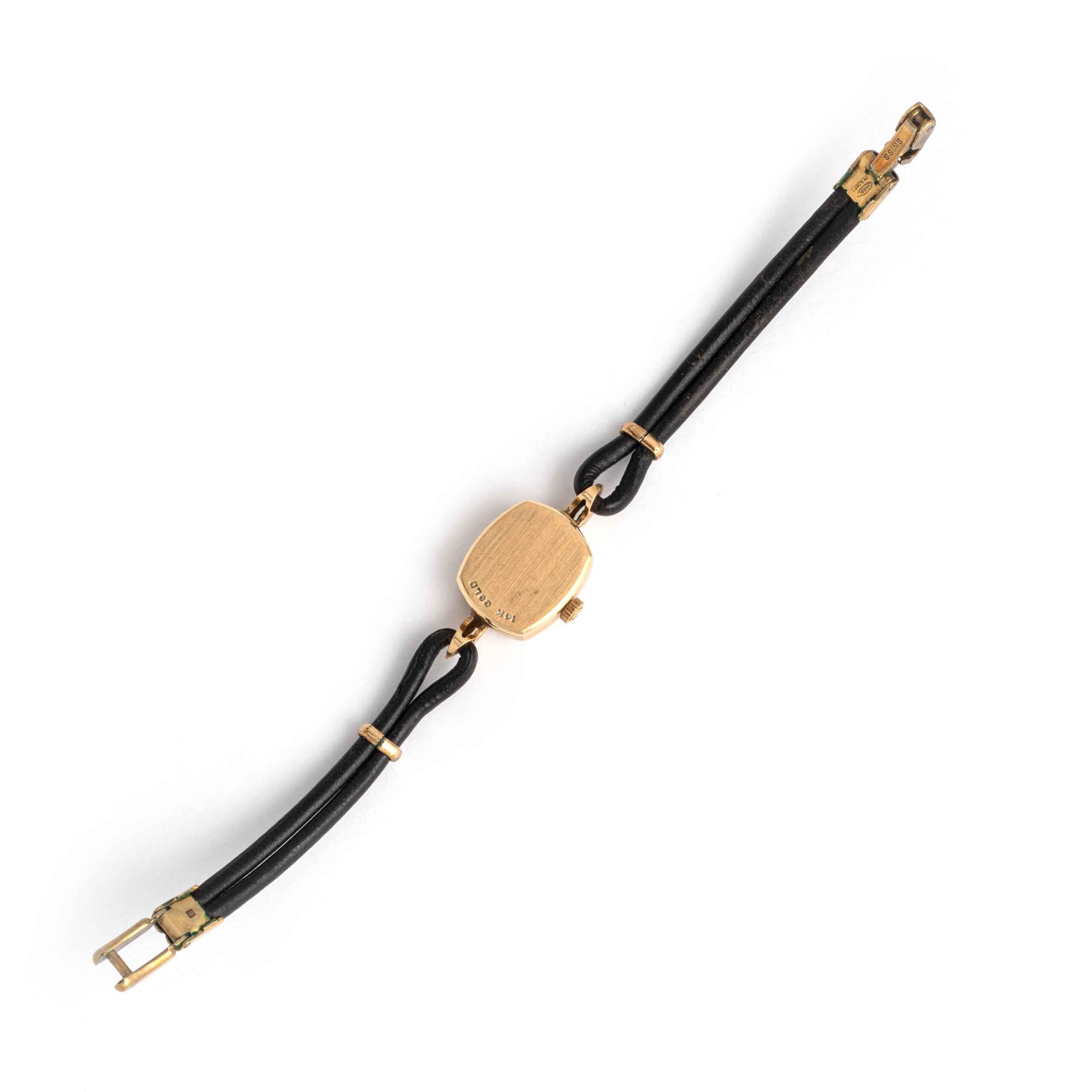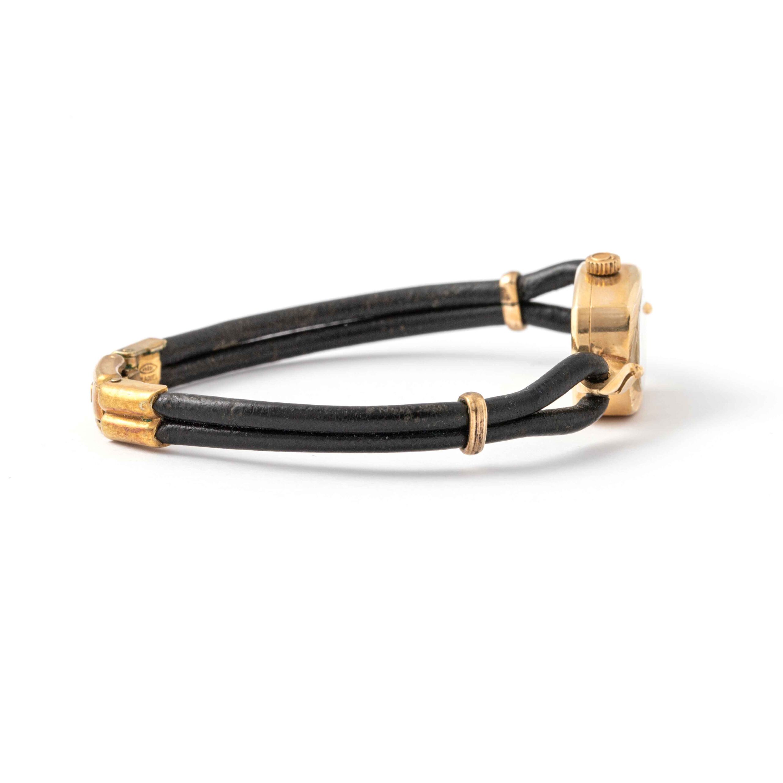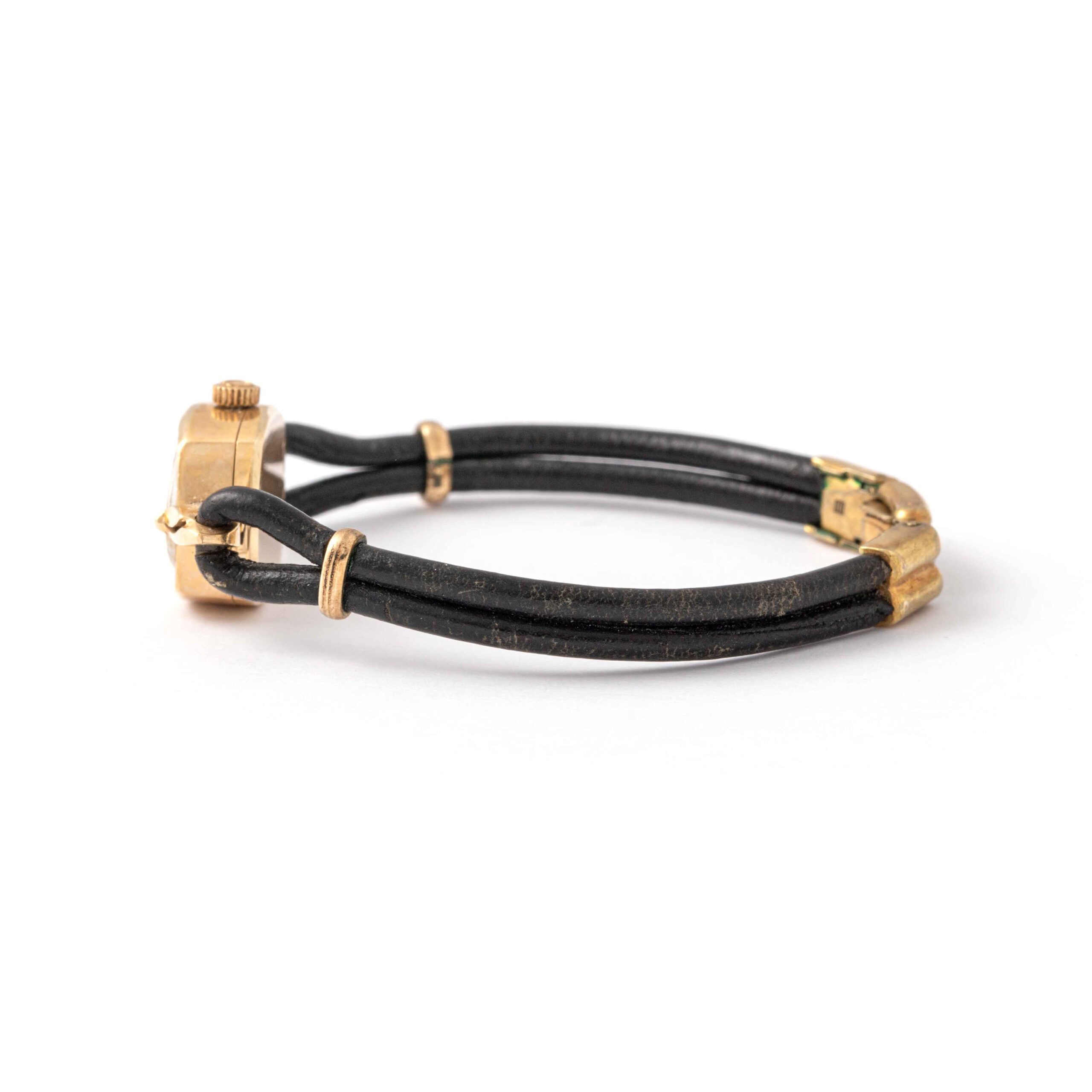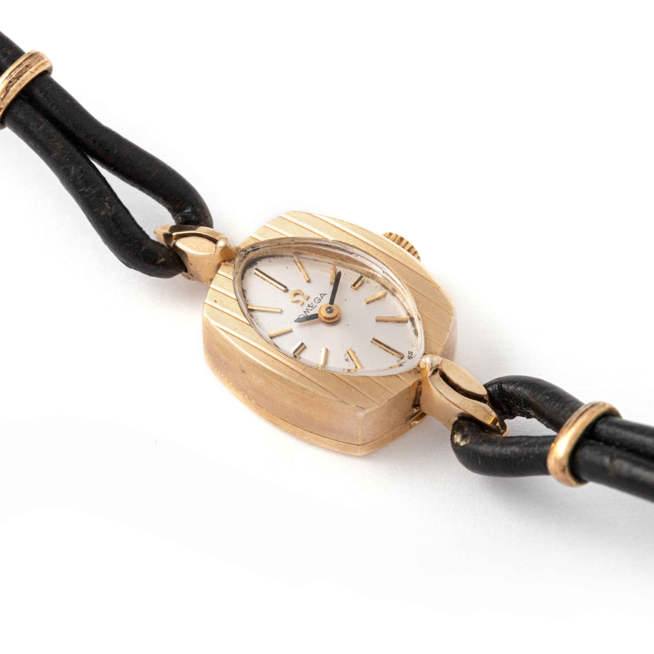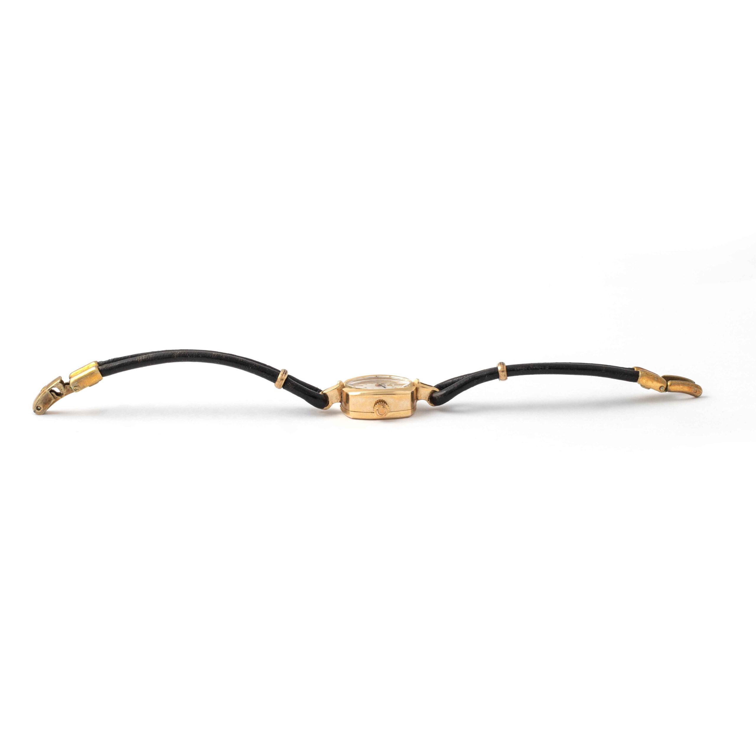 Omega Cocktail Gold 14K Wristwatch.This elegant Omega Cocktail wristwatch, circa 1950, features a 14K gold case and a sophisticated leather strap.