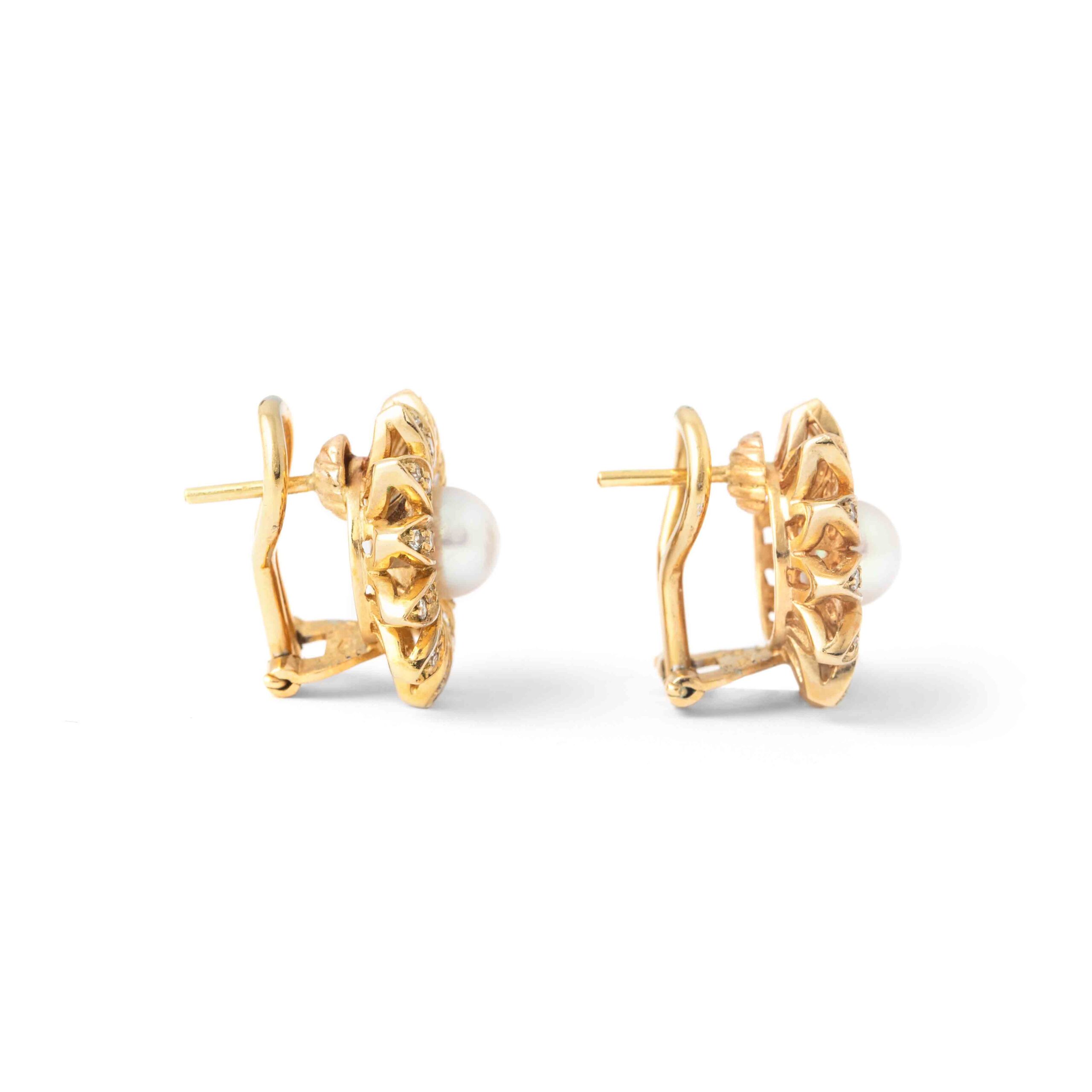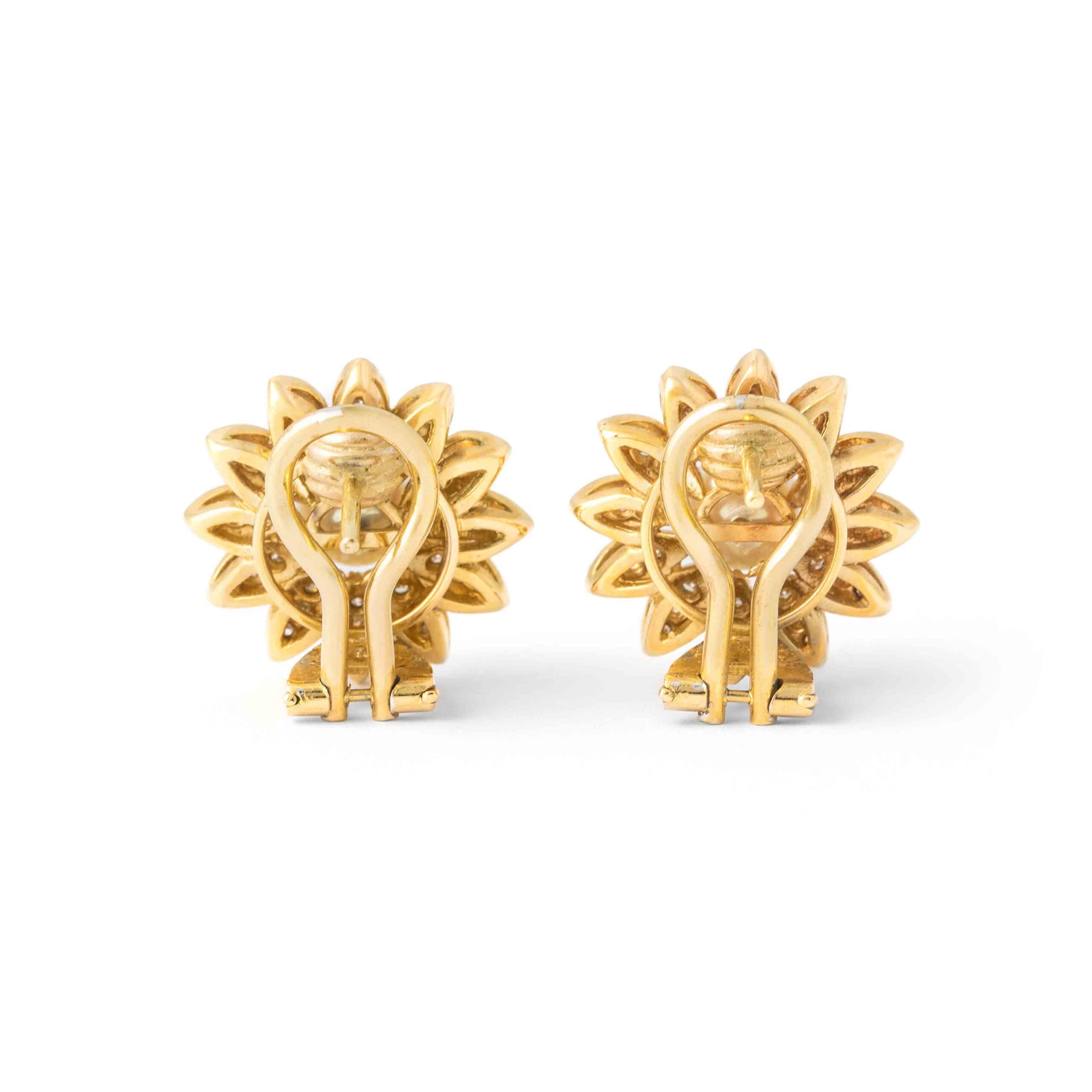 Introducing our exquisite Cultured Pearl and Diamond Yellow Gold 18K Flower Ear Clips. Each ear clip features a lustrous cultured pearl elegantly framed by a radiant diamond center, set in luxurious 18K yellow gold with a delicate floral design.