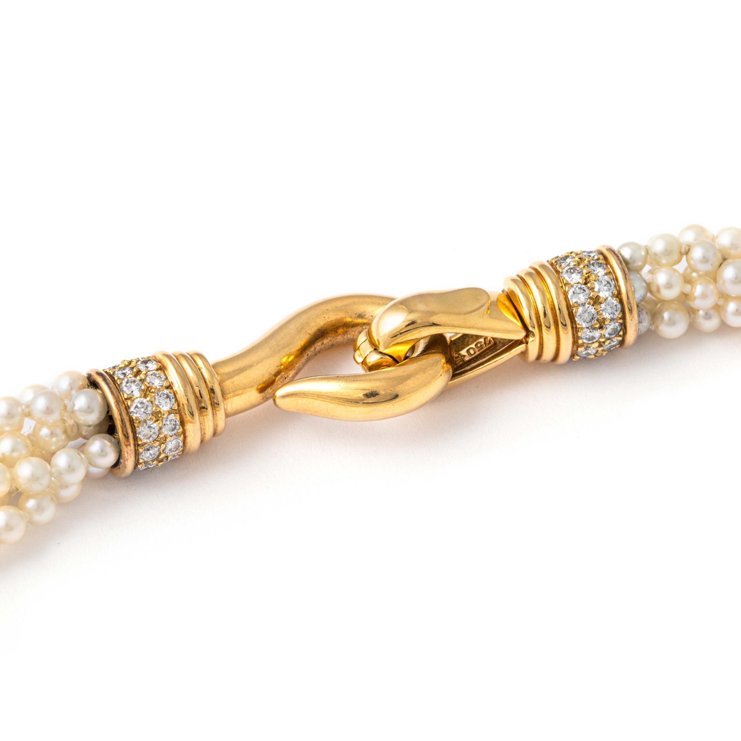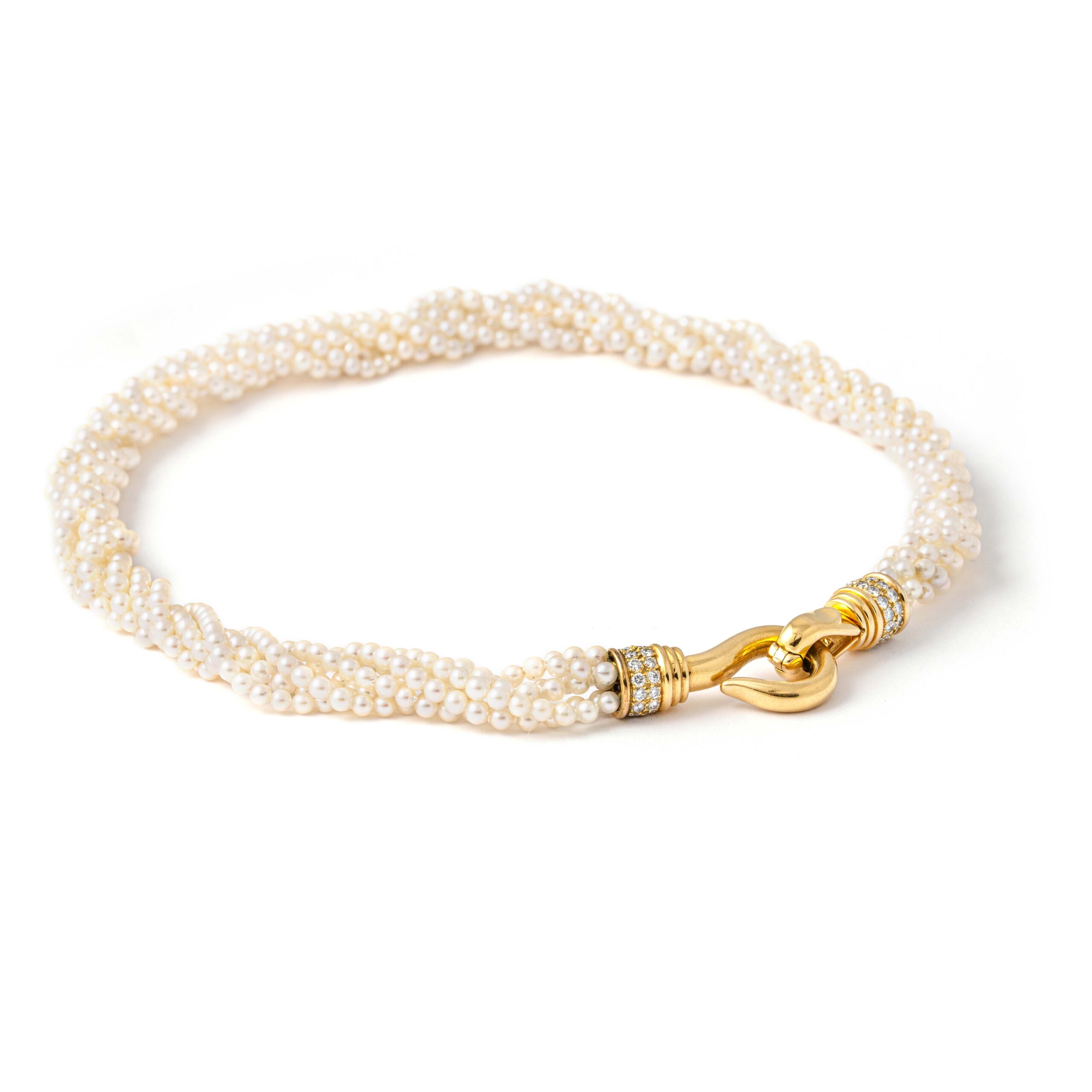 The multi-strand design adds a dynamic and luxurious dimension to the necklace, providing a rich and textured look that drapes gracefully around the neckline. Whether worn for a special occasion or as a symbol of everyday glamour, this Cultured Pearl Necklace with a Diamond Yellow Gold 18K clasp is a testament to the enduring beauty of pearls and the timeless allure of diamonds, making it a cherished addition to any jewelry collection.