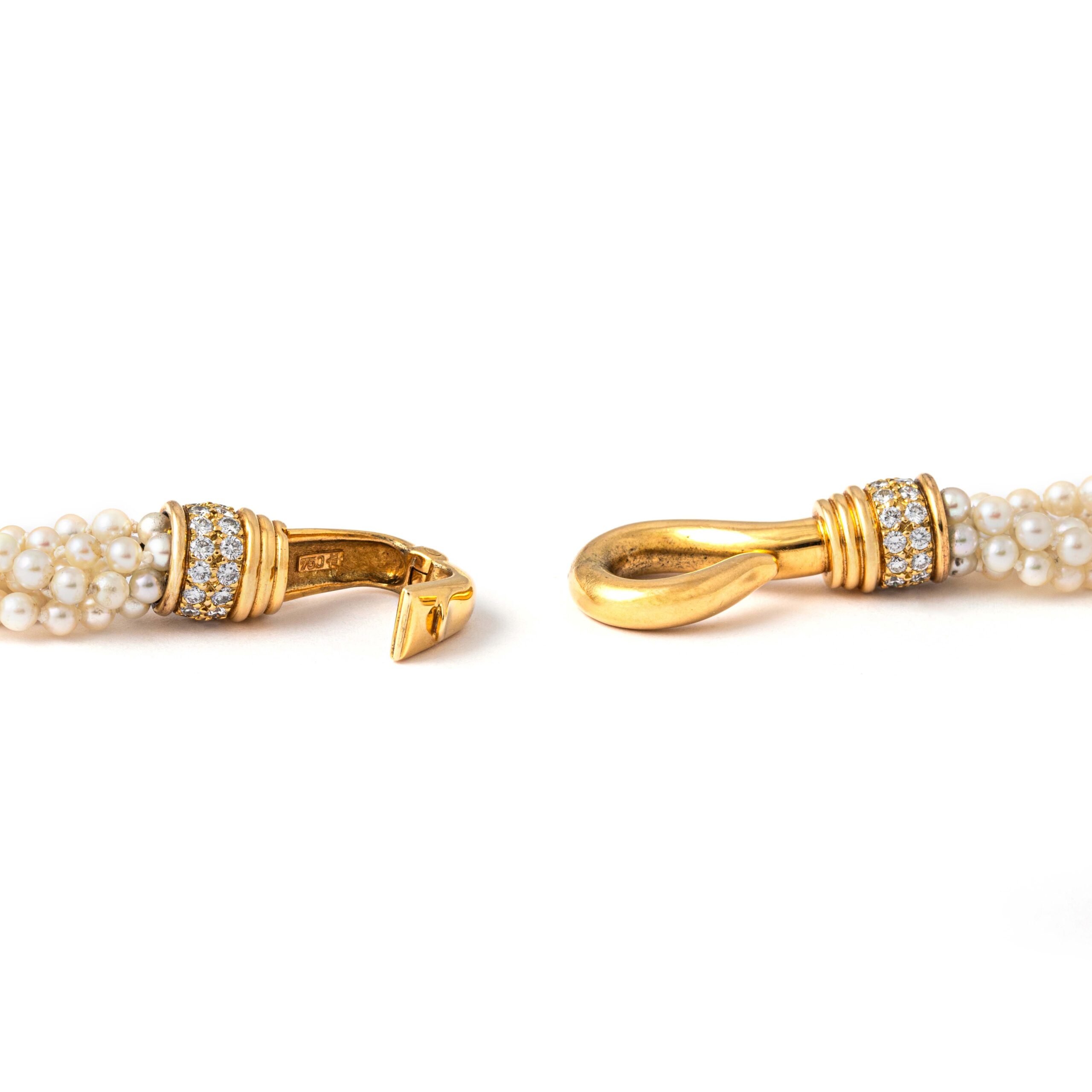 Cultured Pearl Necklace (6 strands of pearl) holding a Diamond Yellow Gold 18K clasp, set by 52 round cut diamonds H color and VS clarity. This statement piece boasts six strands of luminous cultured pearls, meticulously arranged to create a necklace that exudes opulence and sophistication.