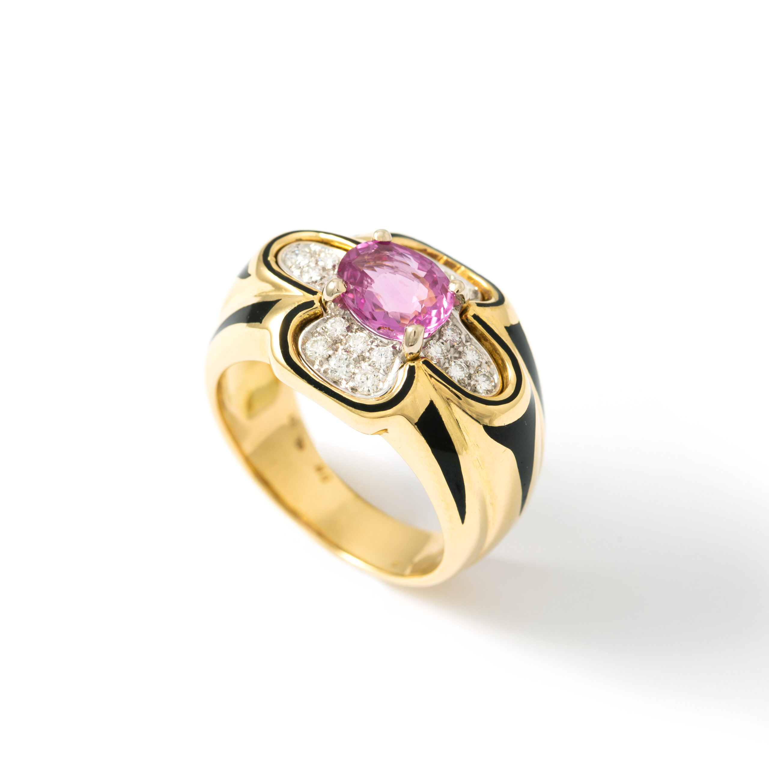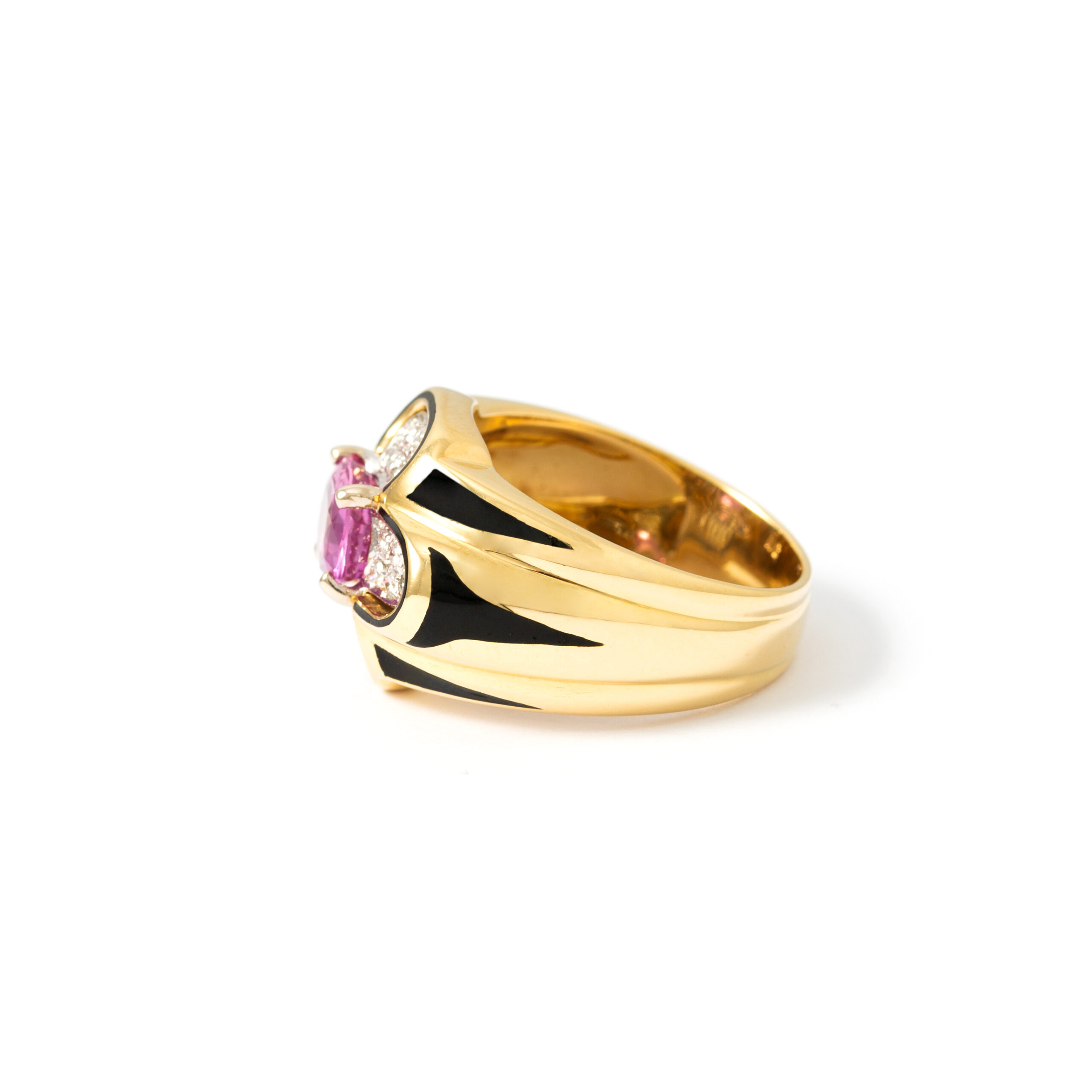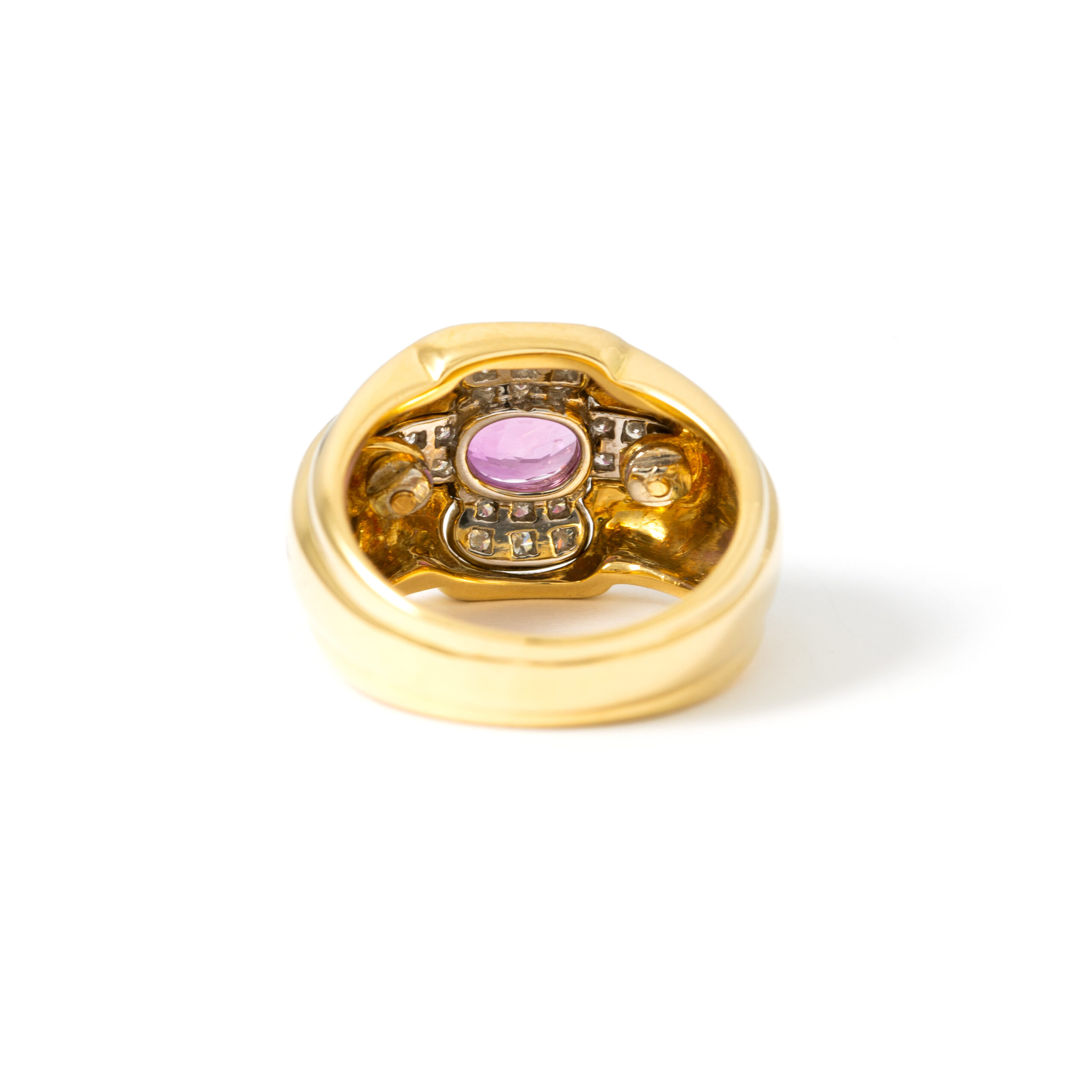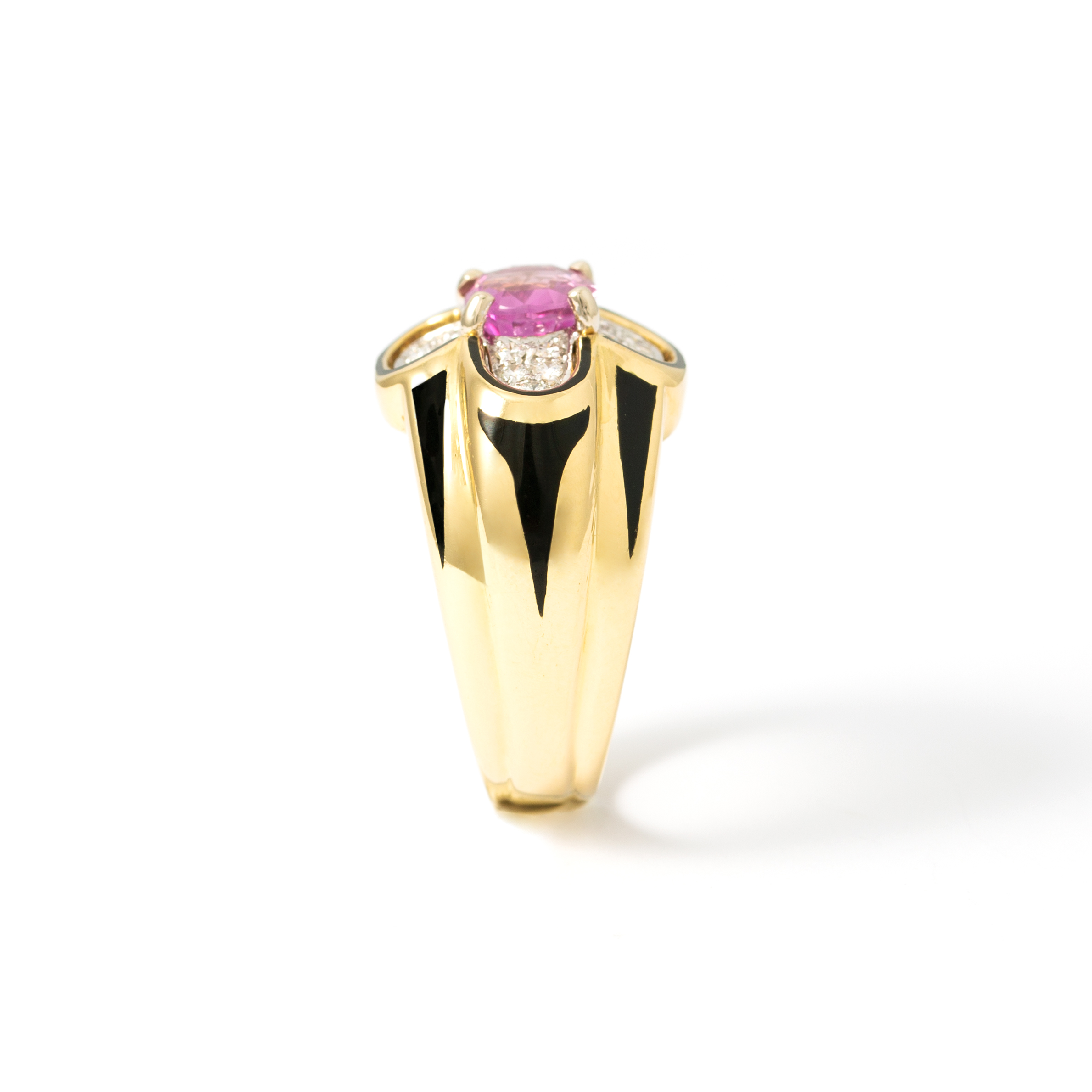 Ring in 18kt yellow gold set with one pink oval cut sapphire 1.40 cts and 22 diamonds 0.24 cts