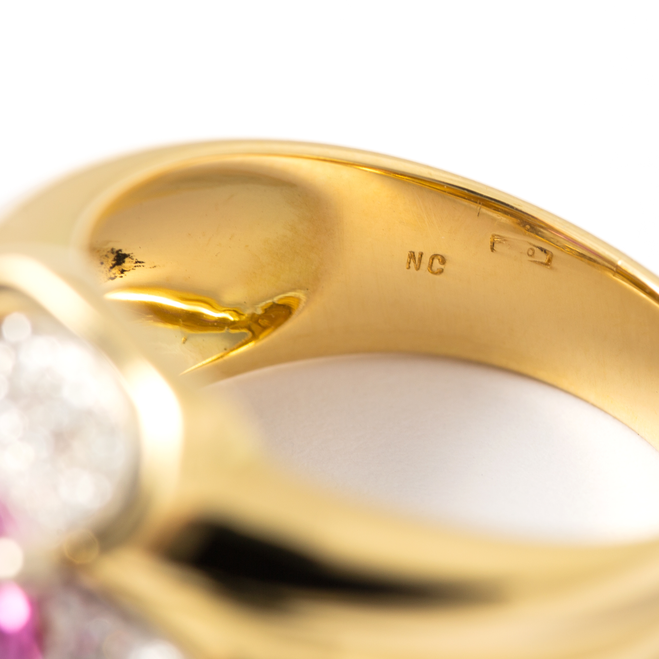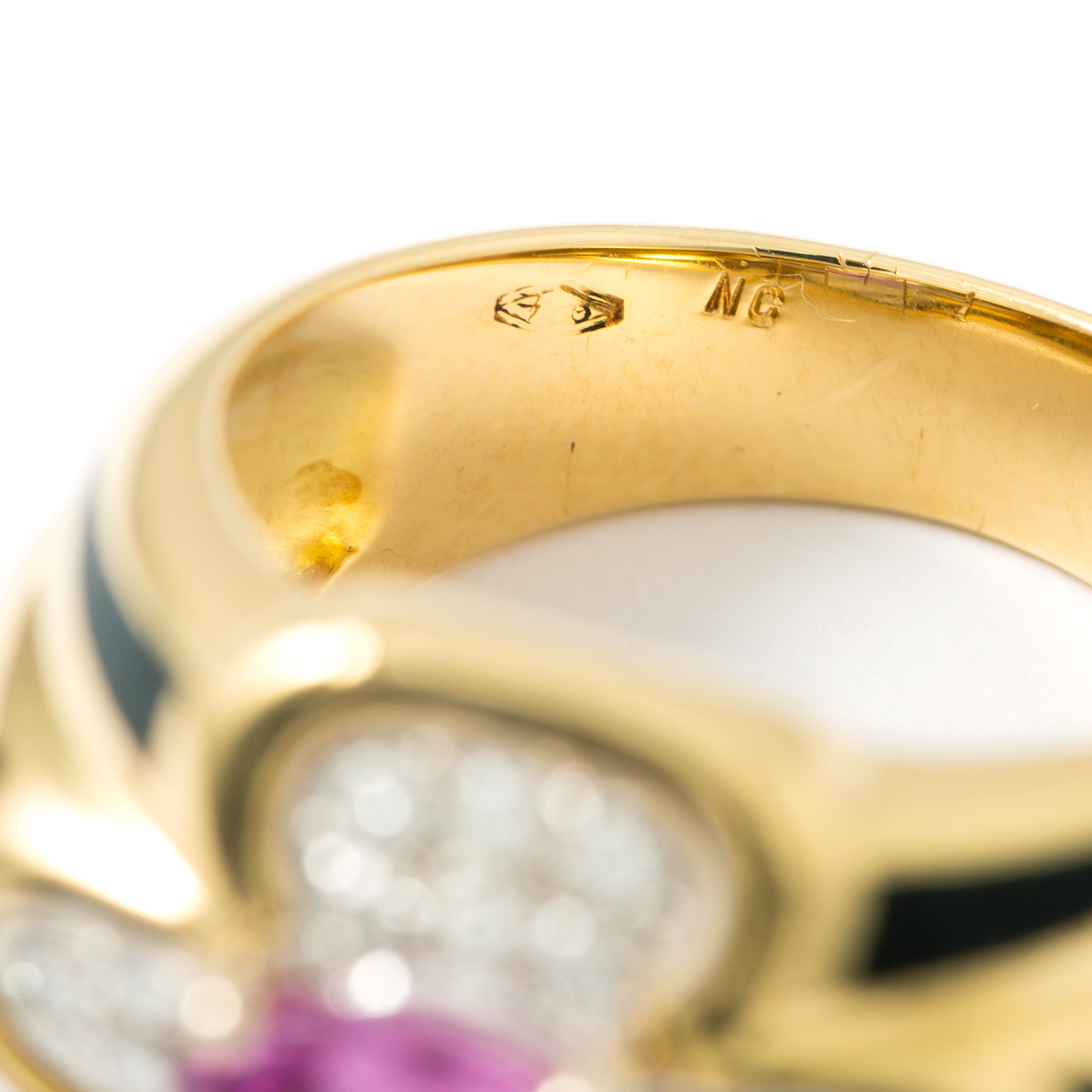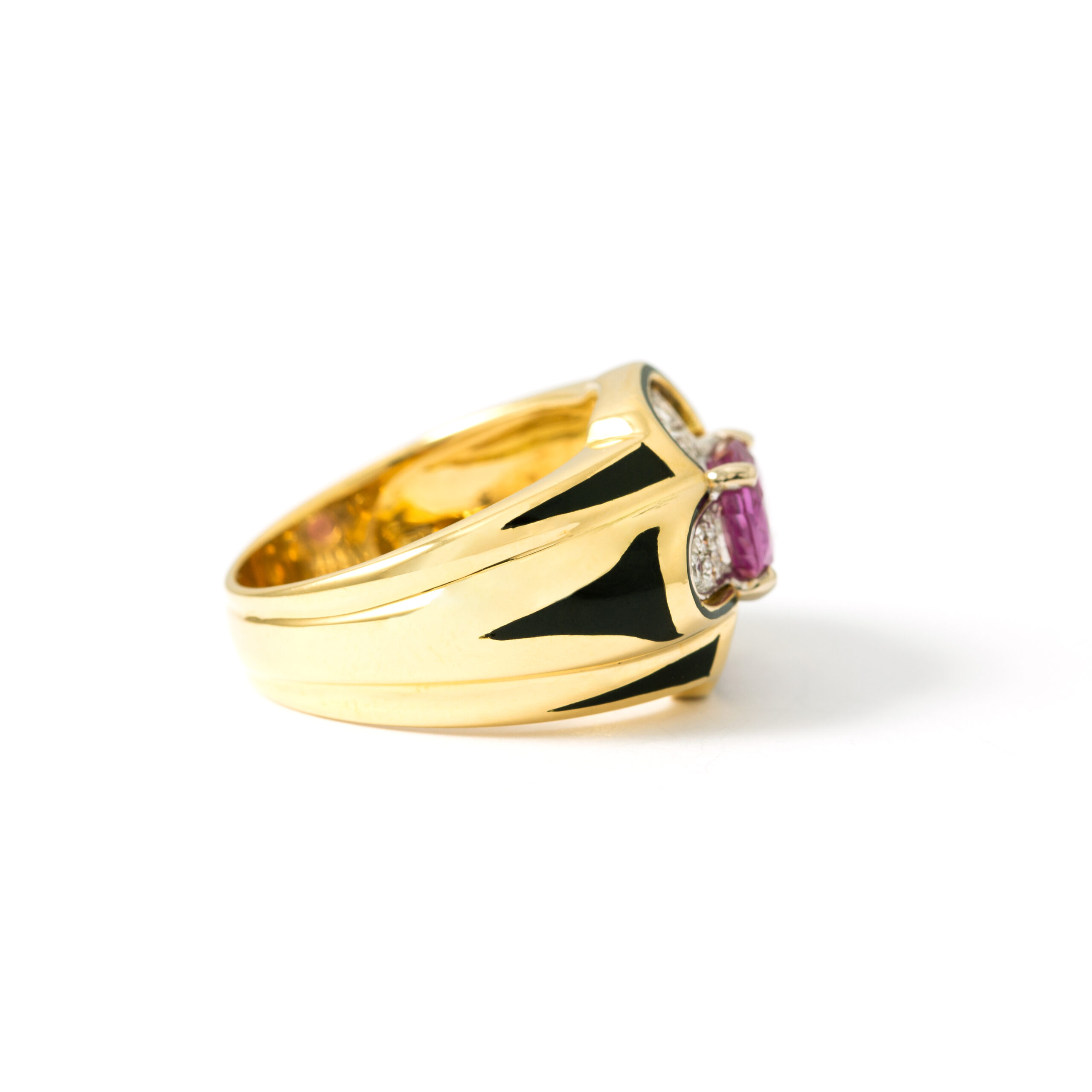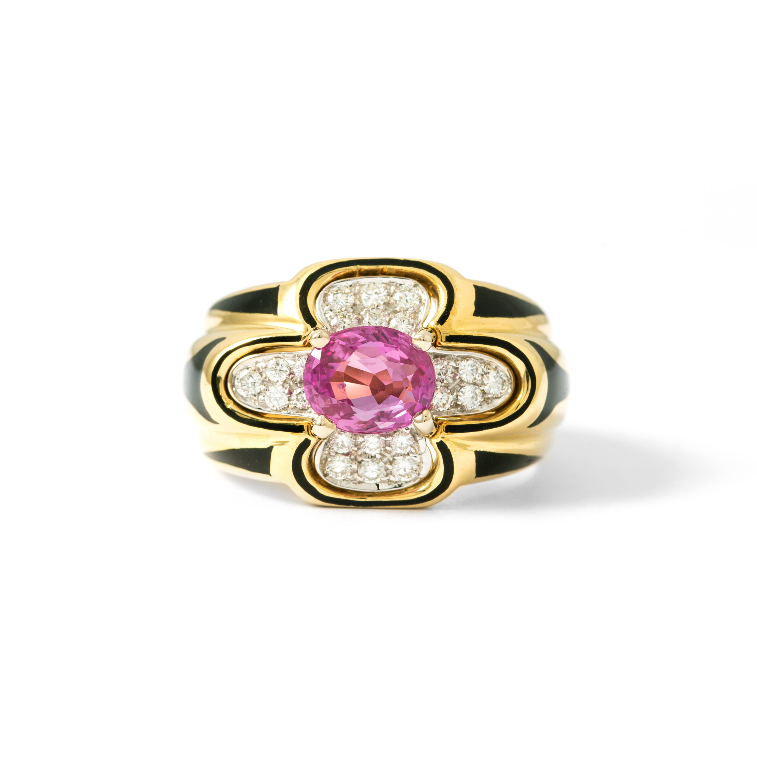 Ring in 18kt yellow gold set with one pink oval cut sapphire 1.40 cts and 22 diamonds 0.24 cts