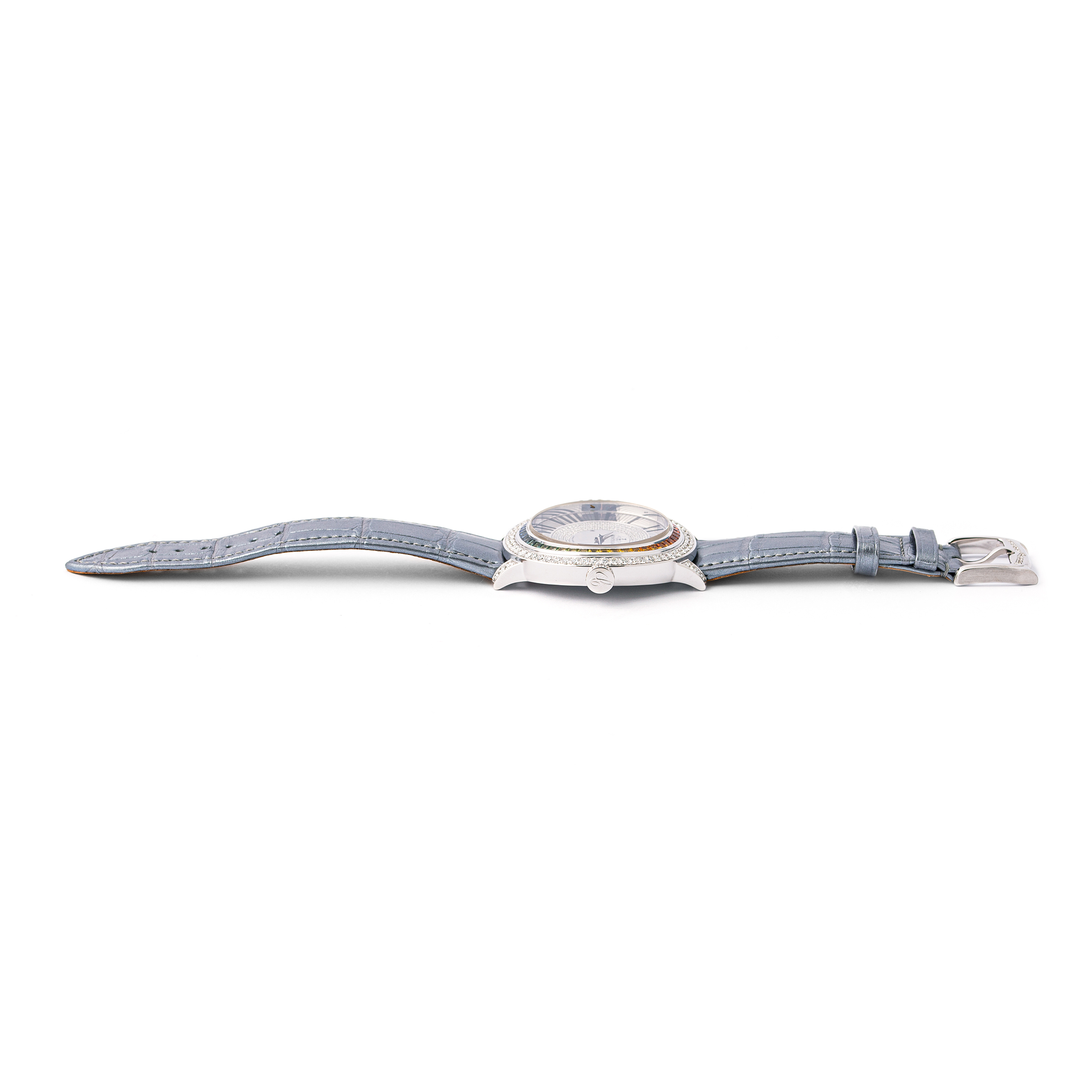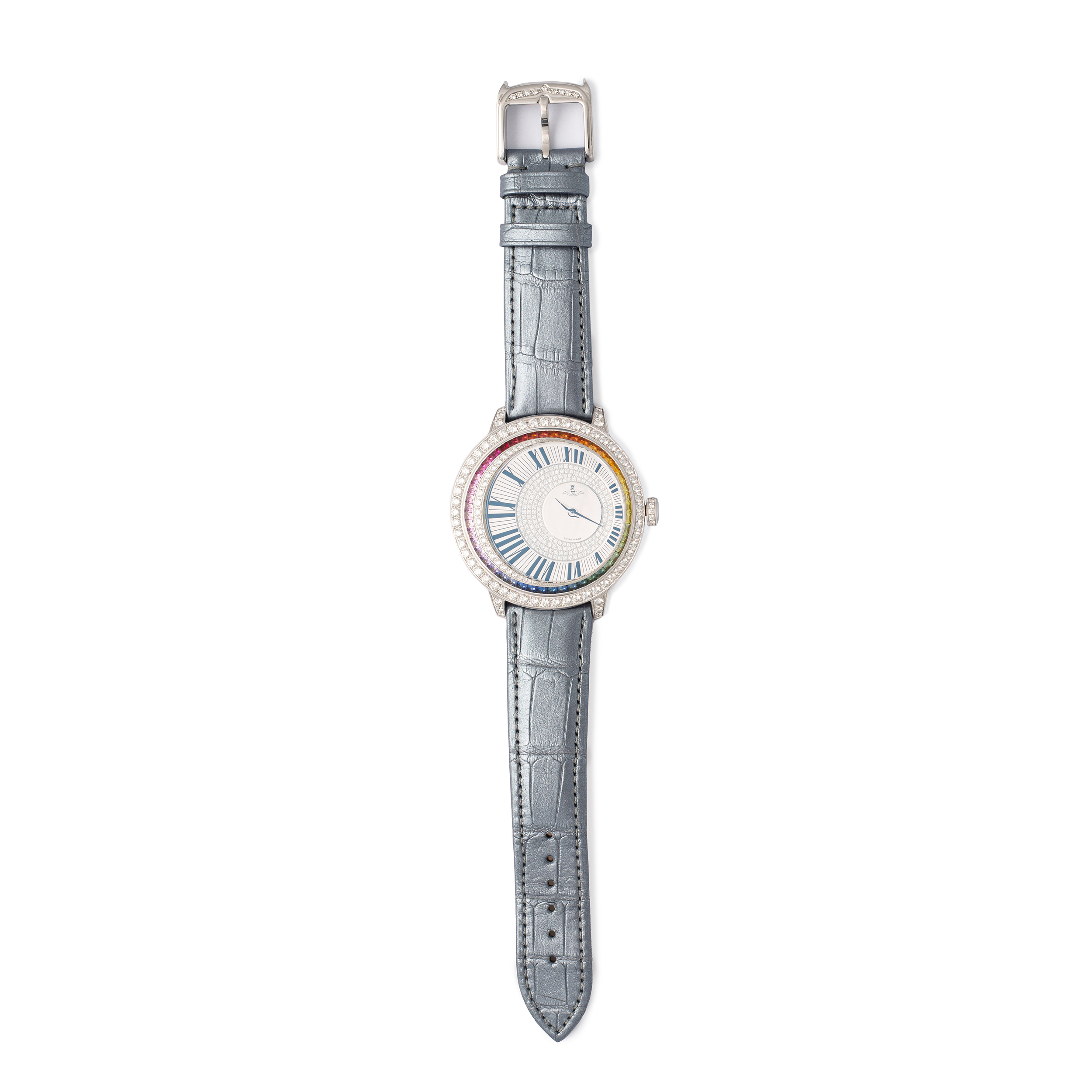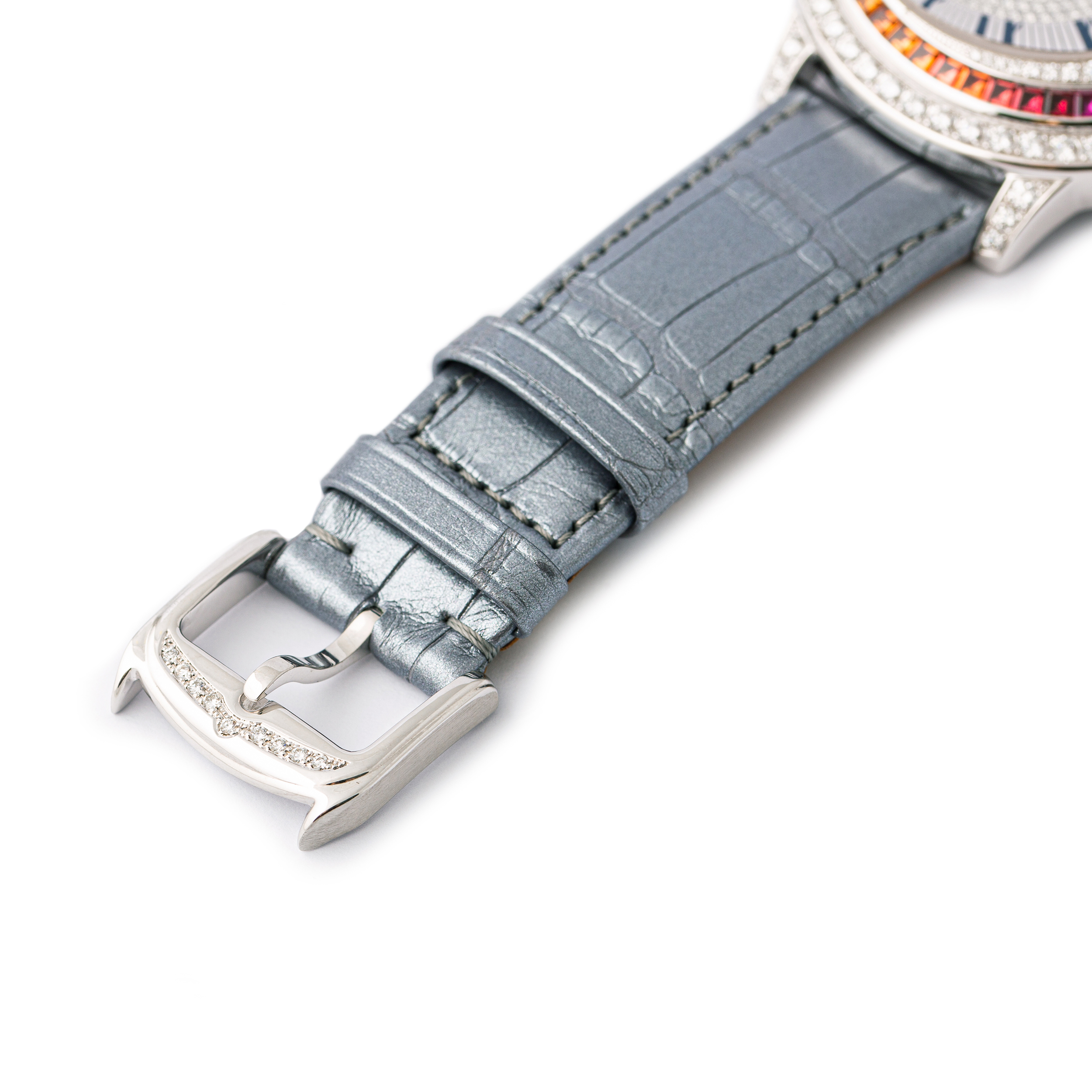 The combination of the lustrous white gold, the captivating rainbow sapphires, and the scintillating diamonds make this watch a truly captivating accessory that effortlessly elevates any ensemble. With its exquisite design and impeccable craftsmanship, this watch is a testament to a refined taste and an appreciation for the finer things in life.